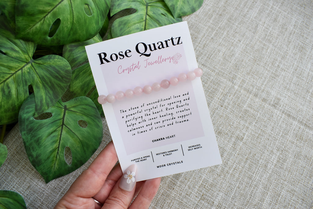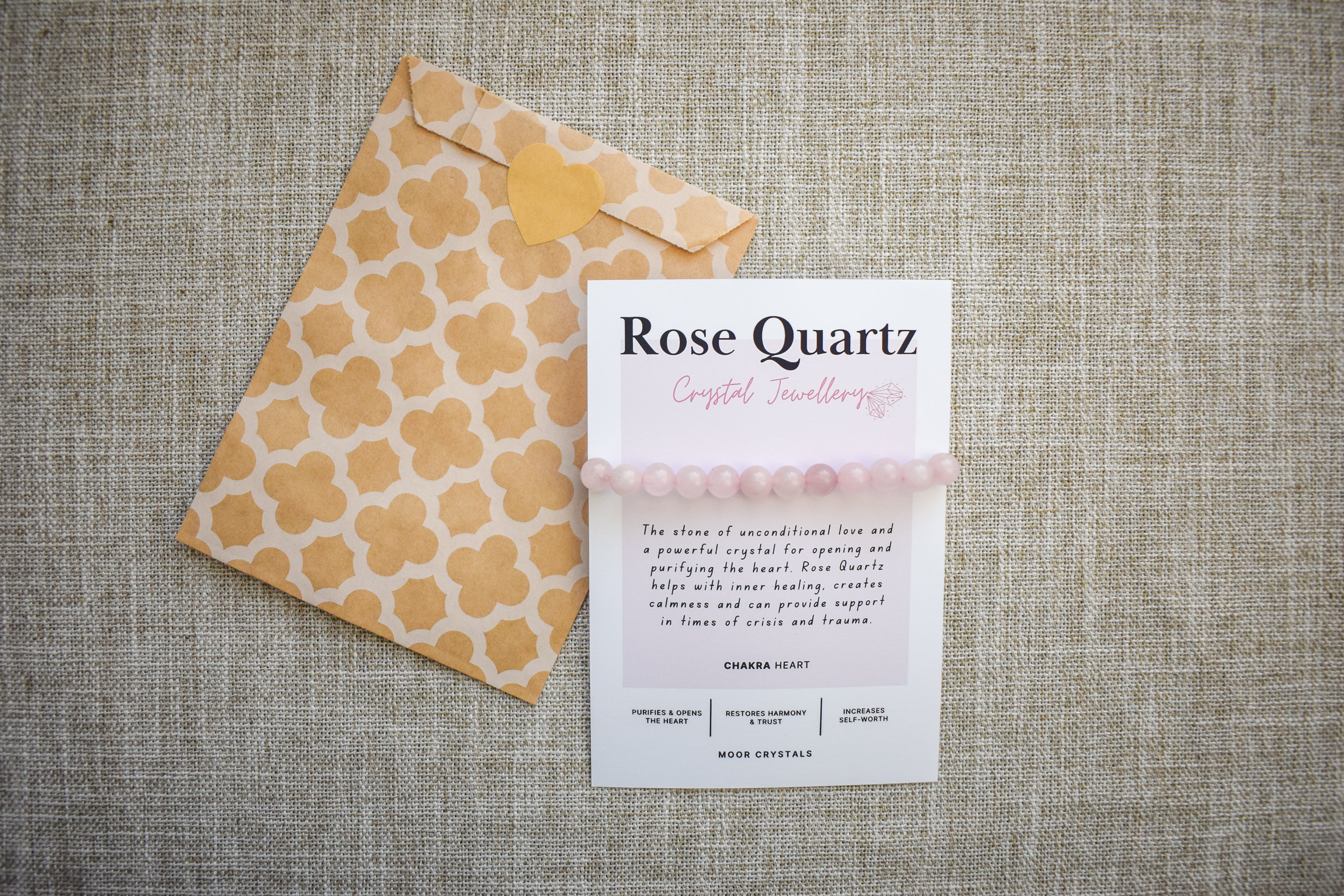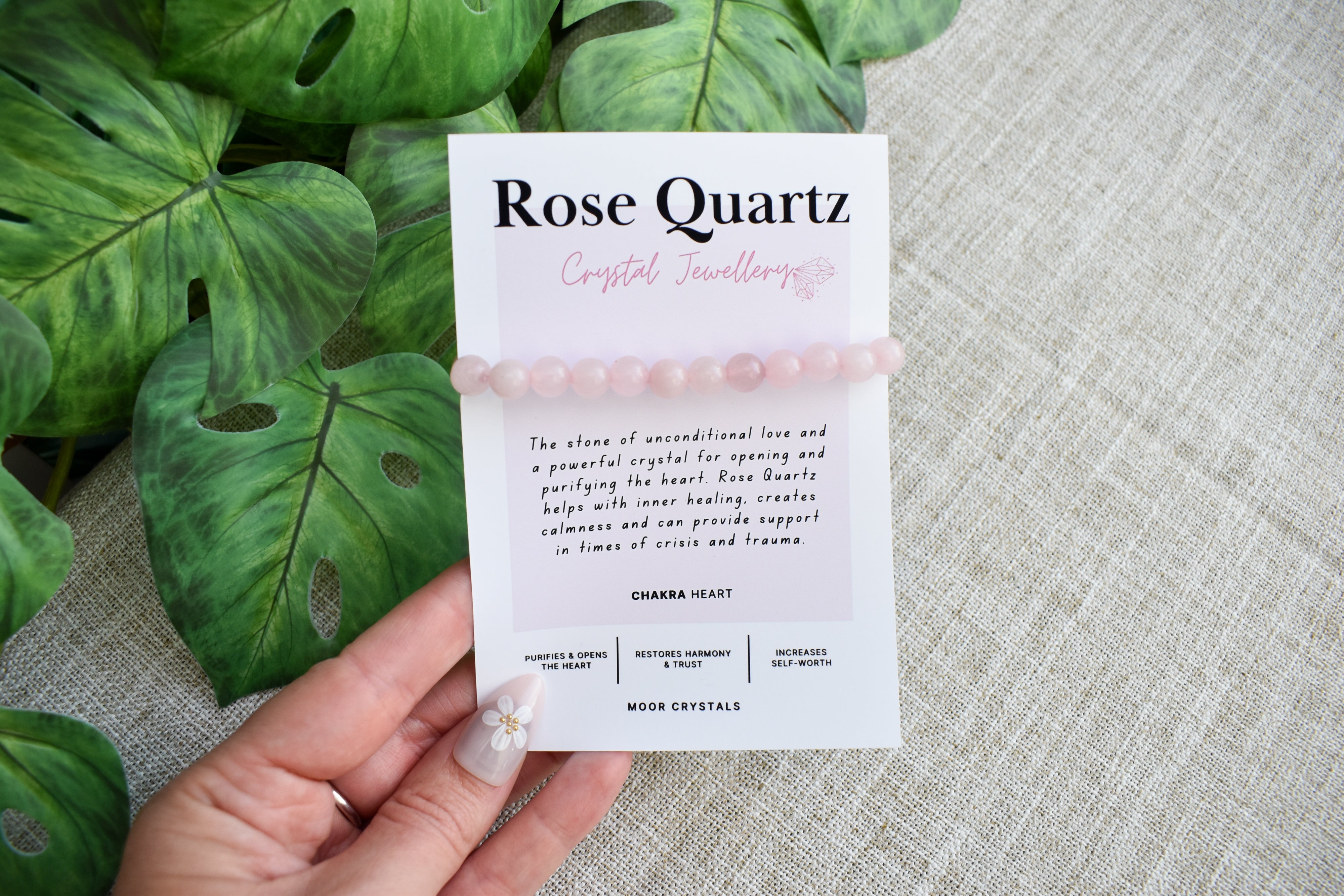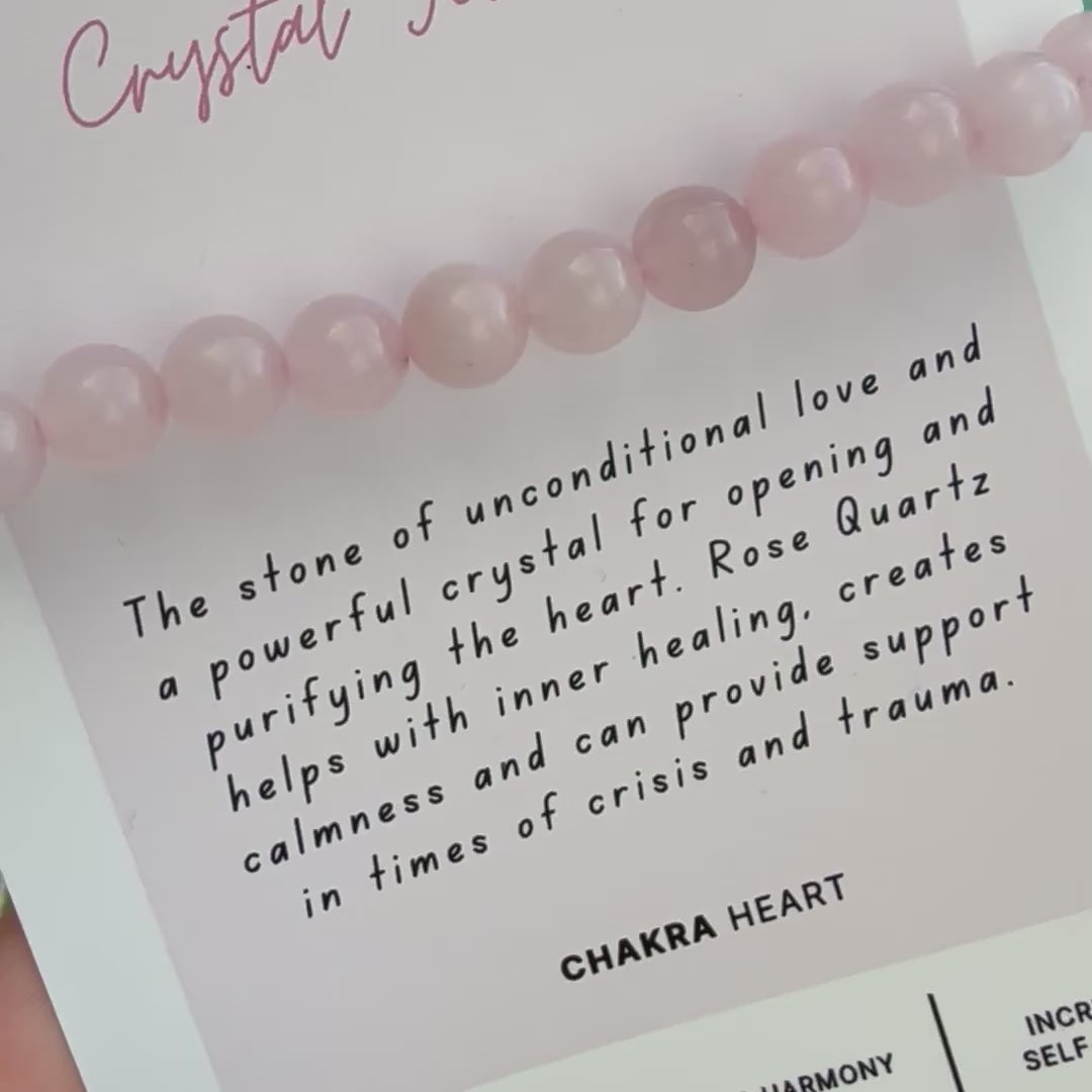 This listing is for a single Rose Quartz bead bracelet. Made from 8mm crystal beads and stretch cord, presented on a crystal description card.