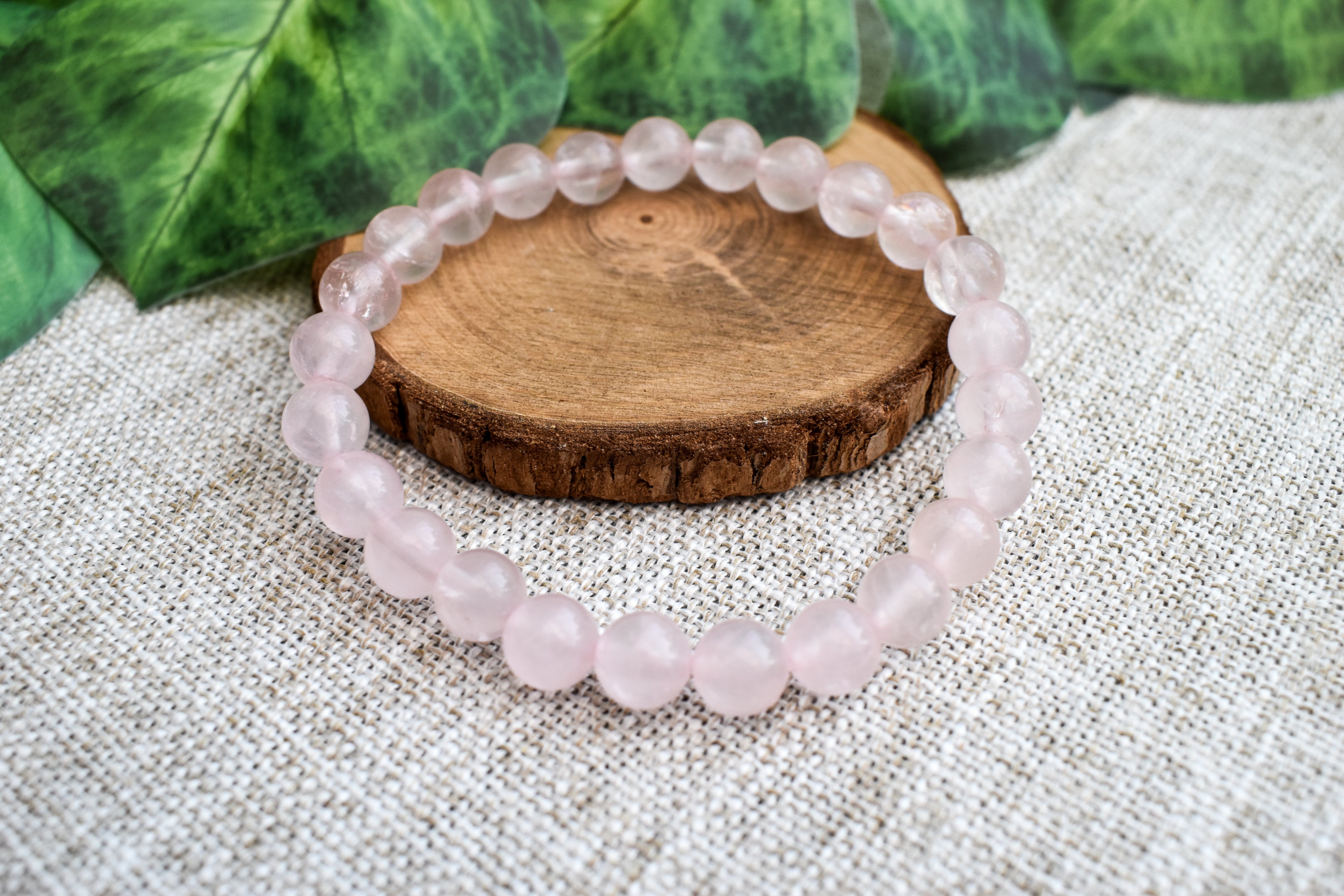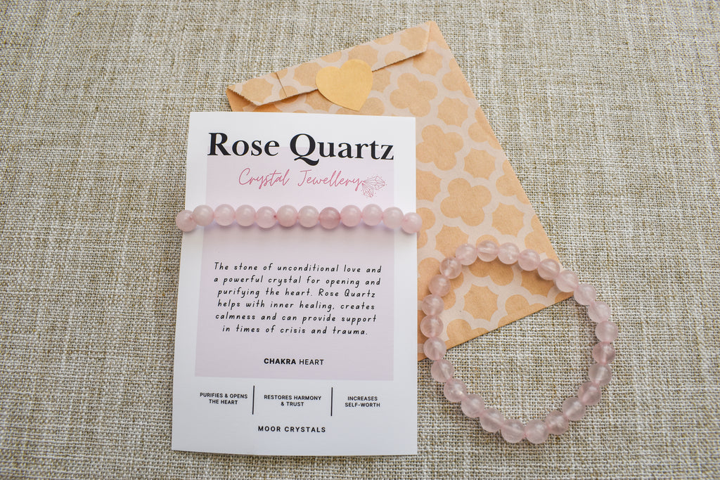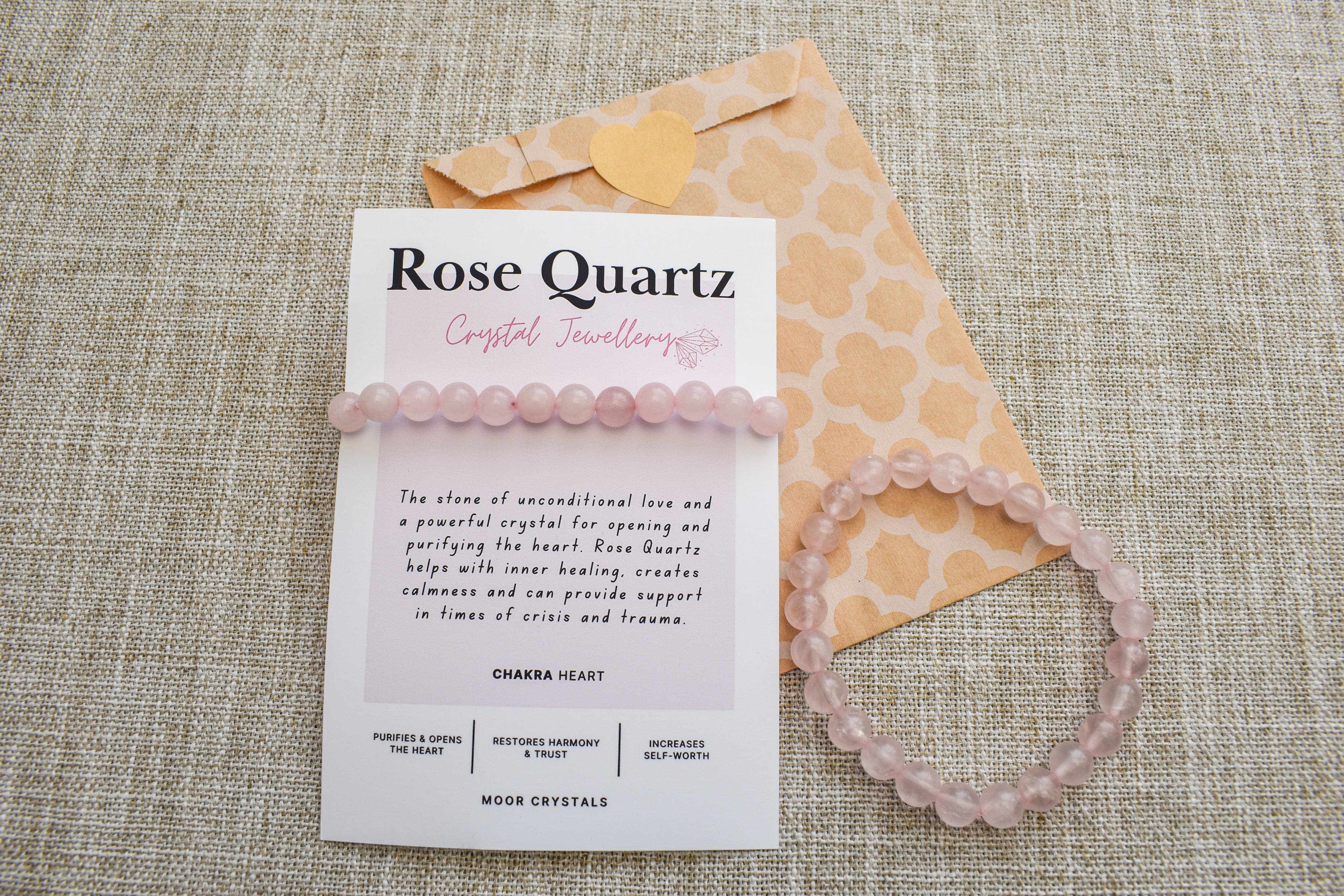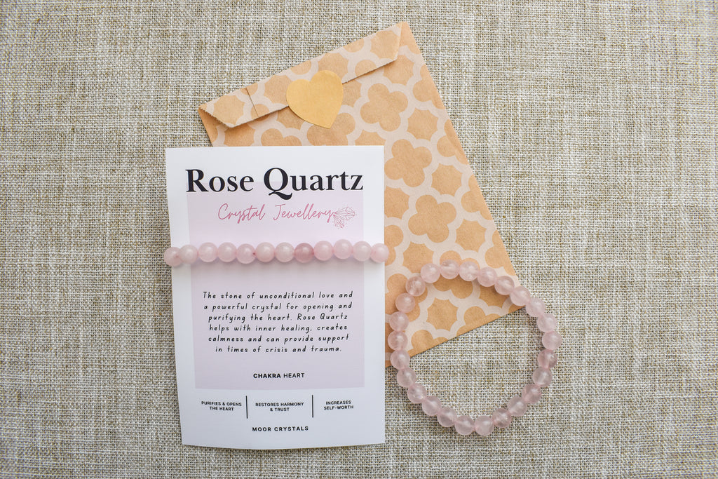 This listing is for a single Rose Quartz bead bracelet. Made from 8mm crystal beads and stretch cord, presented on a crystal description card.