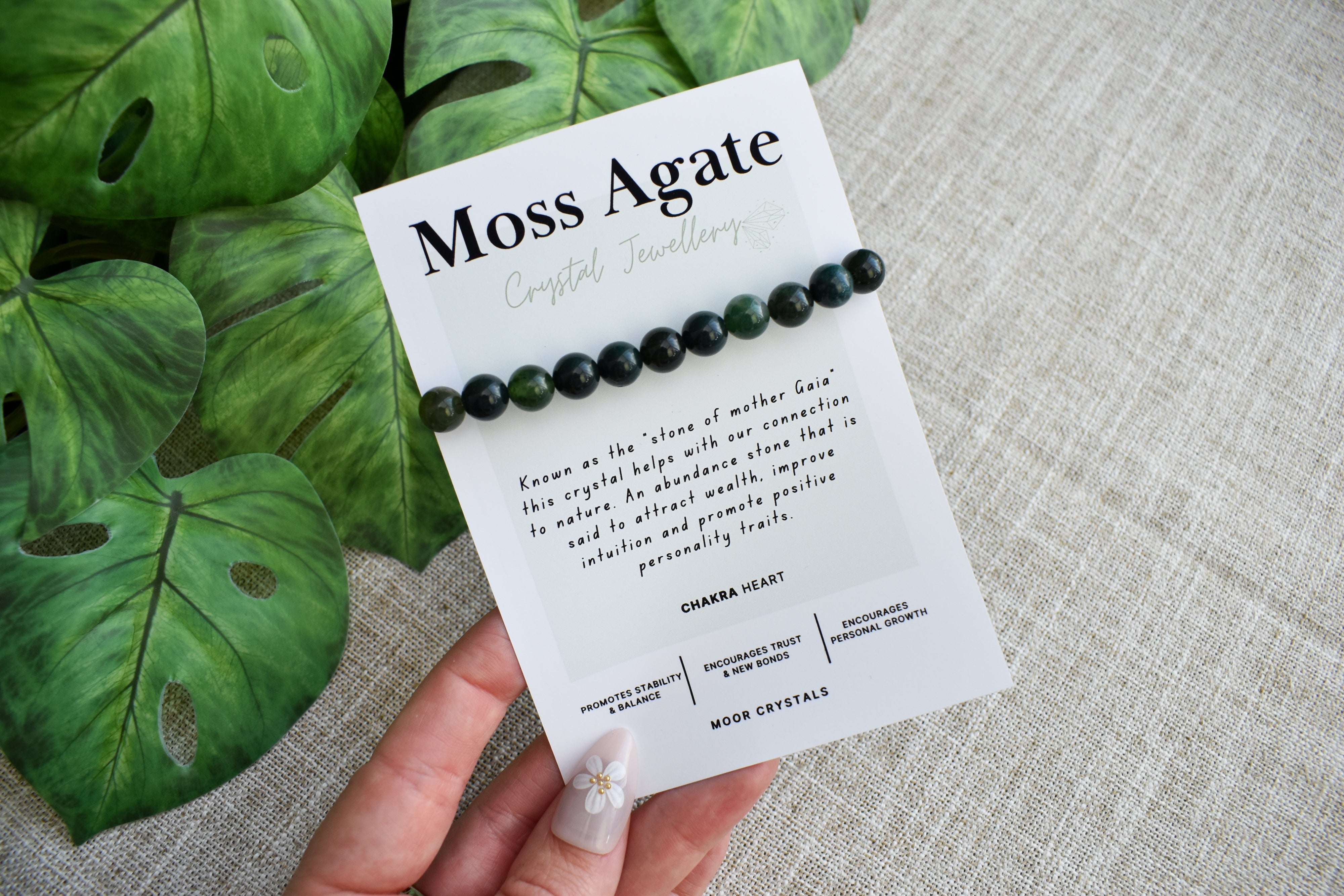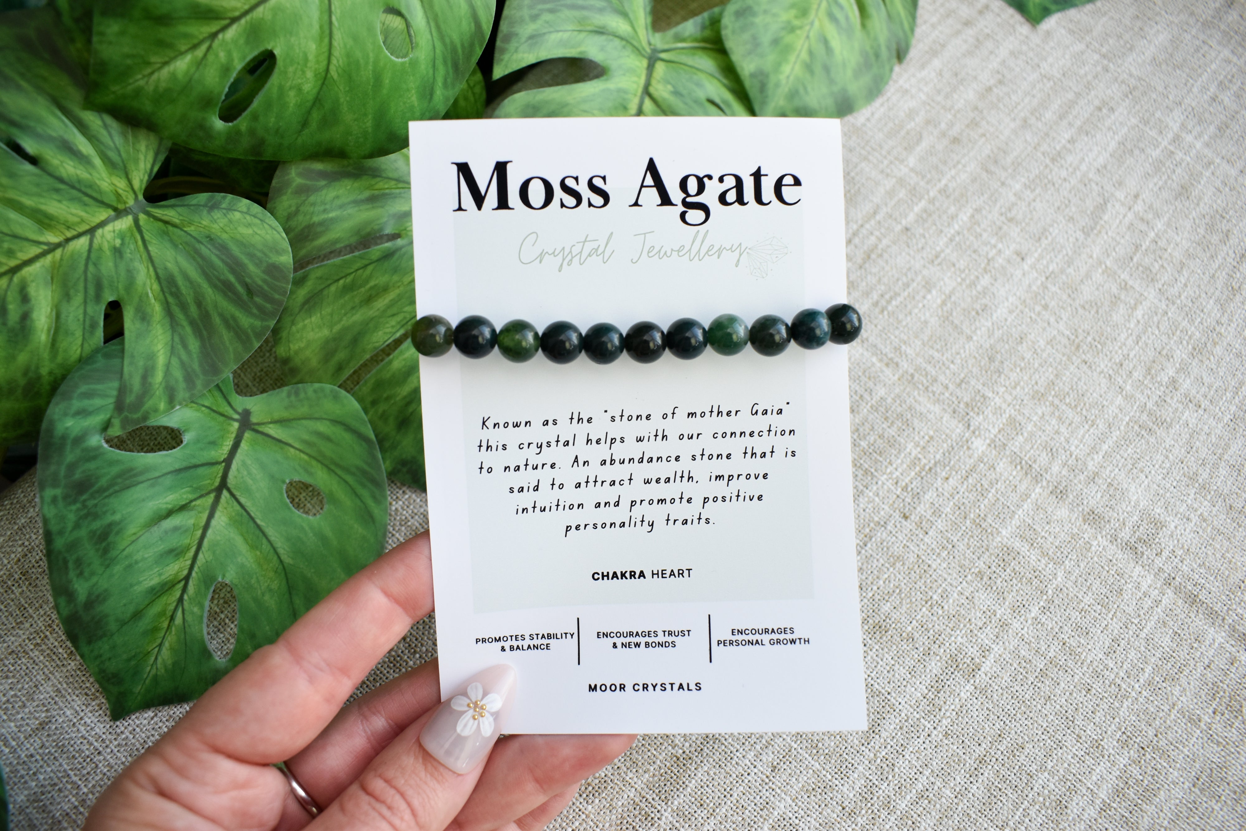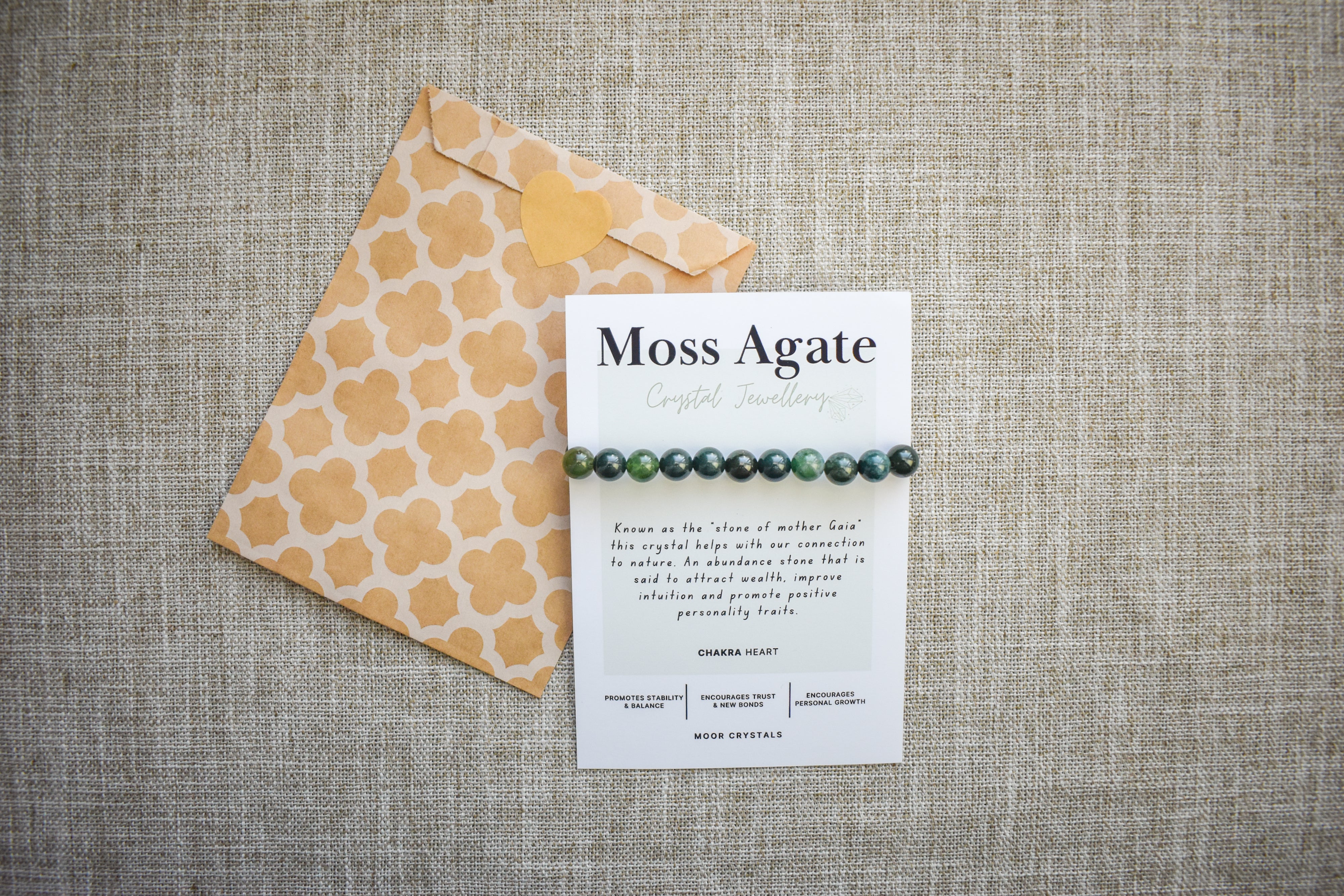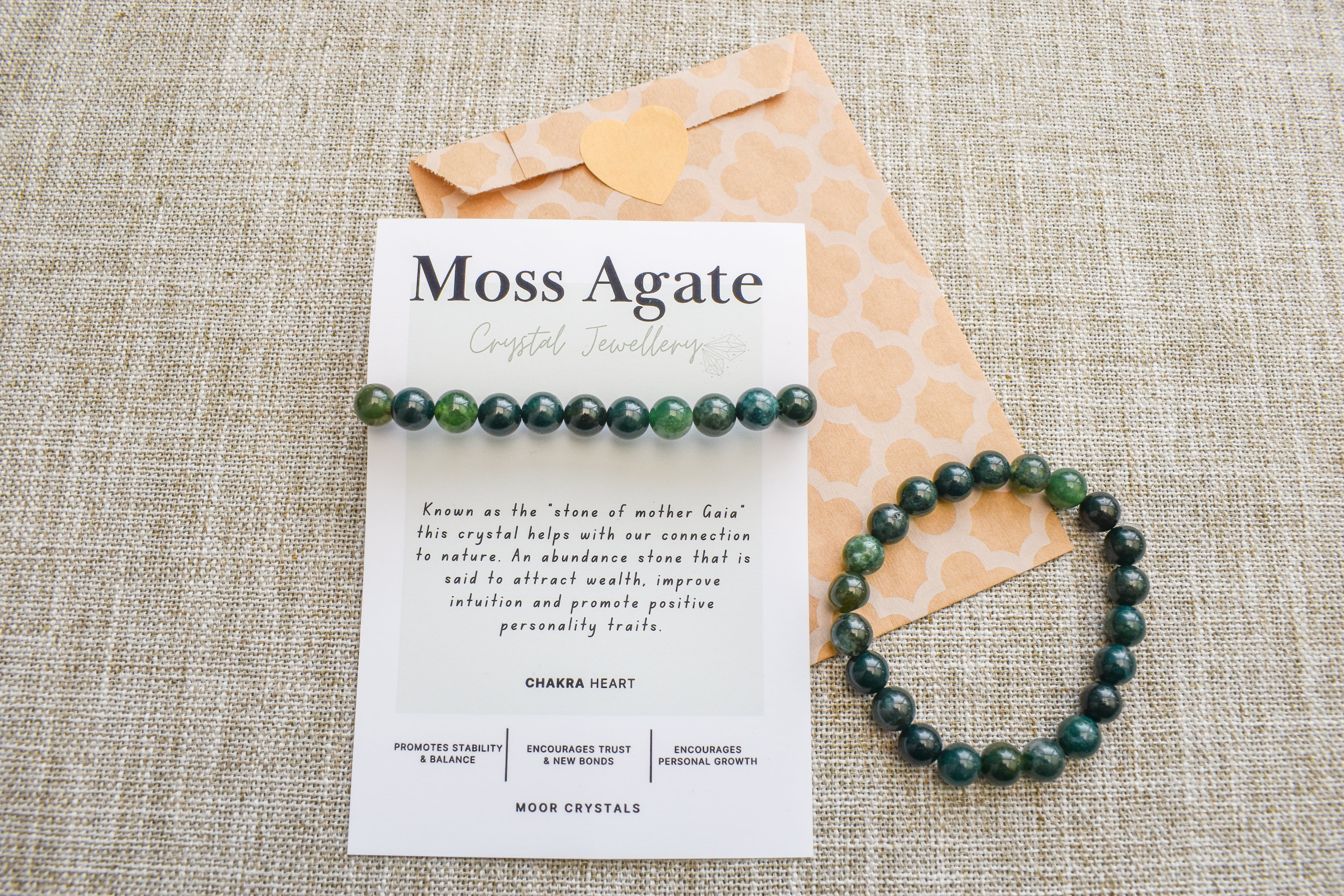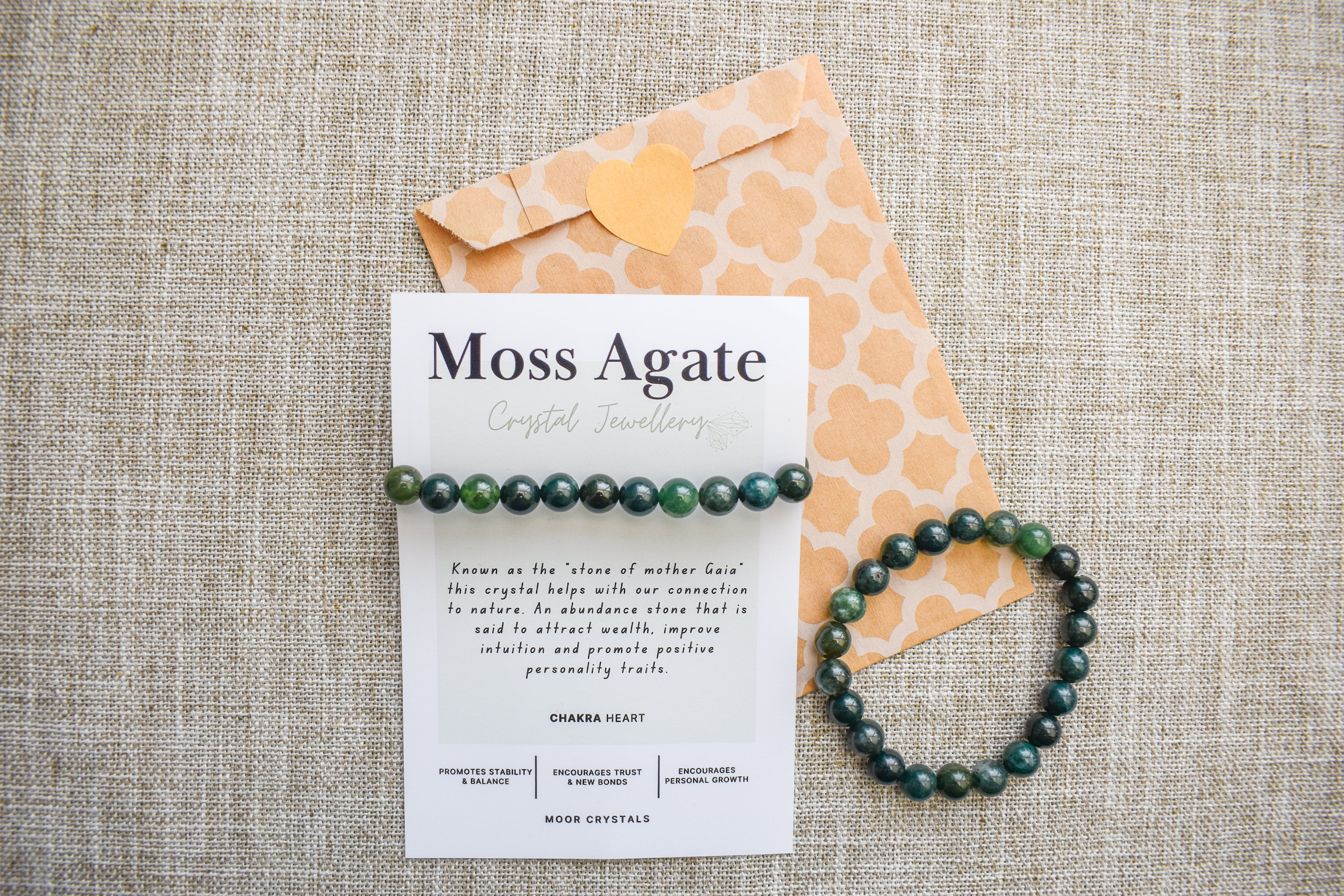 Green Moss Agate crystal bead bracelet, beautifully presented on a crystal description card.
