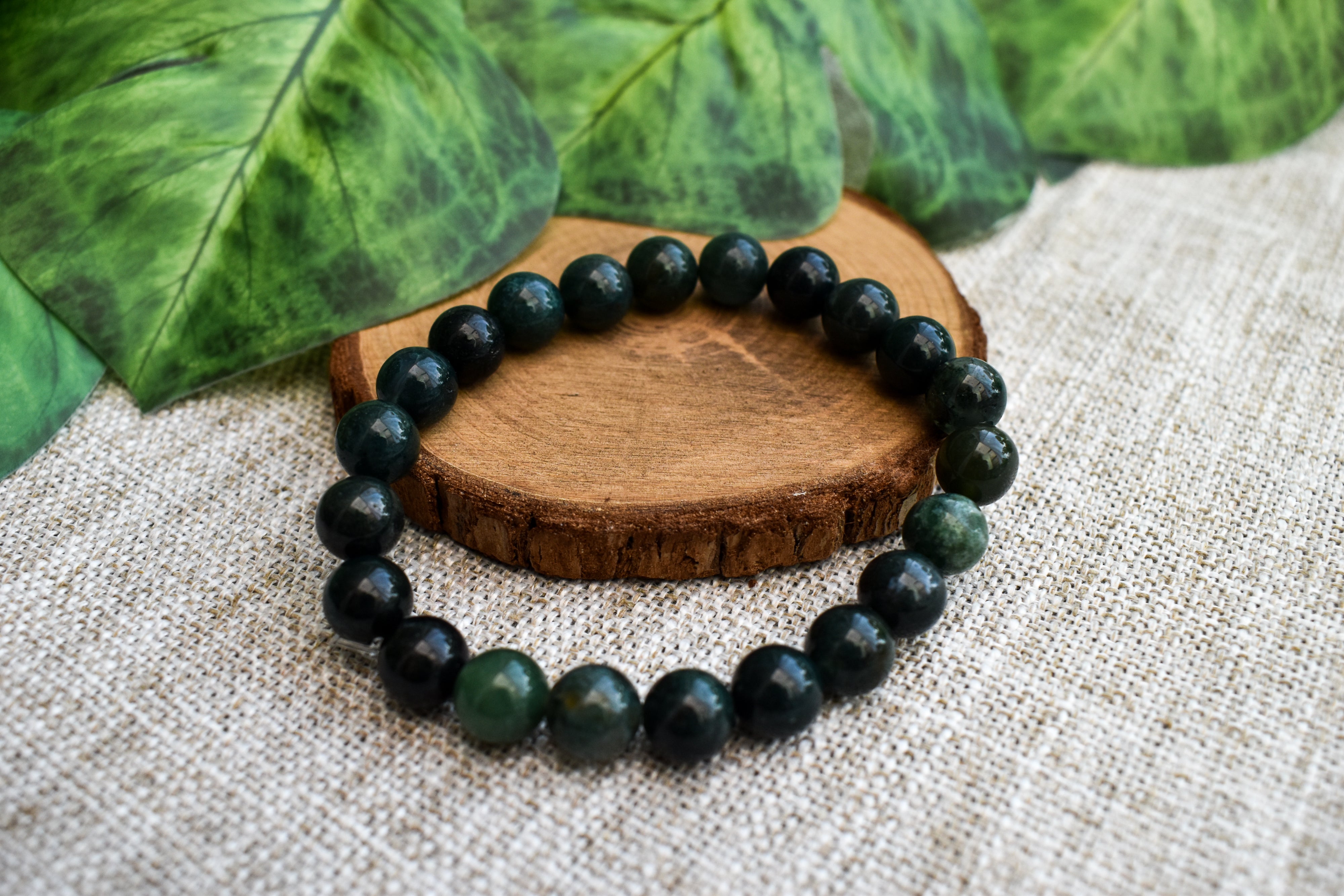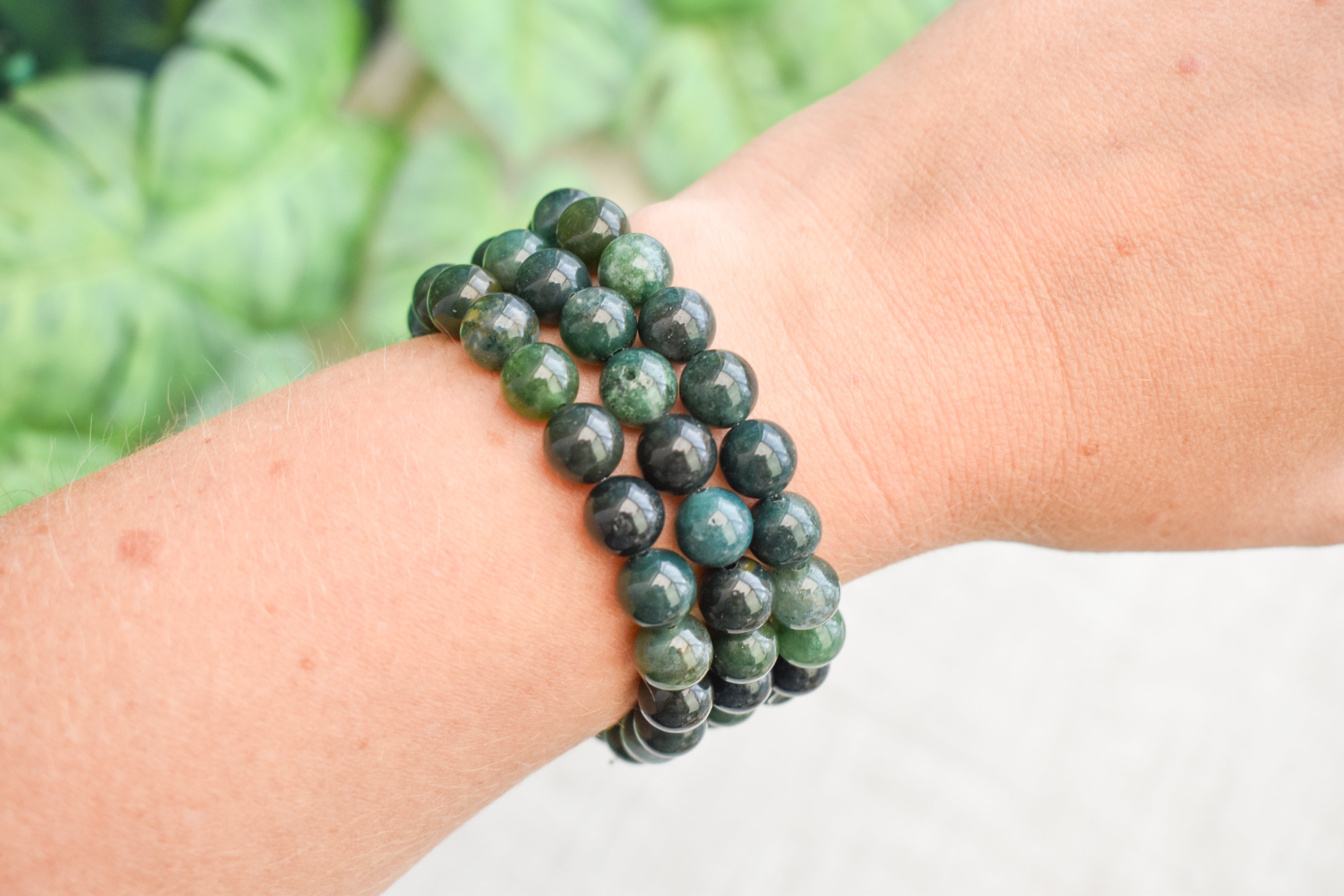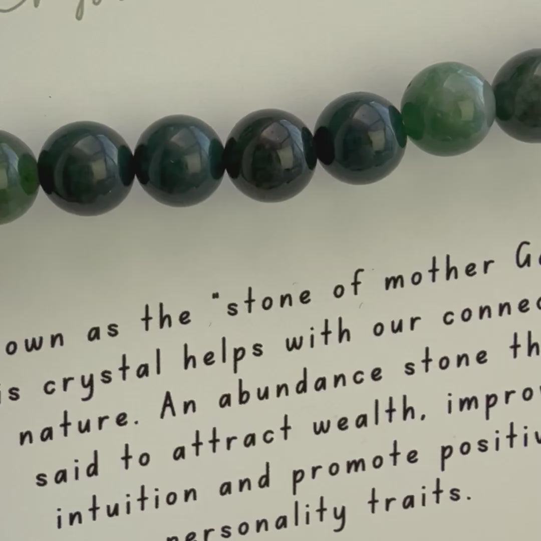 This listing is for a single Green Moss Agate bead bracelet. Made from 8mm natural crystal beads and stretch cord, presented on a crystal description card.