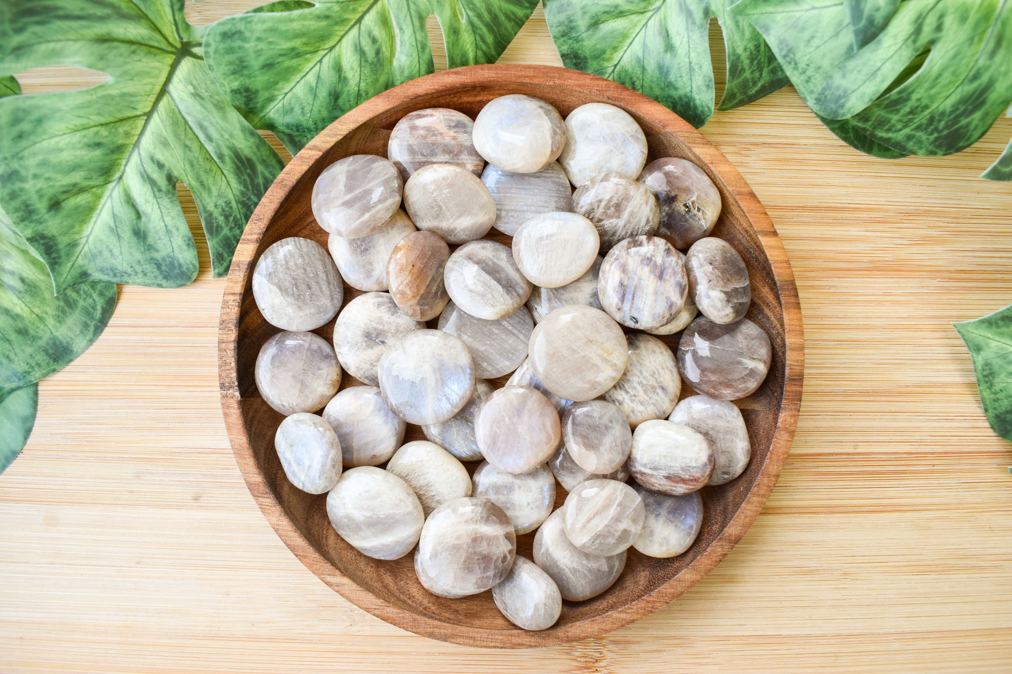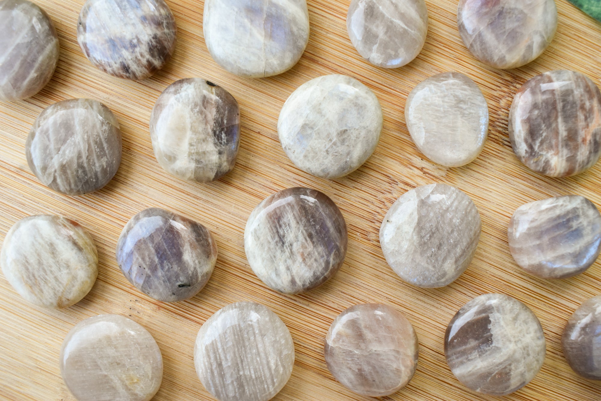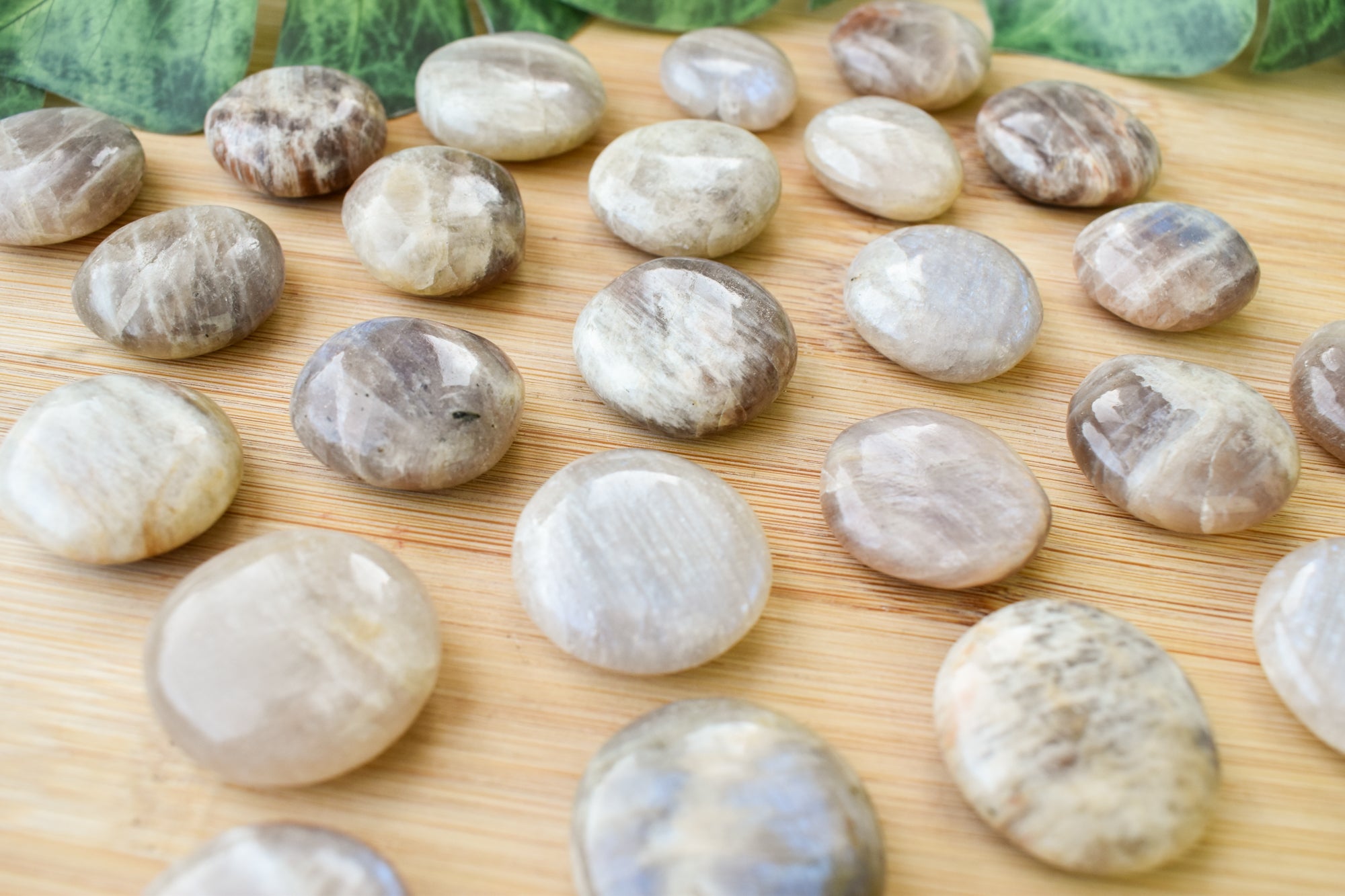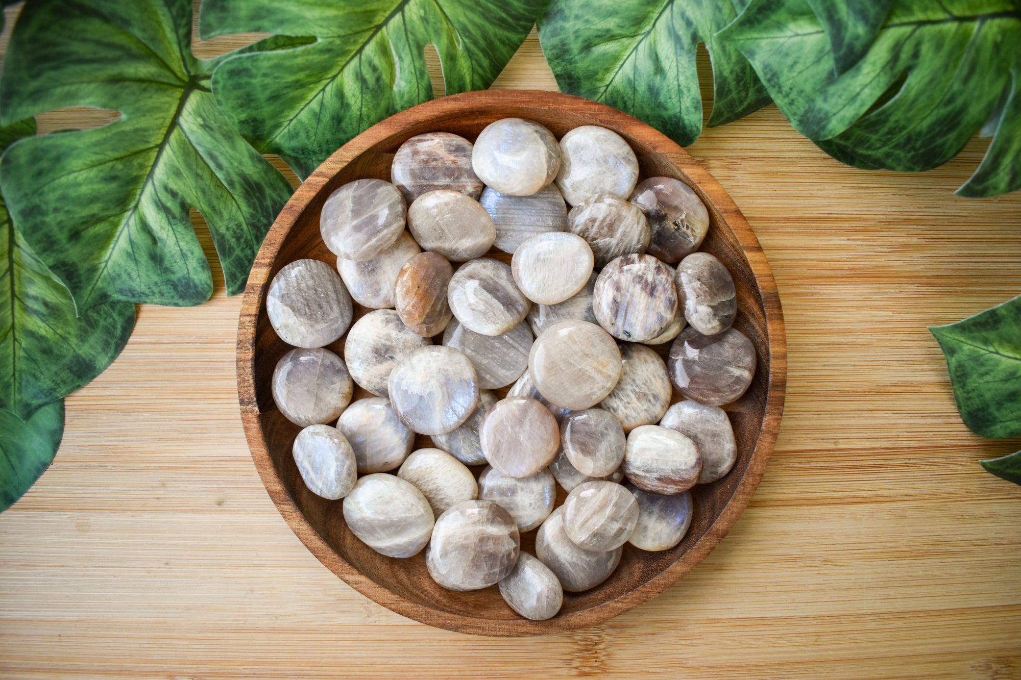 These are radiant Sunstone and Moonstone flat stones, featuring warm, glittering flashes of coppery gold paired with soft pearly sheens and gentle iridescence. Each piece is smoothly polished into a comforting flat stone, perfect for holding in the palm, carrying with you, or placing in your sacred space. Completely unique, every stone showcases a beautiful balance of Sunstone’s sparkling warmth and Moonstone’s luminous glow. Ideal for your collection, altar, bedside table, or as a meaningful gift filled with balanced, uplifting energy.