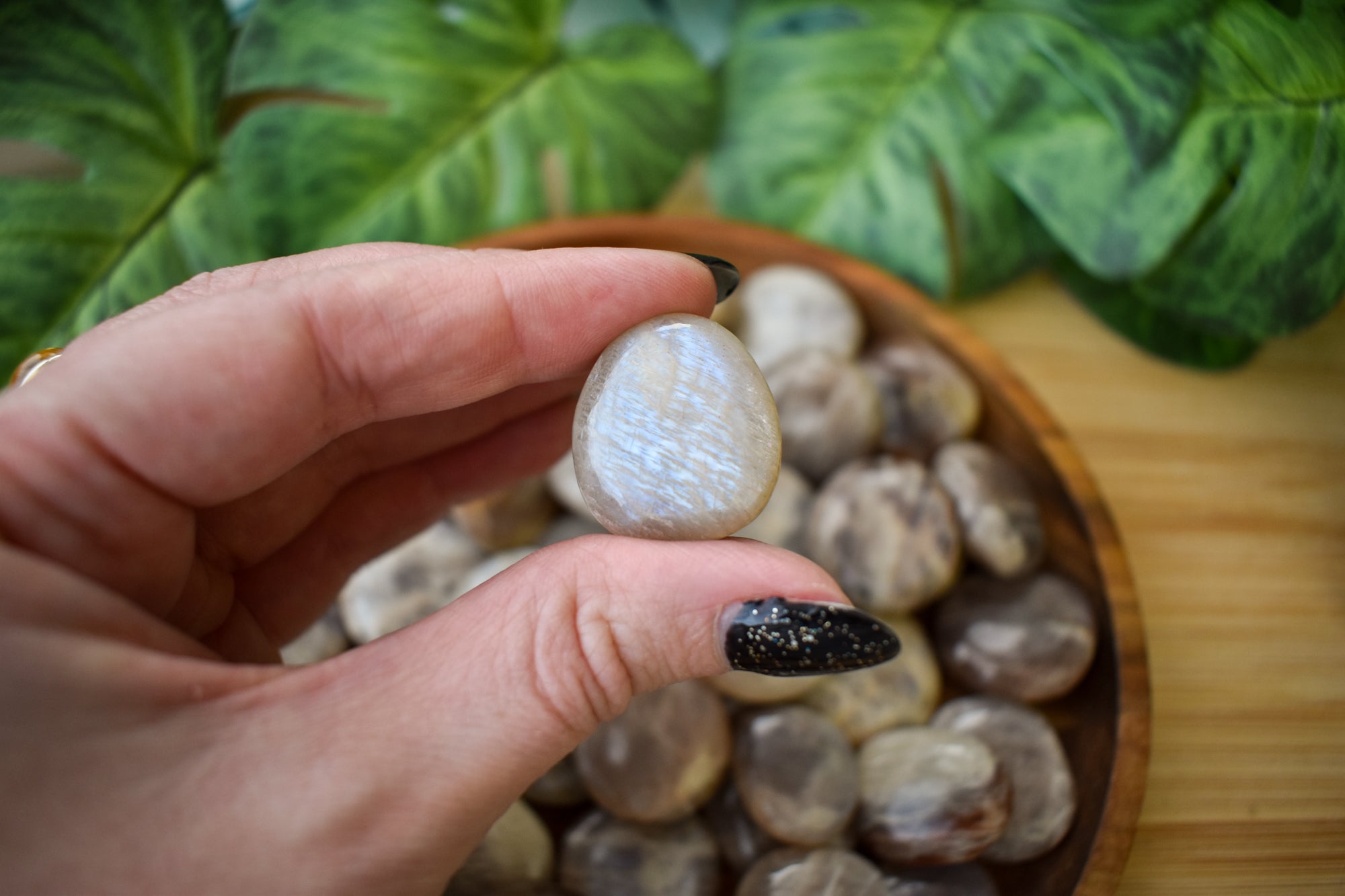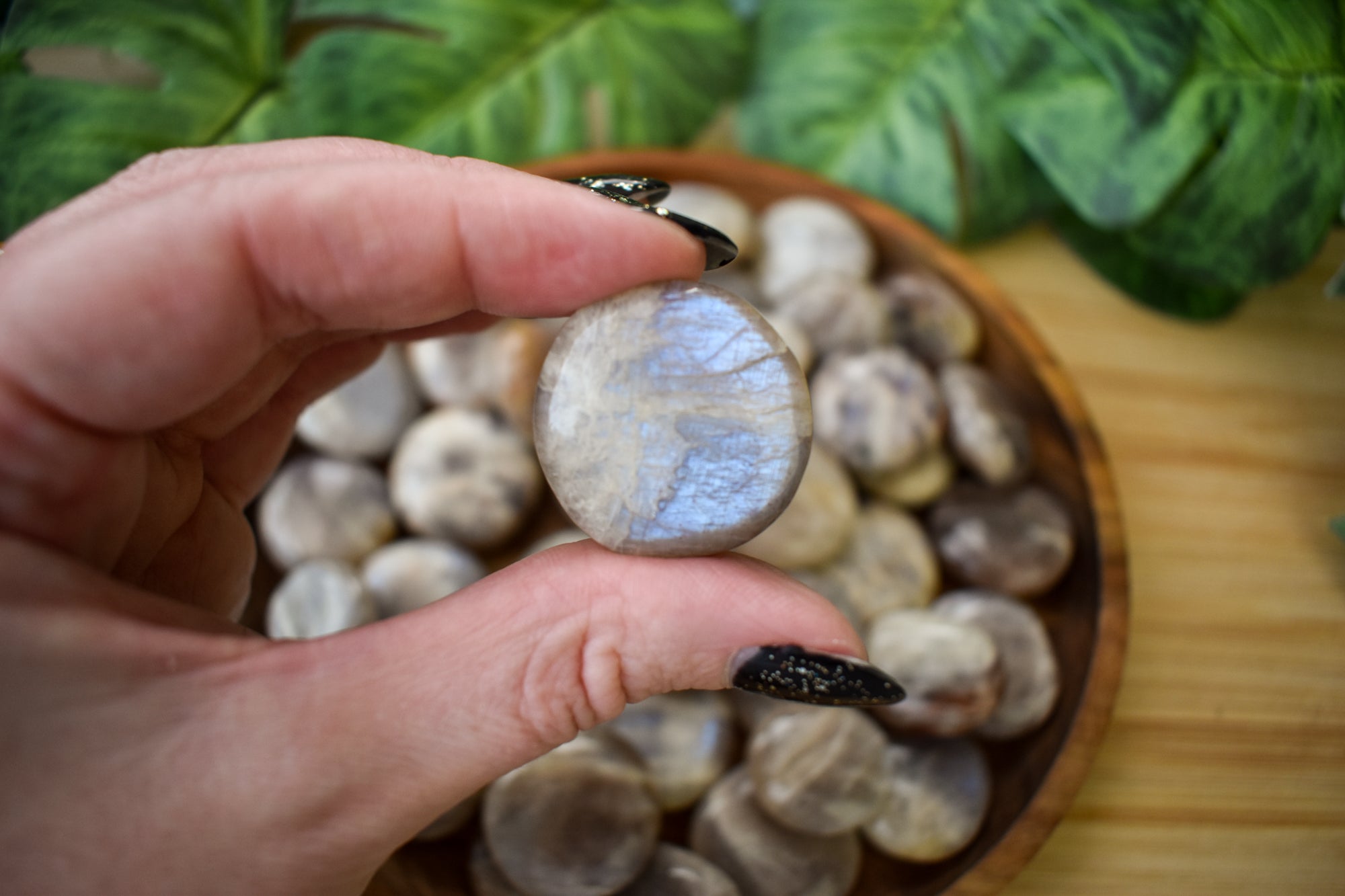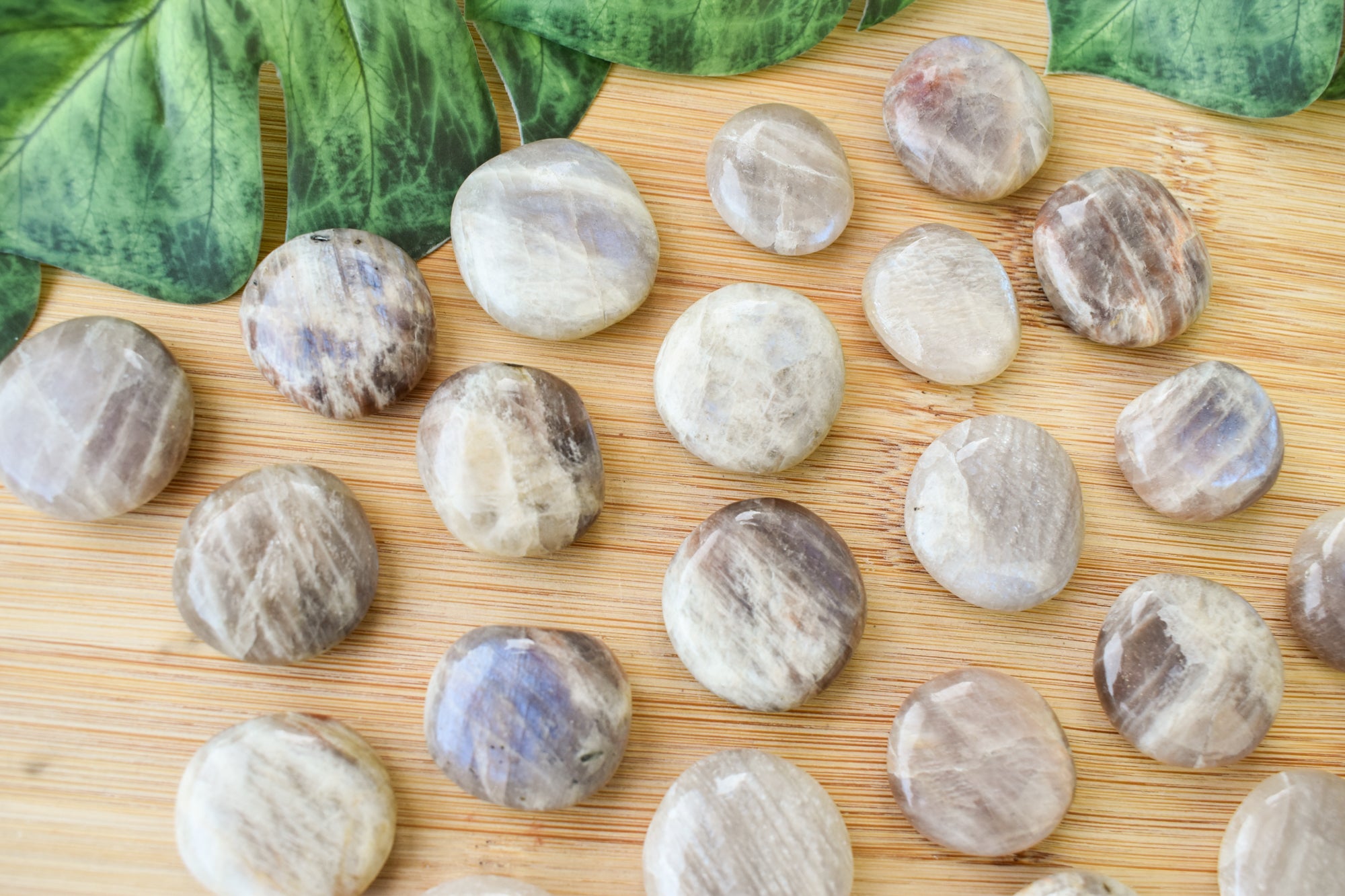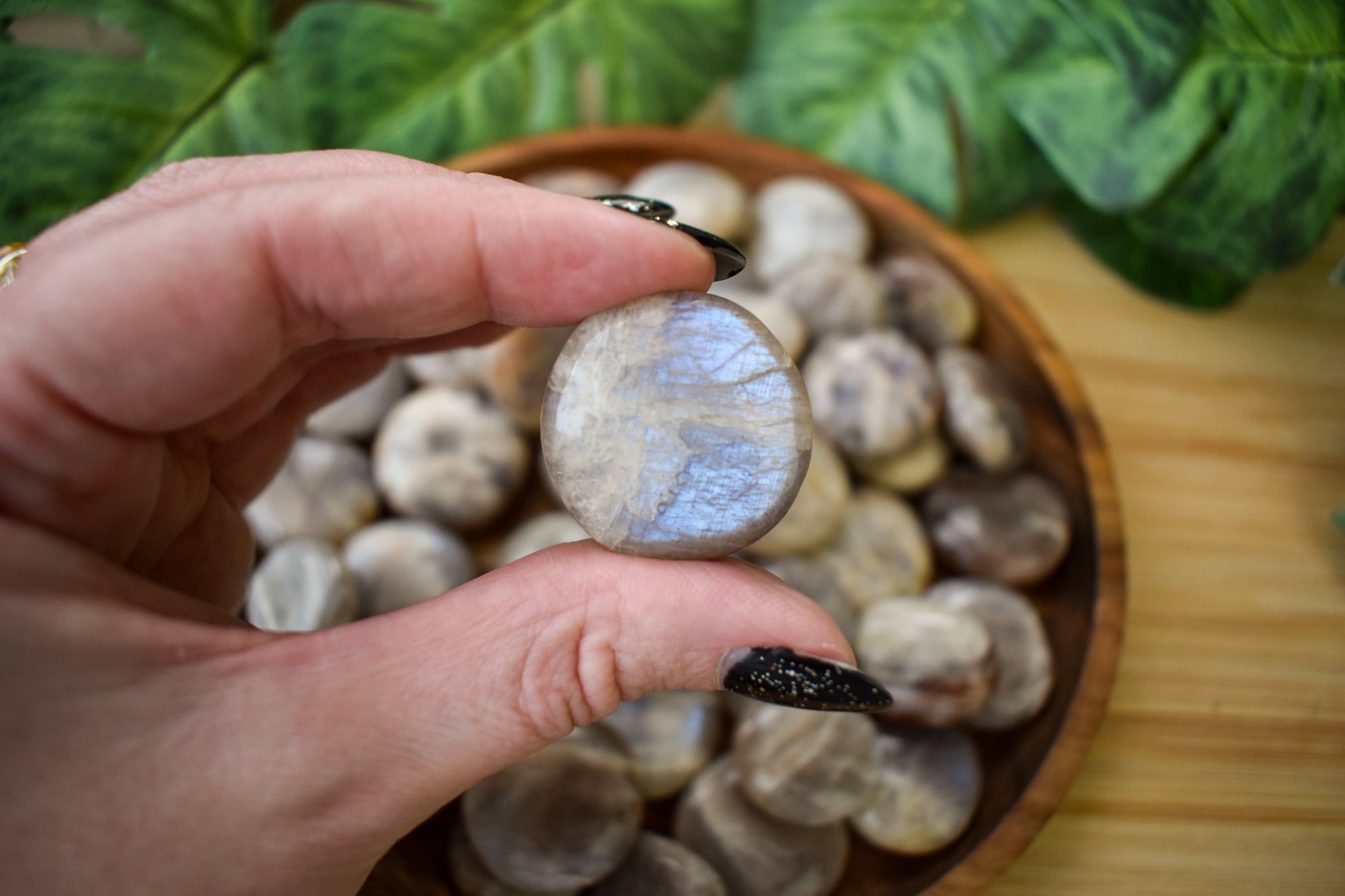 These are radiant Sunstone and Moonstone flat stones, featuring warm, glittering flashes of coppery gold paired with soft pearly sheens and gentle iridescence. Each piece is smoothly polished into a comforting flat stone, perfect for holding in the palm, carrying with you, or placing in your sacred space. Completely unique, every stone showcases a beautiful balance of Sunstone’s sparkling warmth and Moonstone’s luminous glow. Ideal for your collection, altar, bedside table, or as a meaningful gift filled with balanced, uplifting energy.