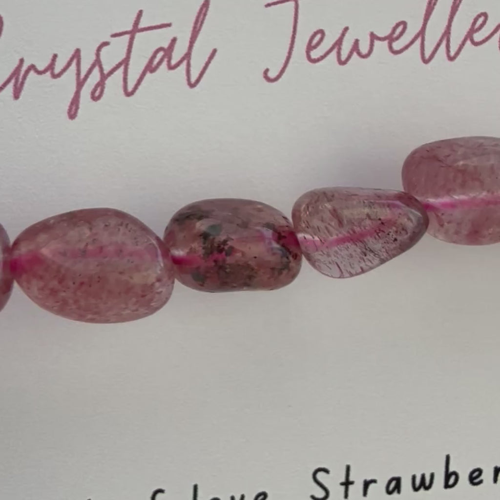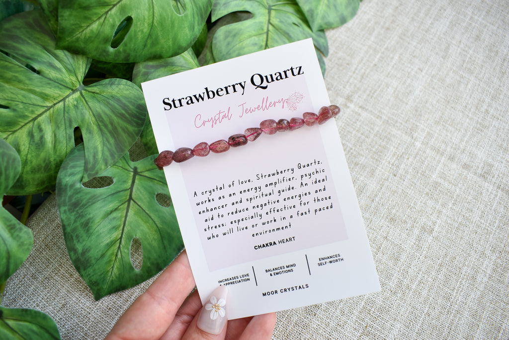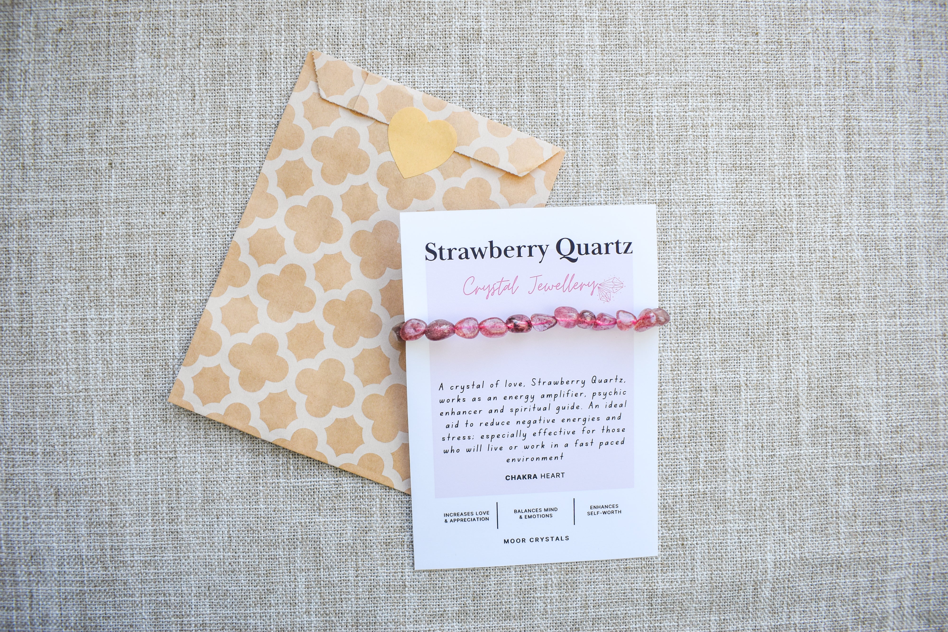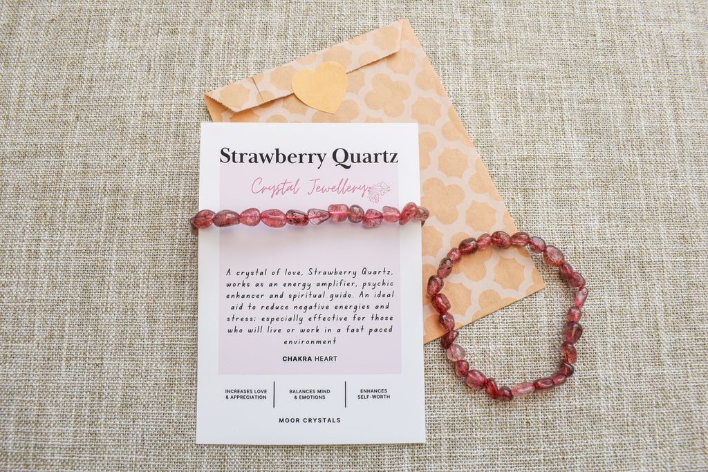 Strawberry Quartz crystal bracelet. The bracelet is beautifully presented on a crystal description card with information on this popular crystal.