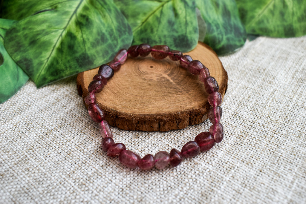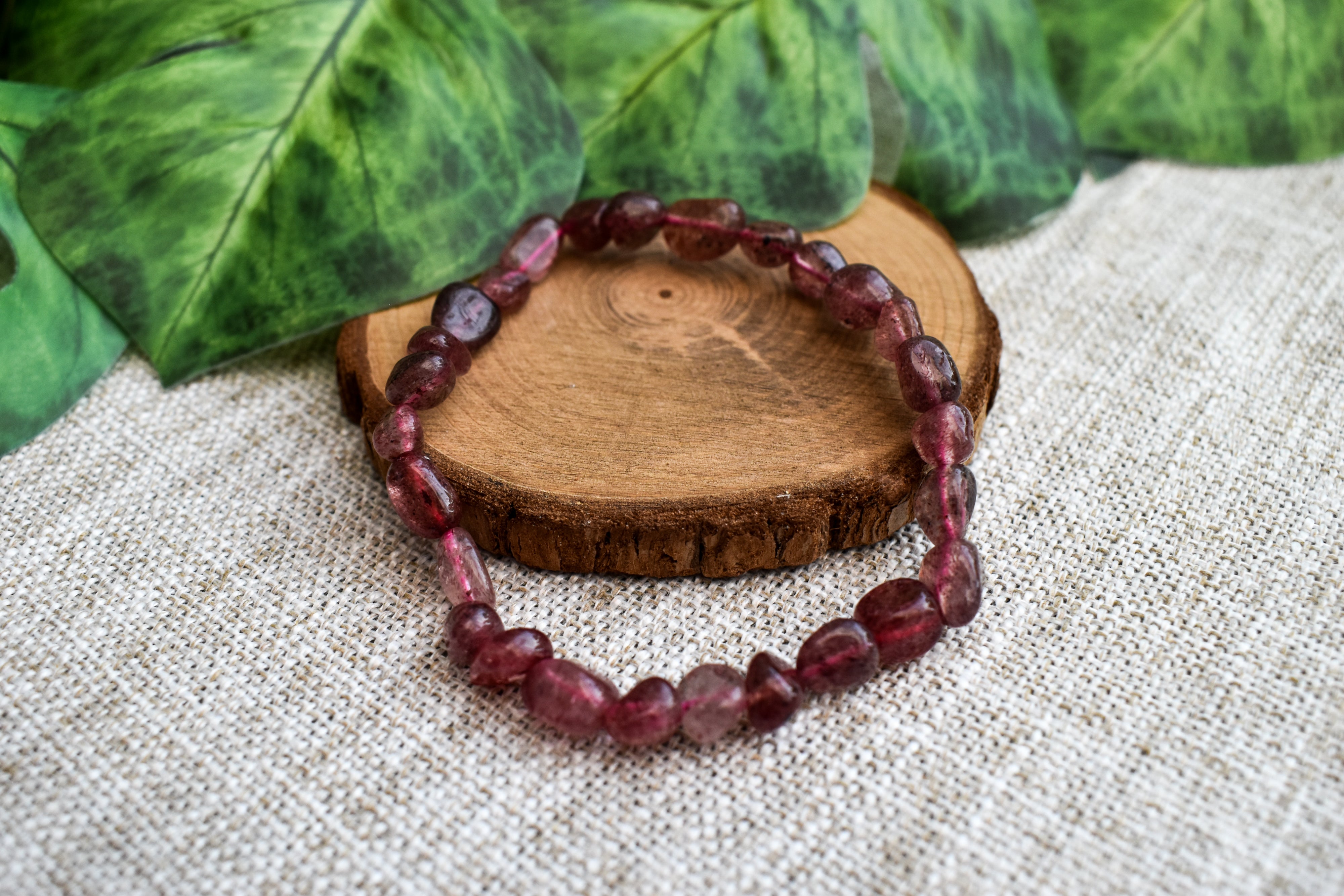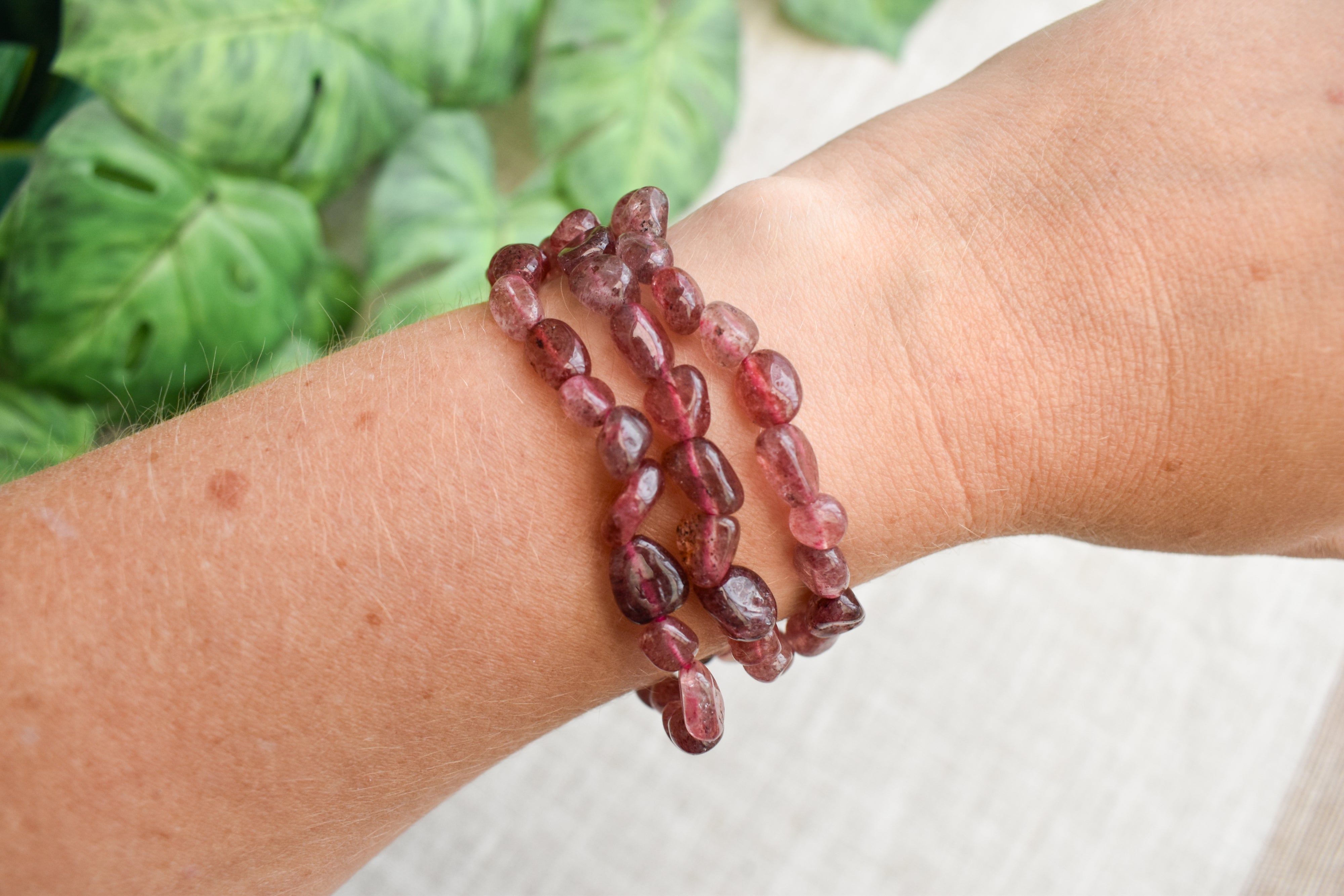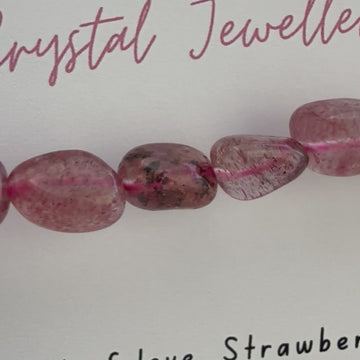 This listing is for a single Strawberry Quartz nugget bracelet. Made from natural crystal nuggets and stretch cord, presented with a crystal description card.