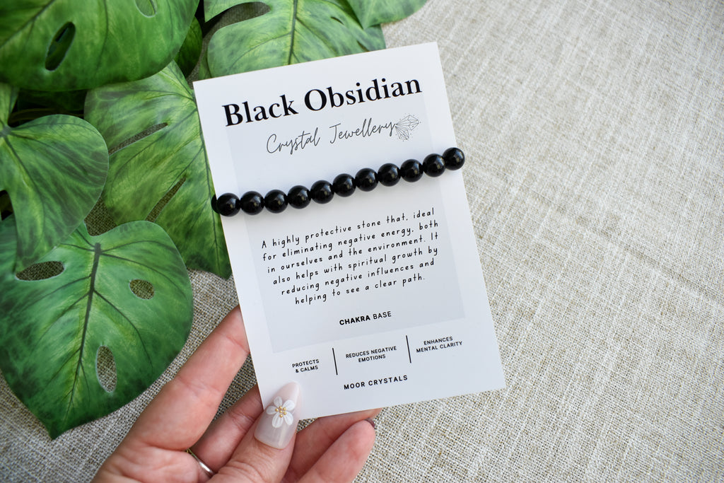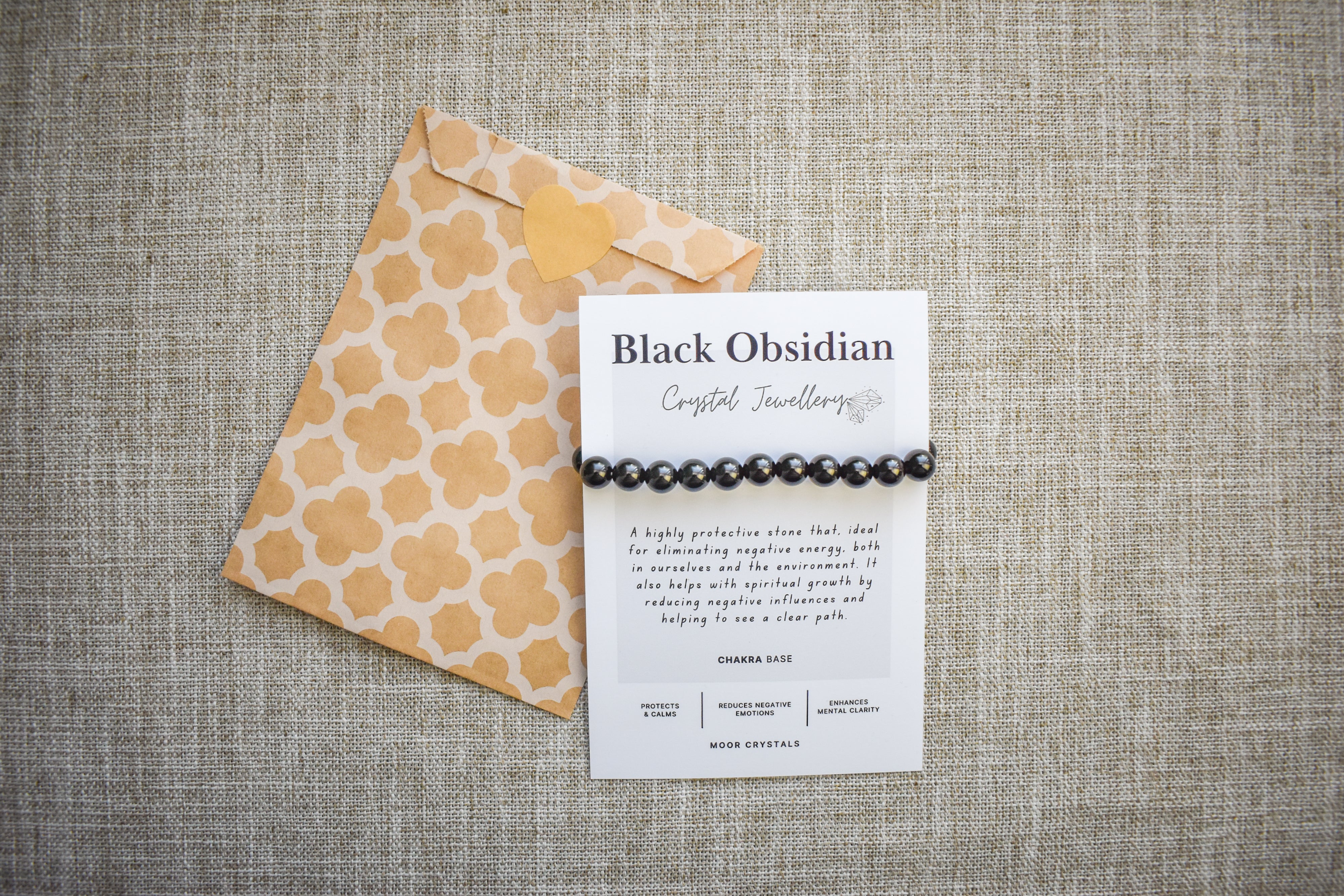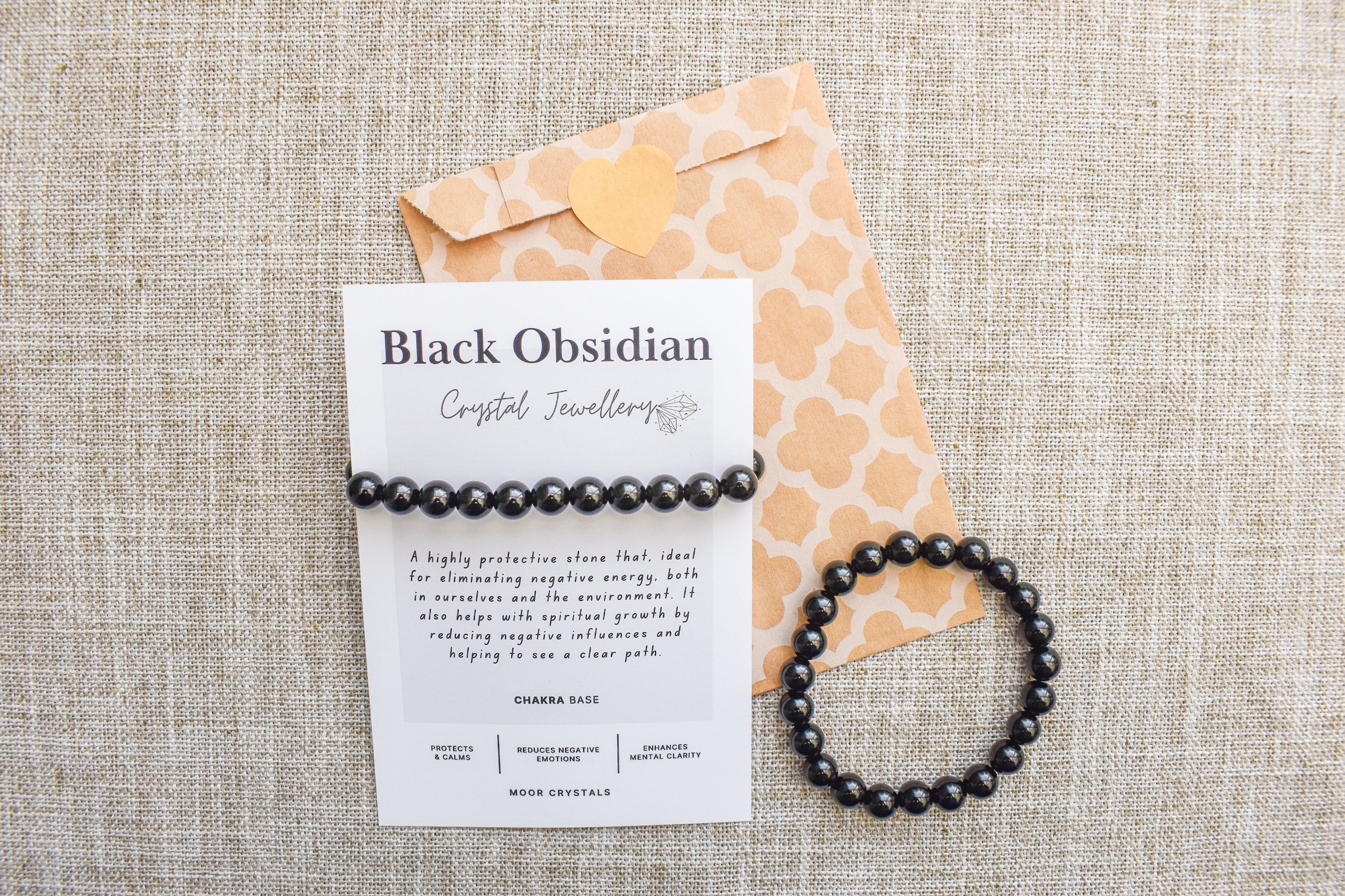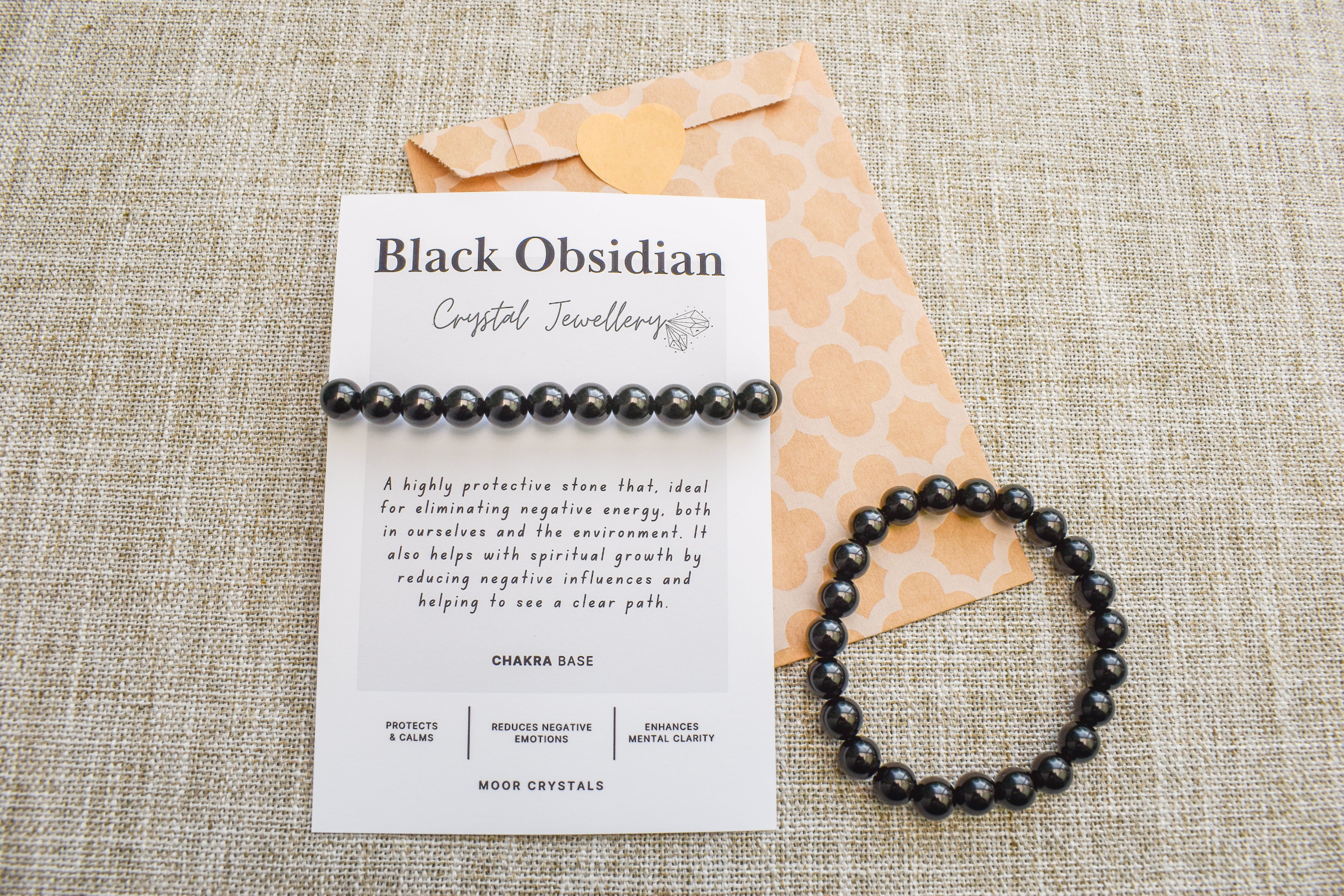 This listing is for a single Black Obsidian beaded bracelet. Made from 8mm crystal beads and stretch cord, presented with a crystal description card.