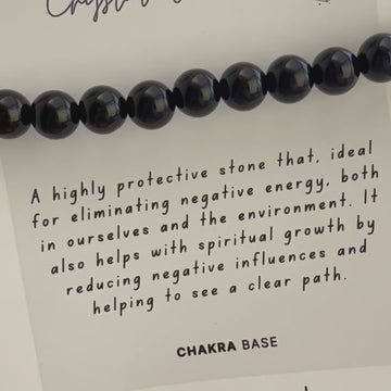 Black Obsidian crystal beaded bracelet beautifully presented on a crystal description card.