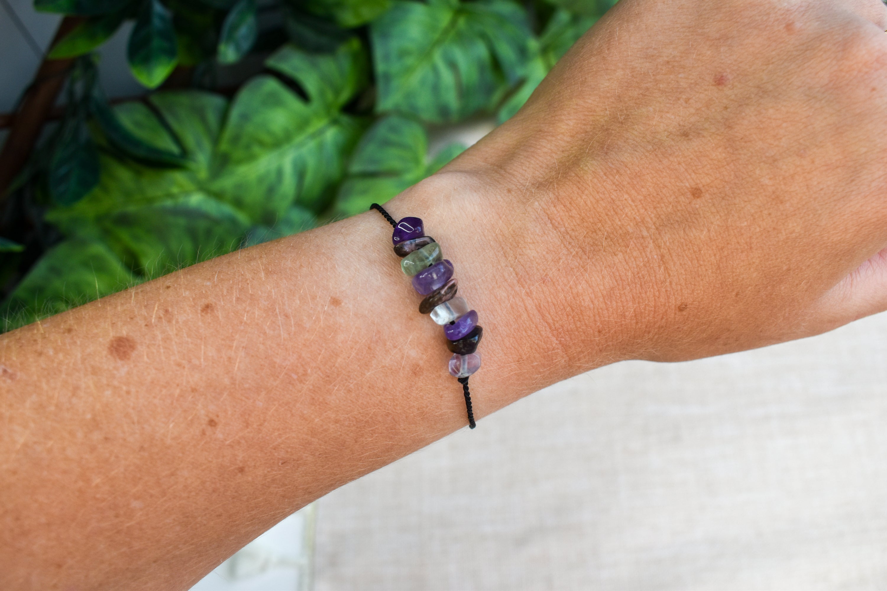 The crystals used in this bracelet are Rhodonite, Amethyst and Fluorite. These are some of the most effective crystals for reducing negative influences and helping to provide clarity and focus.