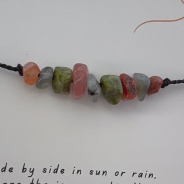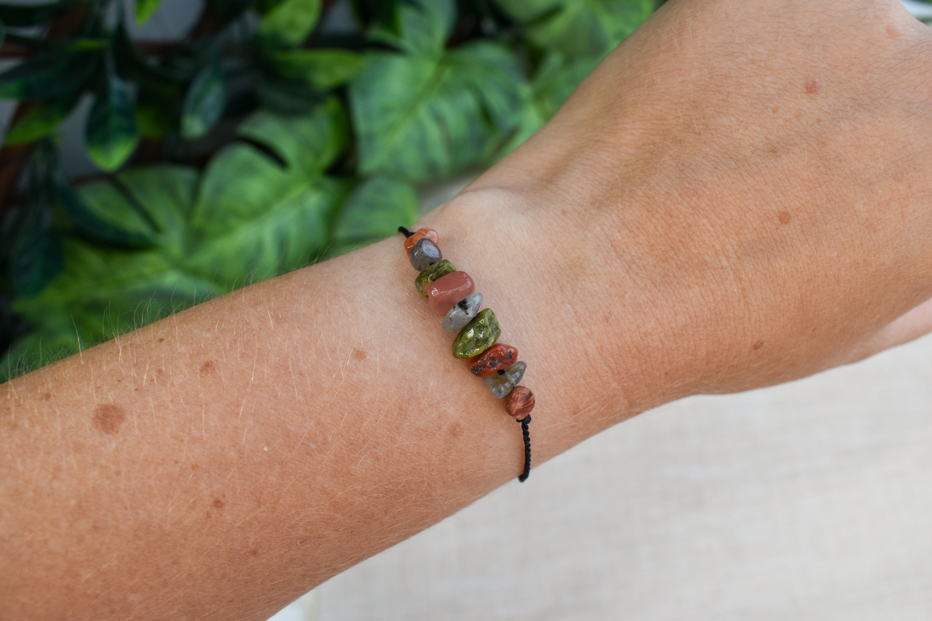 The crystals used in this bracelet/anklet are Carnelian, Labradorite and Unakite. These crystals all have a strong association with friendship, companionship and supporting harmony in our relationships.
