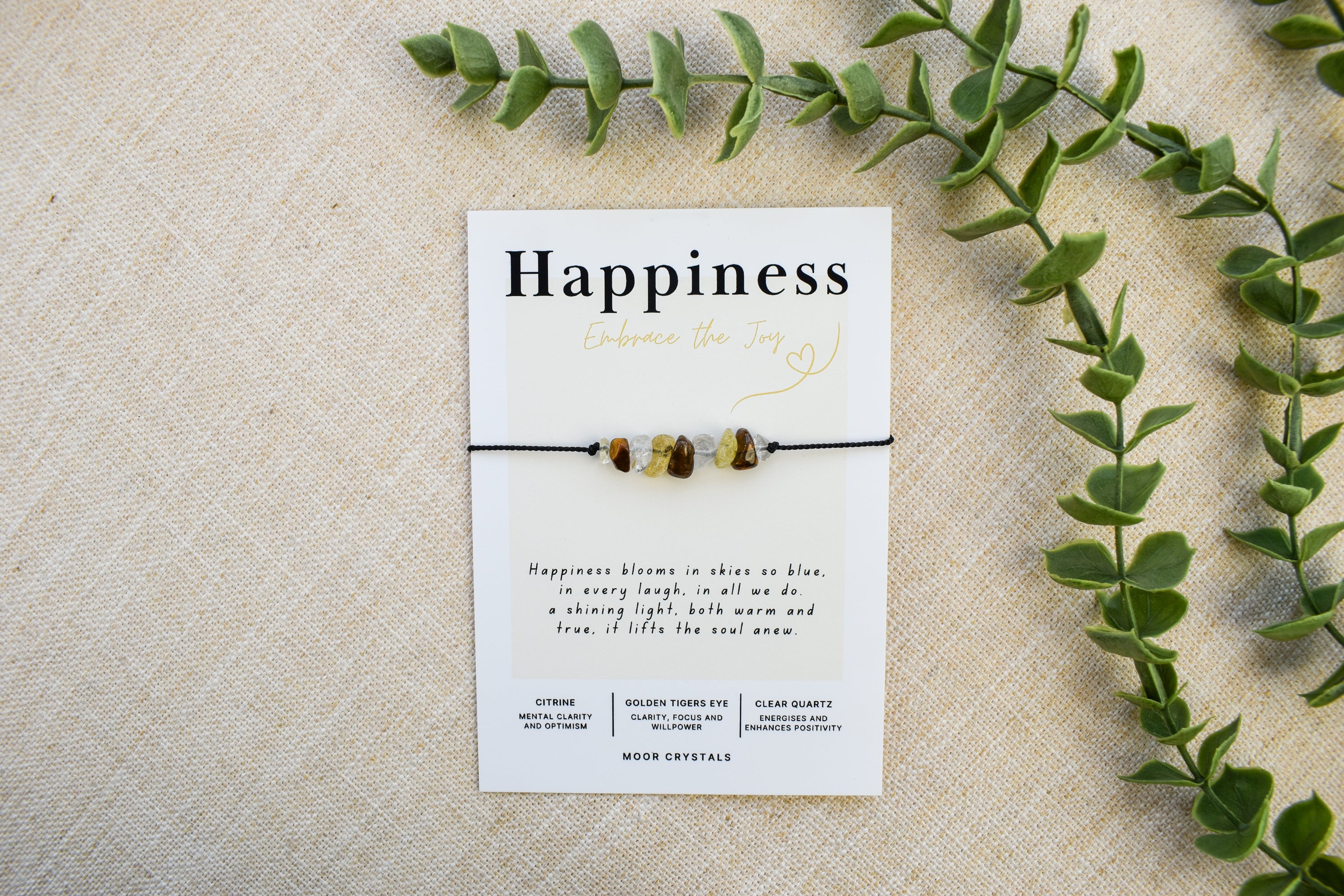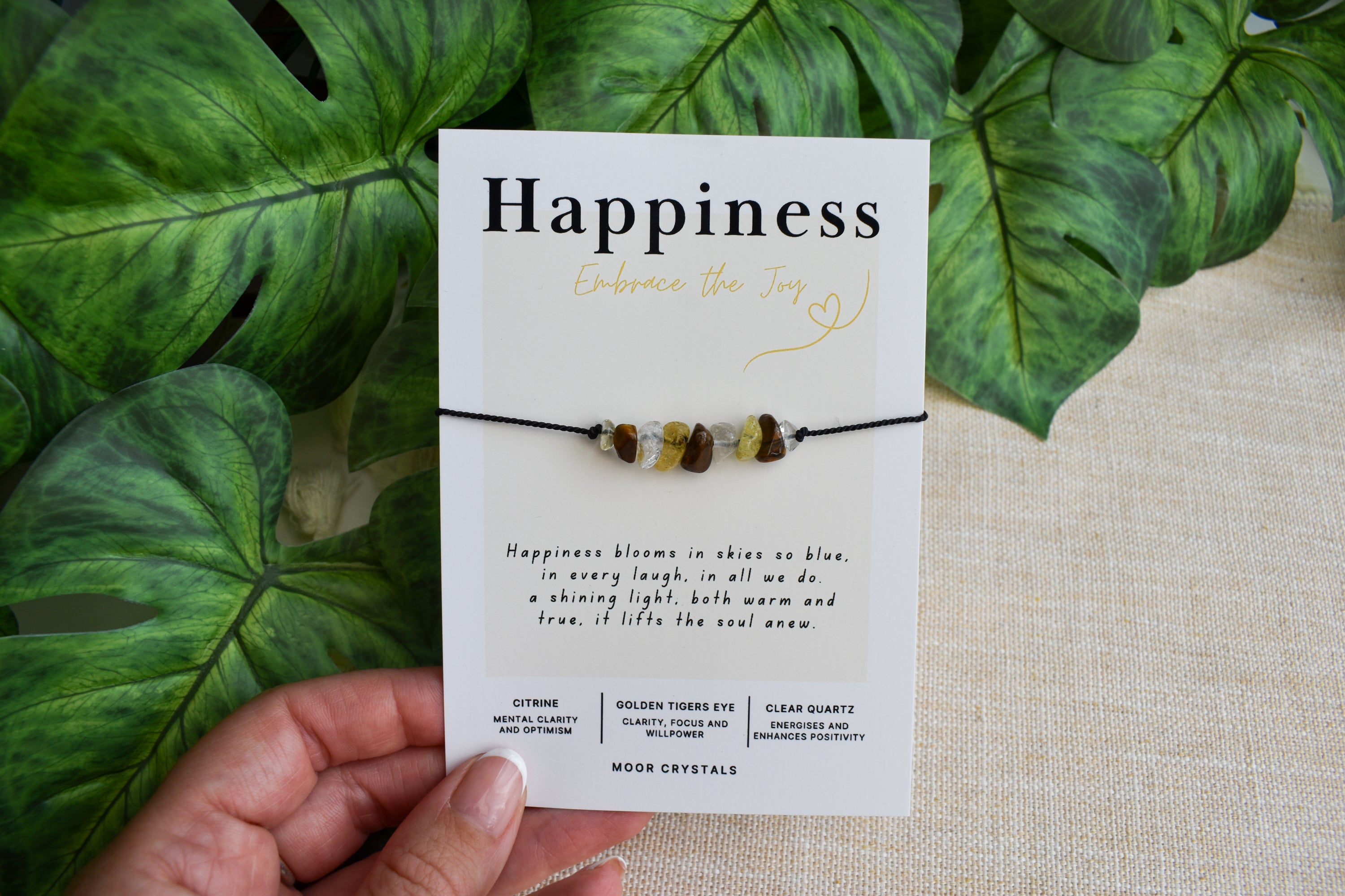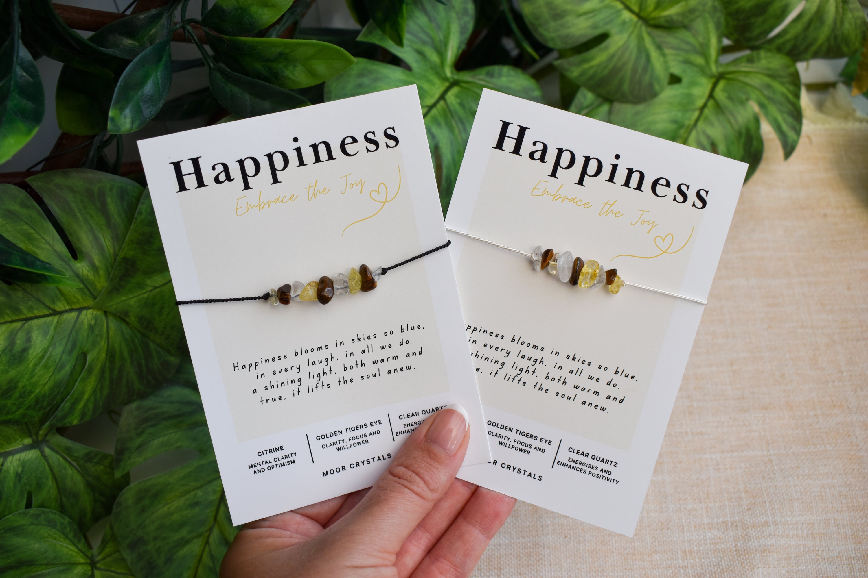 Your happiness bracelet / anklet will be presented on a beautiful card that includes a thoughtful poem and also gives information on the crystals used. It also comes beautifully packaged as shown in the photos using 100% eco packaging.