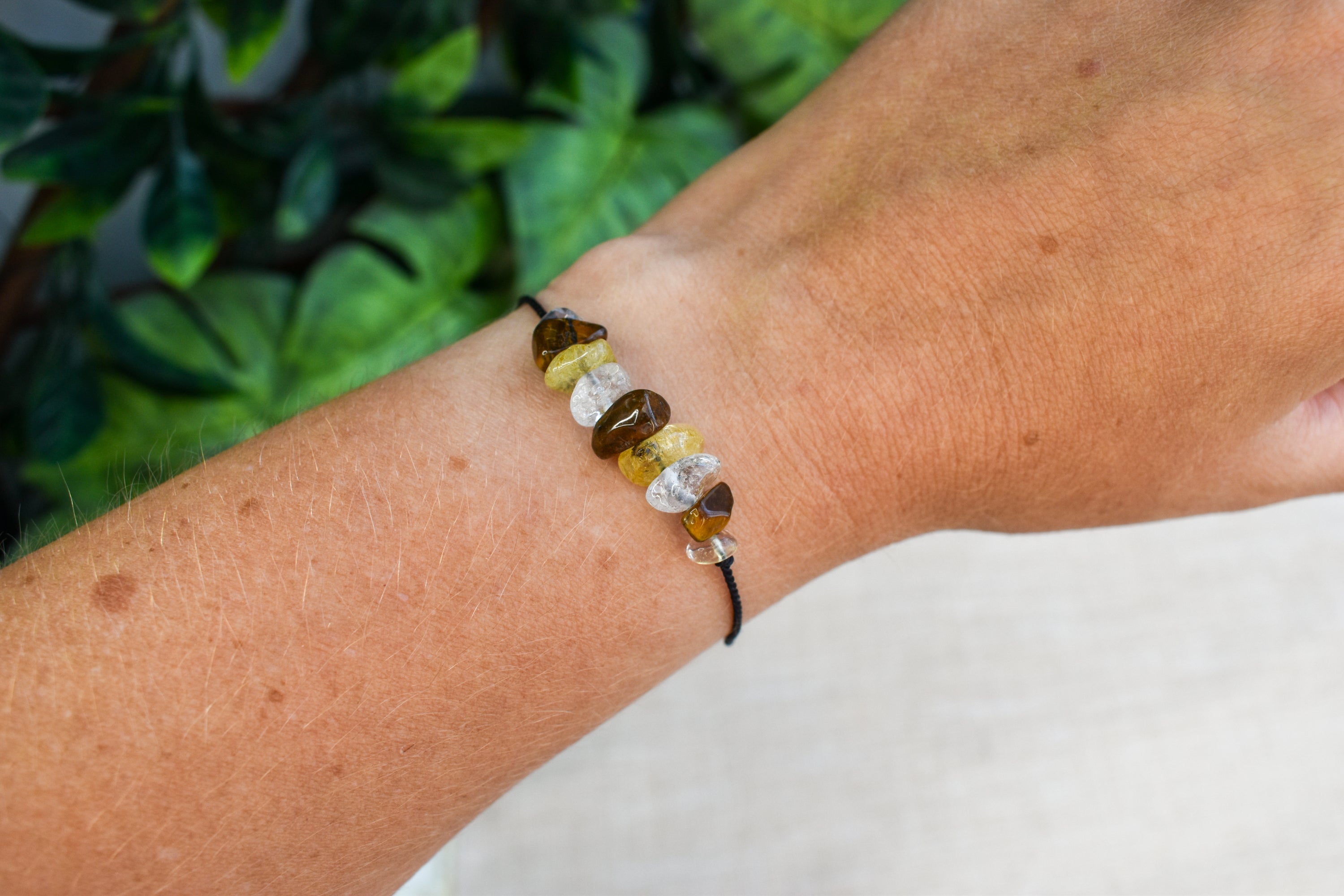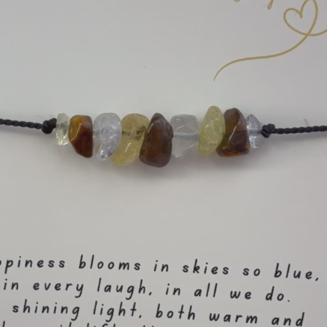 The crystals used in this bracelet/anklet are Citrine, Tigers Eye and Clear Quartz. These crystals all hold happy and positive energies.