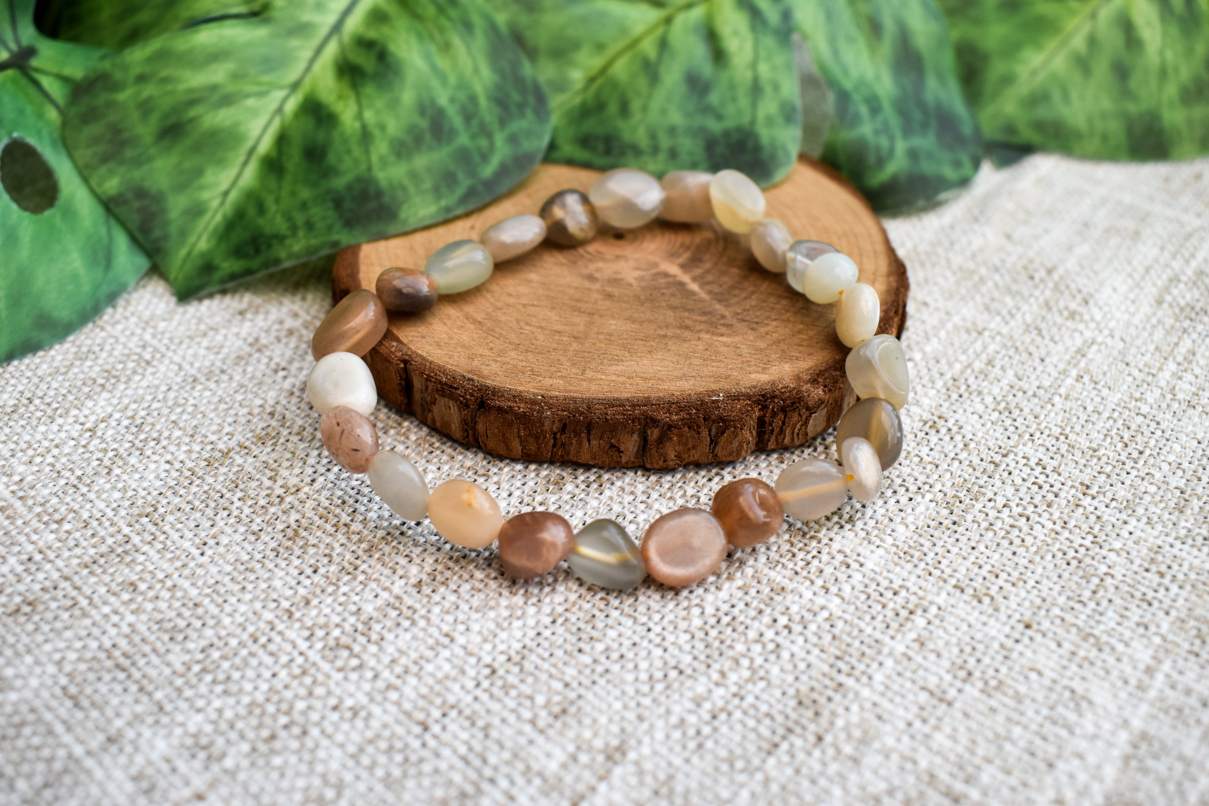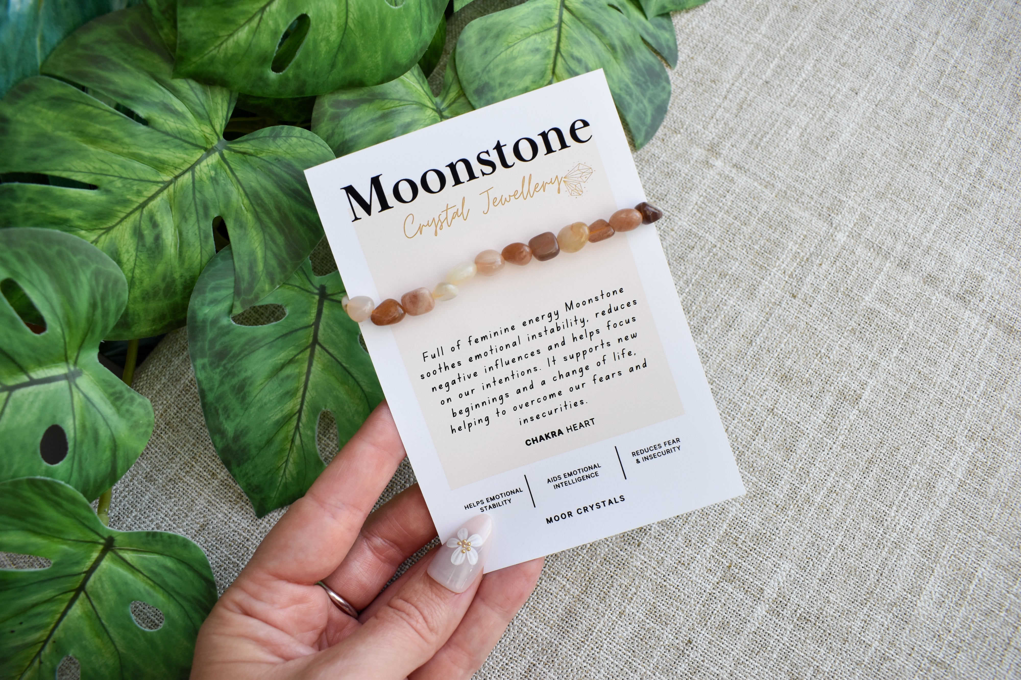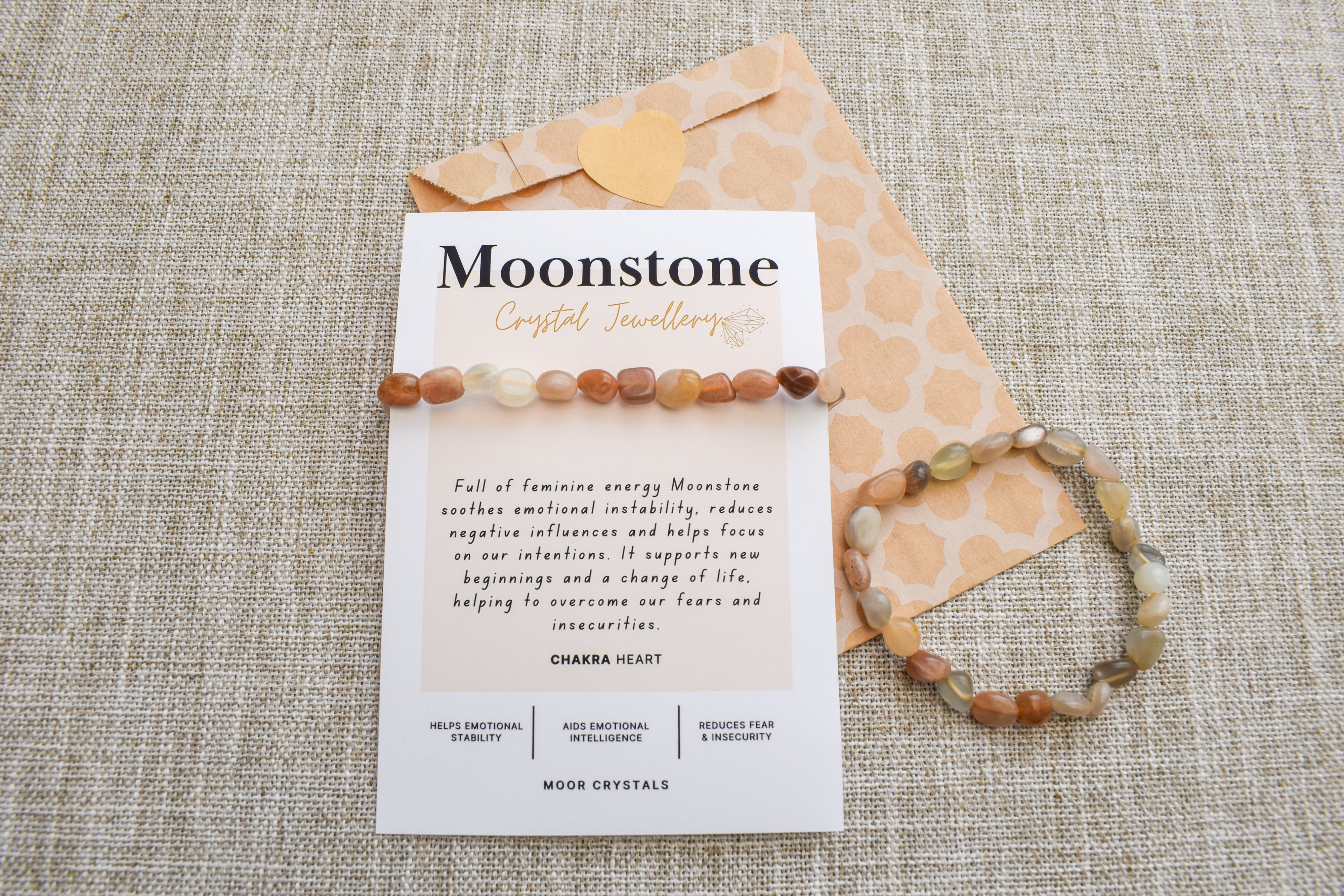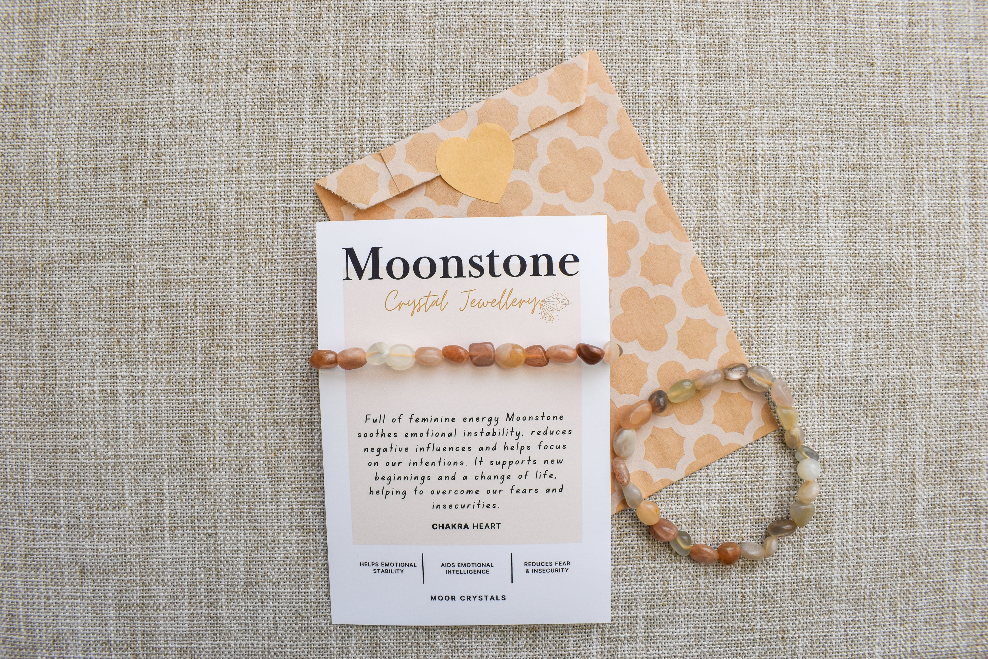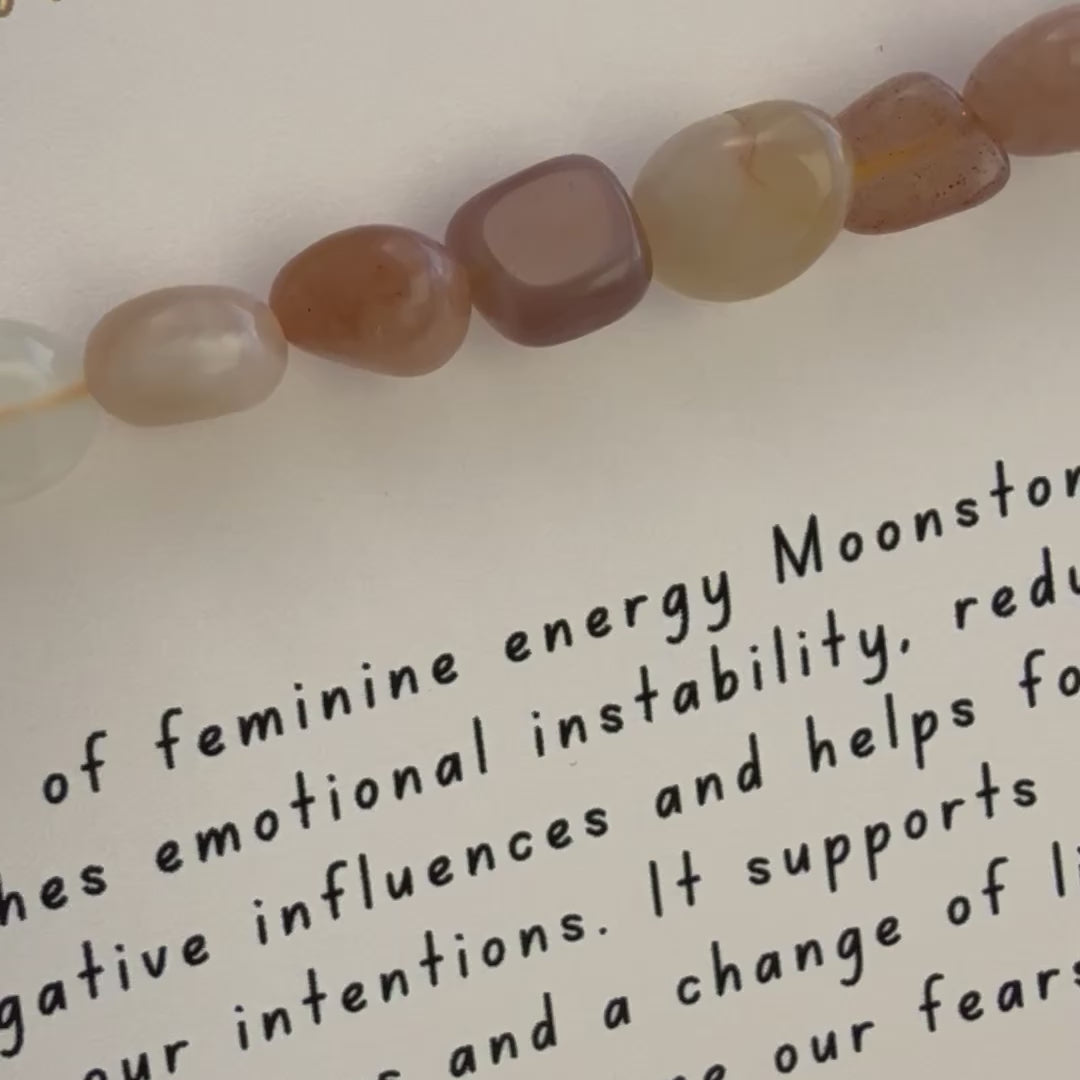 Moonstone crystal nugget bracelet beautifully on stretch cord, designed to fit any wrist size. The bracelet is presented on a unique crystal description card with information on this lovely crystal.