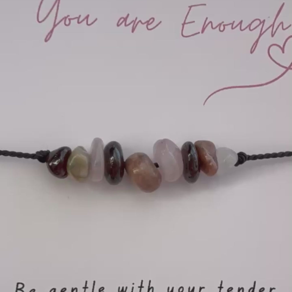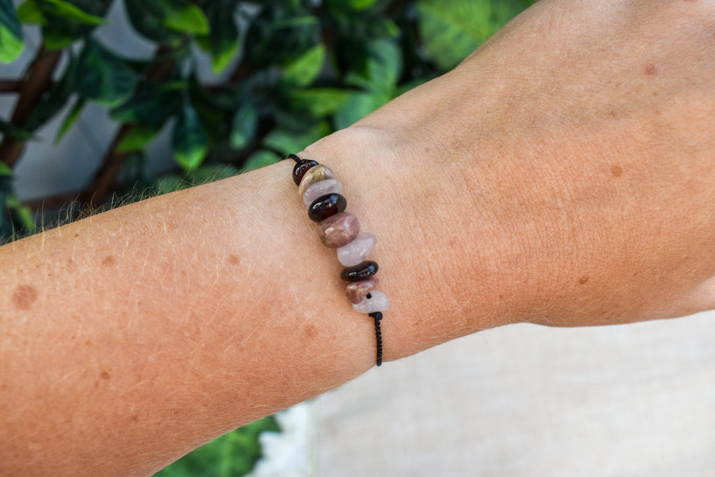The crystals used in this bracelet/anklet are Rose Quartz, Rhodonite and Garnet. These crystals all have a strong association with inner healing, emotional support and self-care.