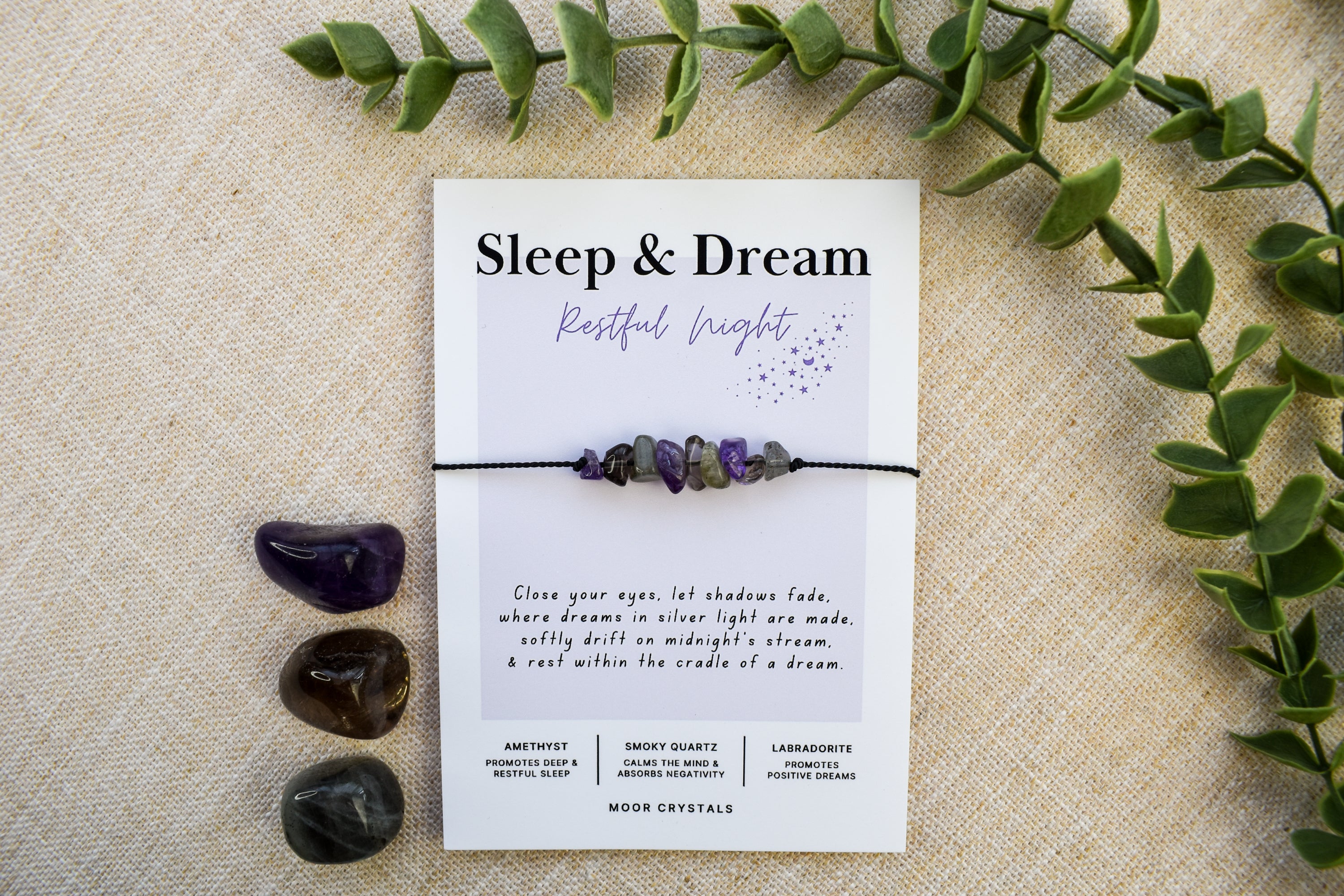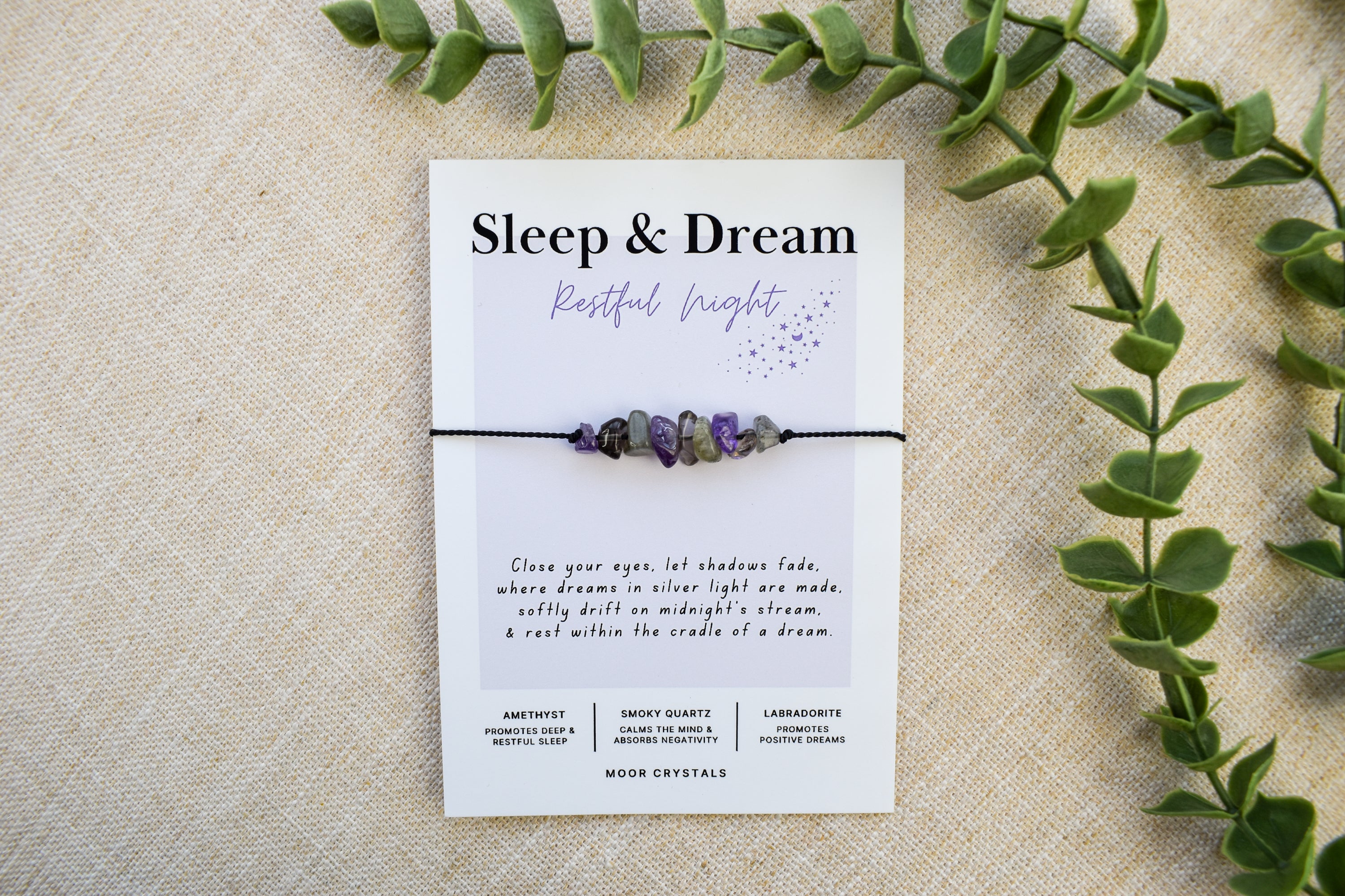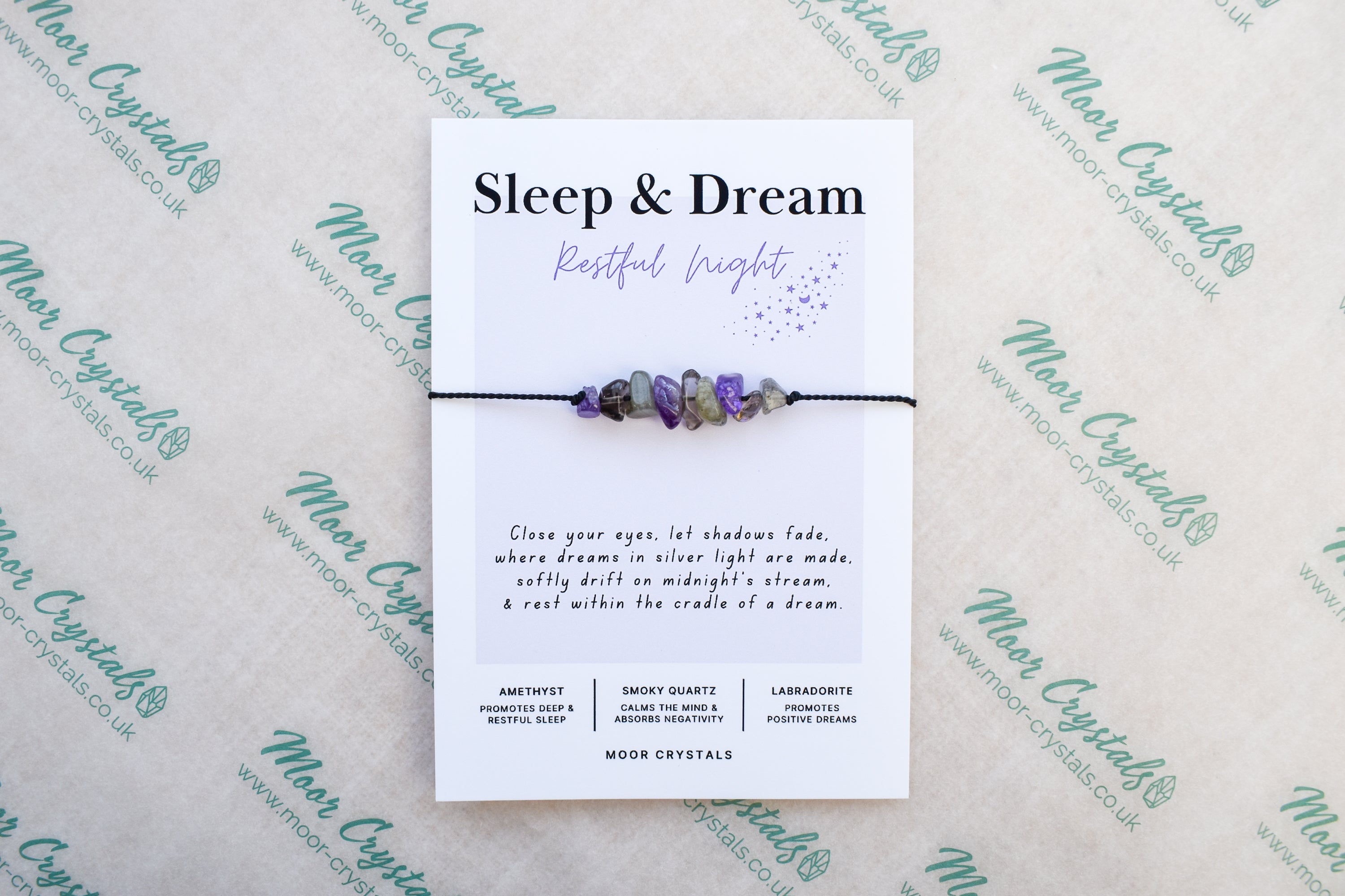 Your sleep & dream bracelet / anklet will be presented on a beautiful card that includes a thoughtful poem and also gives information on the crystals used. It also comes beautifully packaged as shown in the photos using 100% eco packaging.