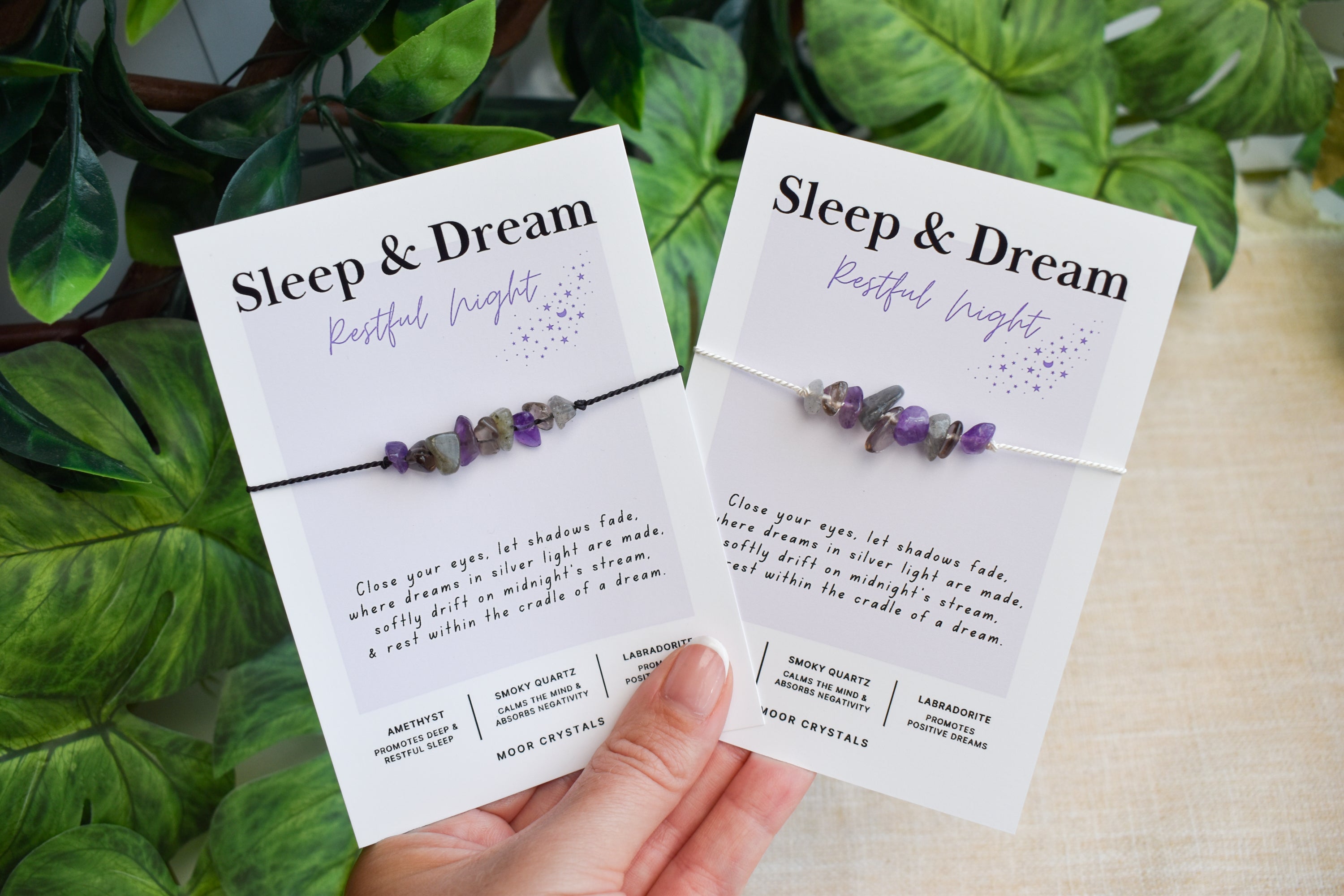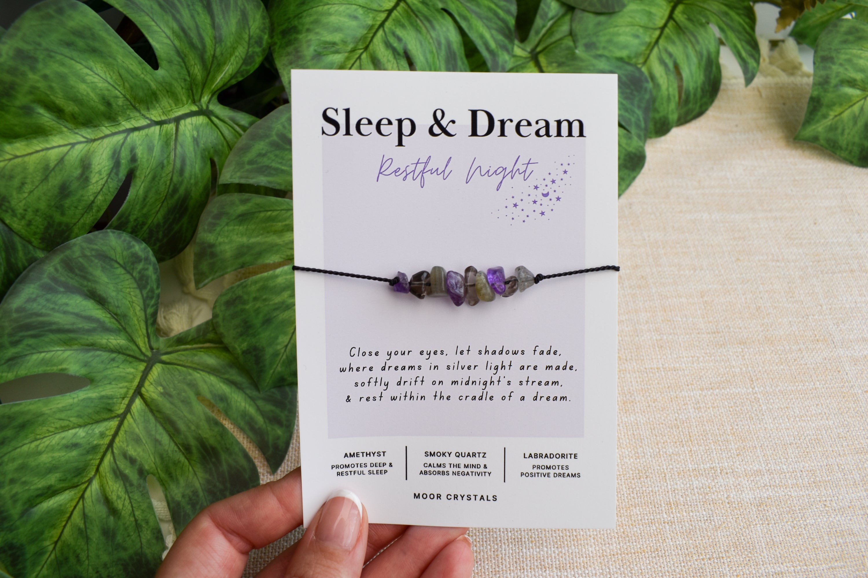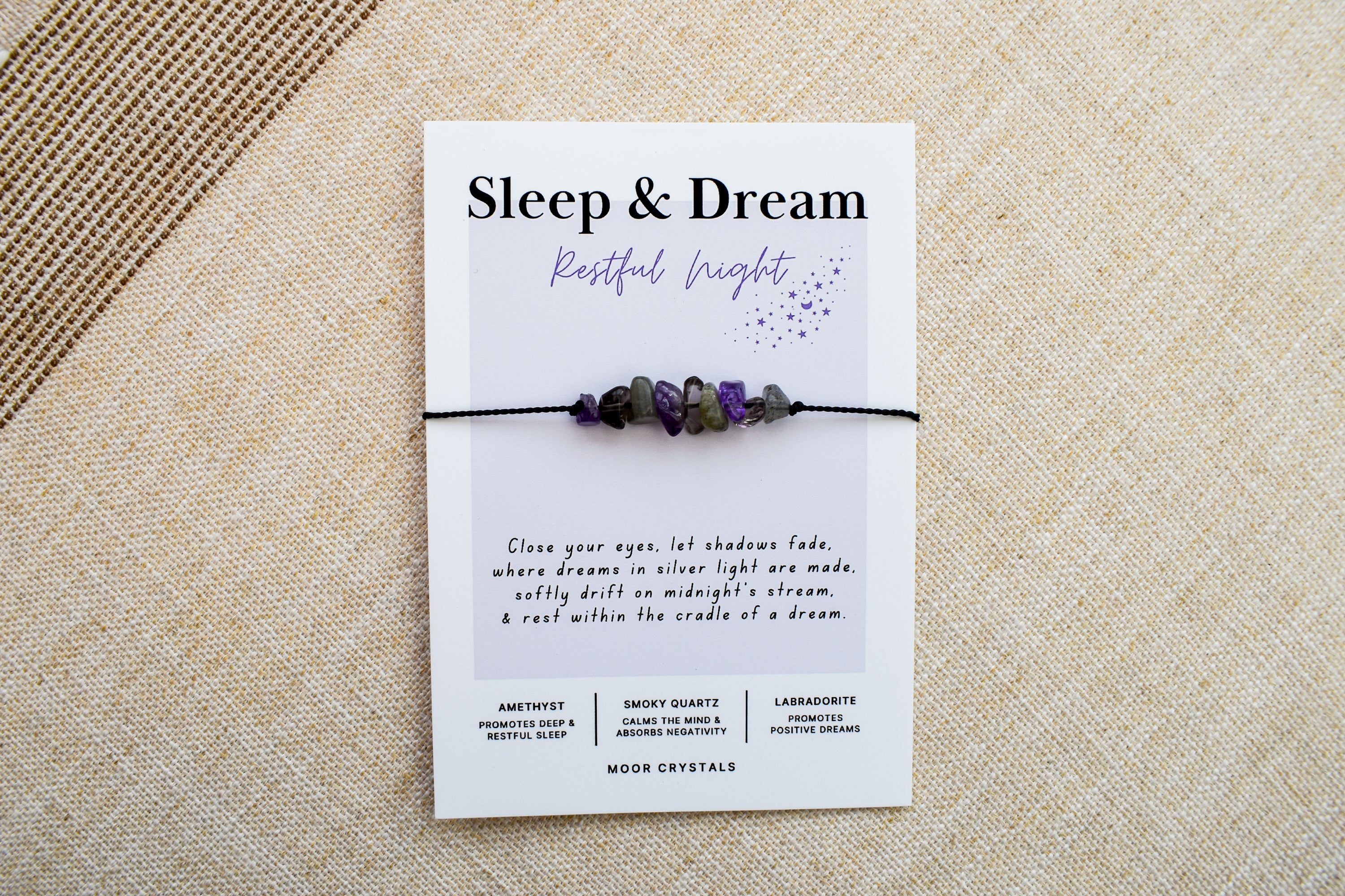 Your sleep & dream bracelet / anklet will be presented on a beautiful card that includes a thoughtful poem and also gives information on the crystals used. It also comes beautifully packaged as shown in the photos using 100% eco packaging.