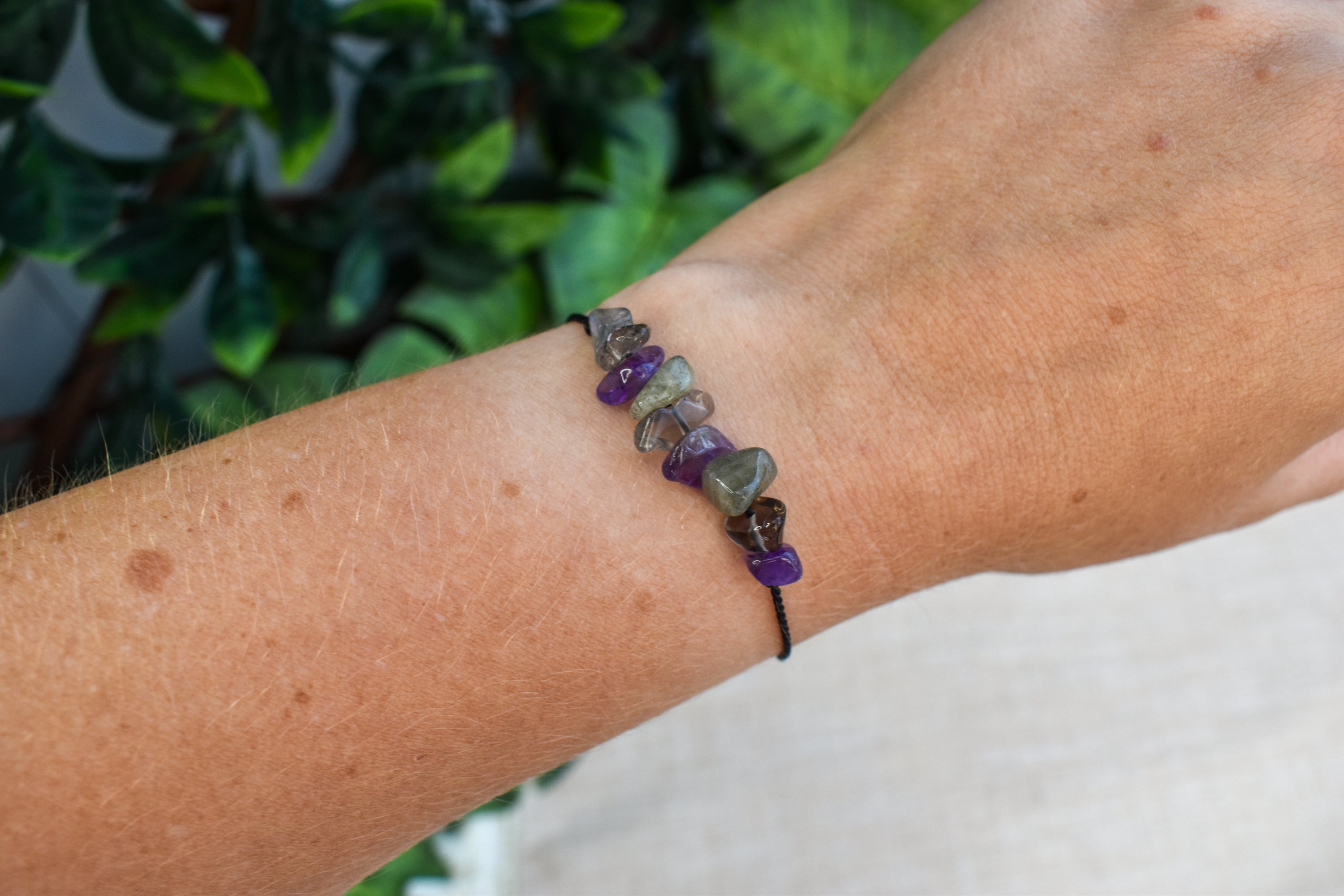 The crystals used in this bracelet/anklet are Amethyst, Smoky Quartz and Labradorite. These crystals are all believed to support a good sleep.