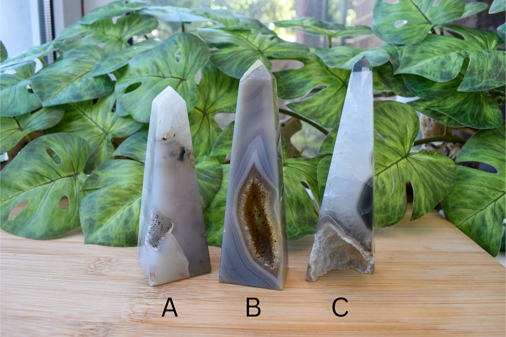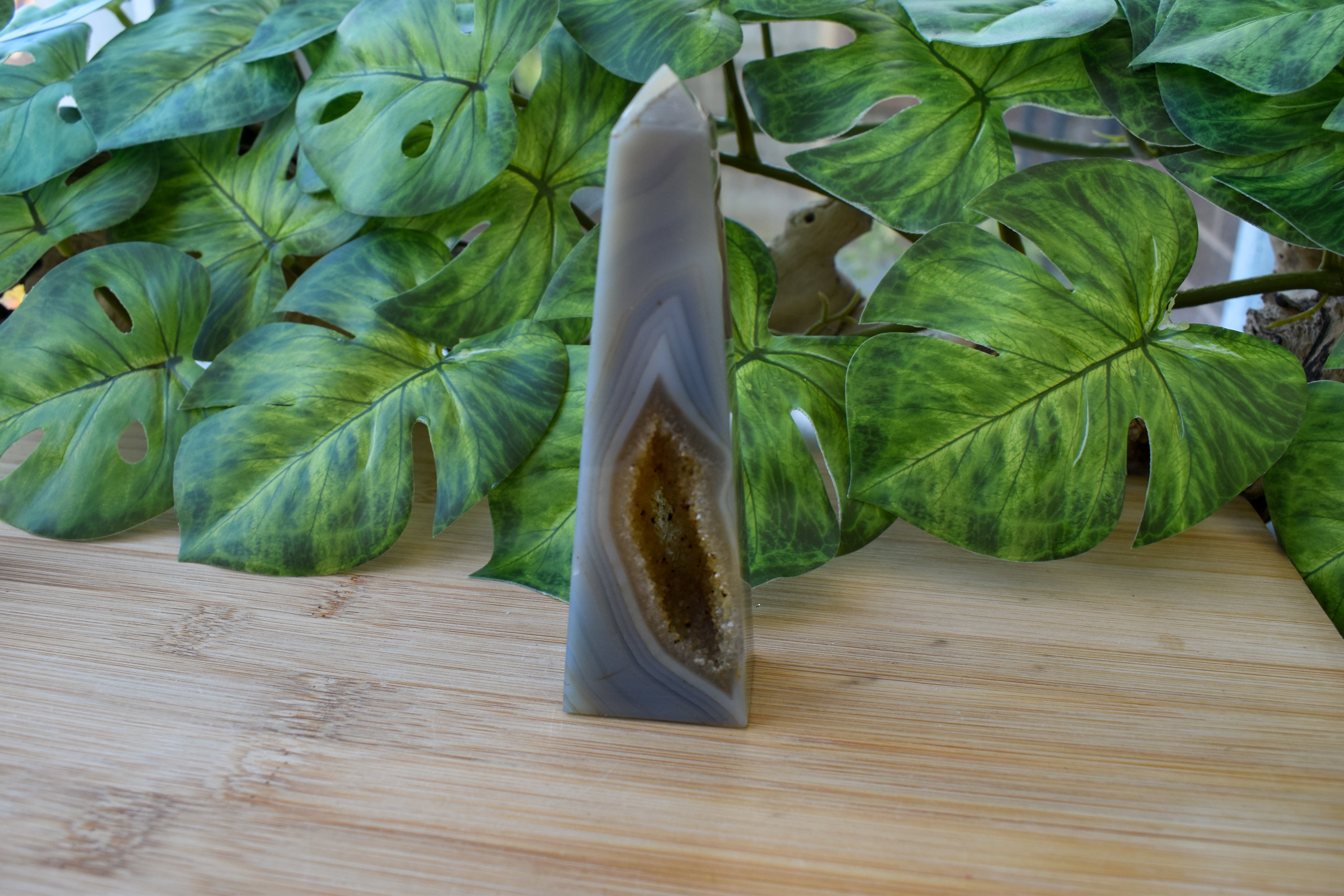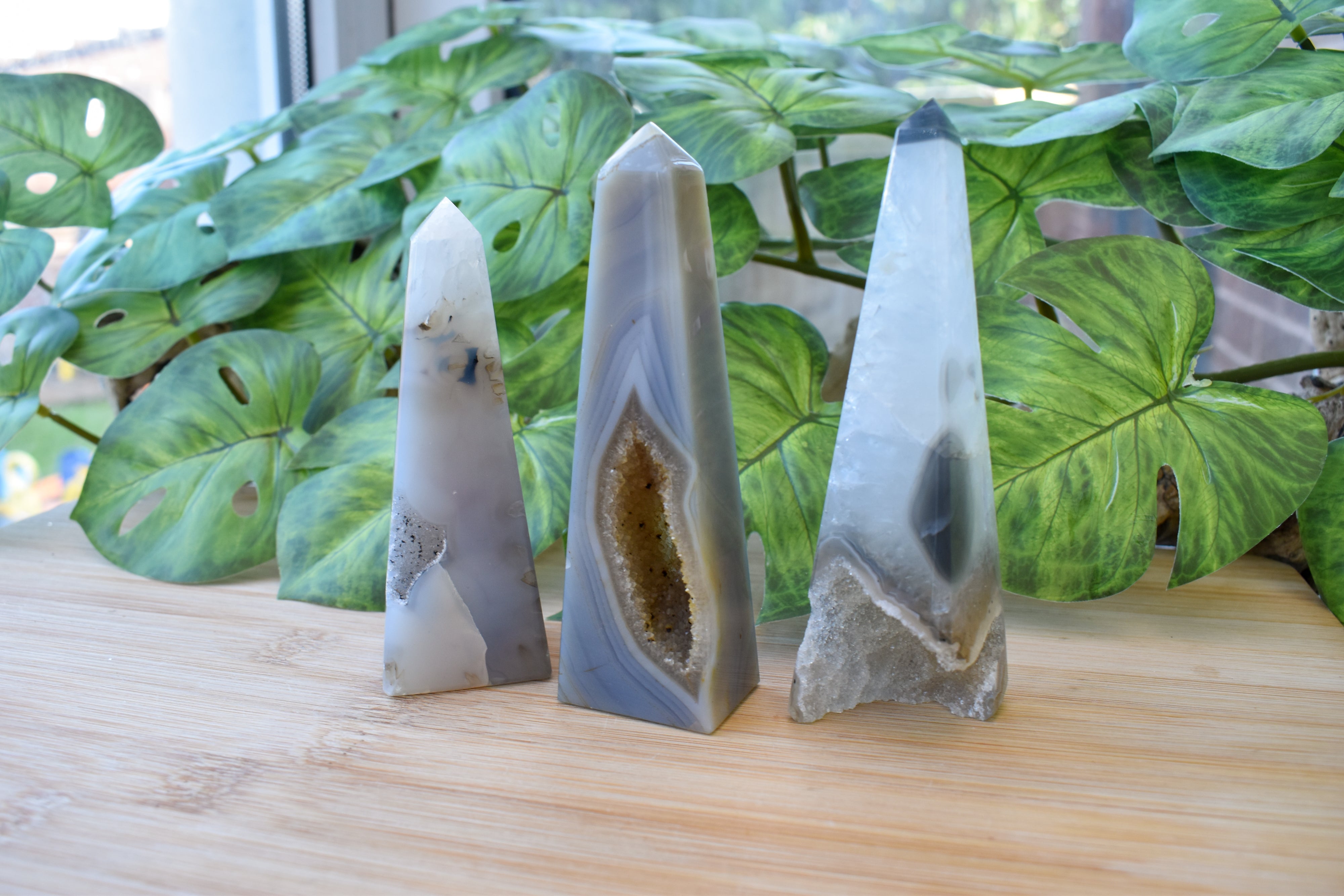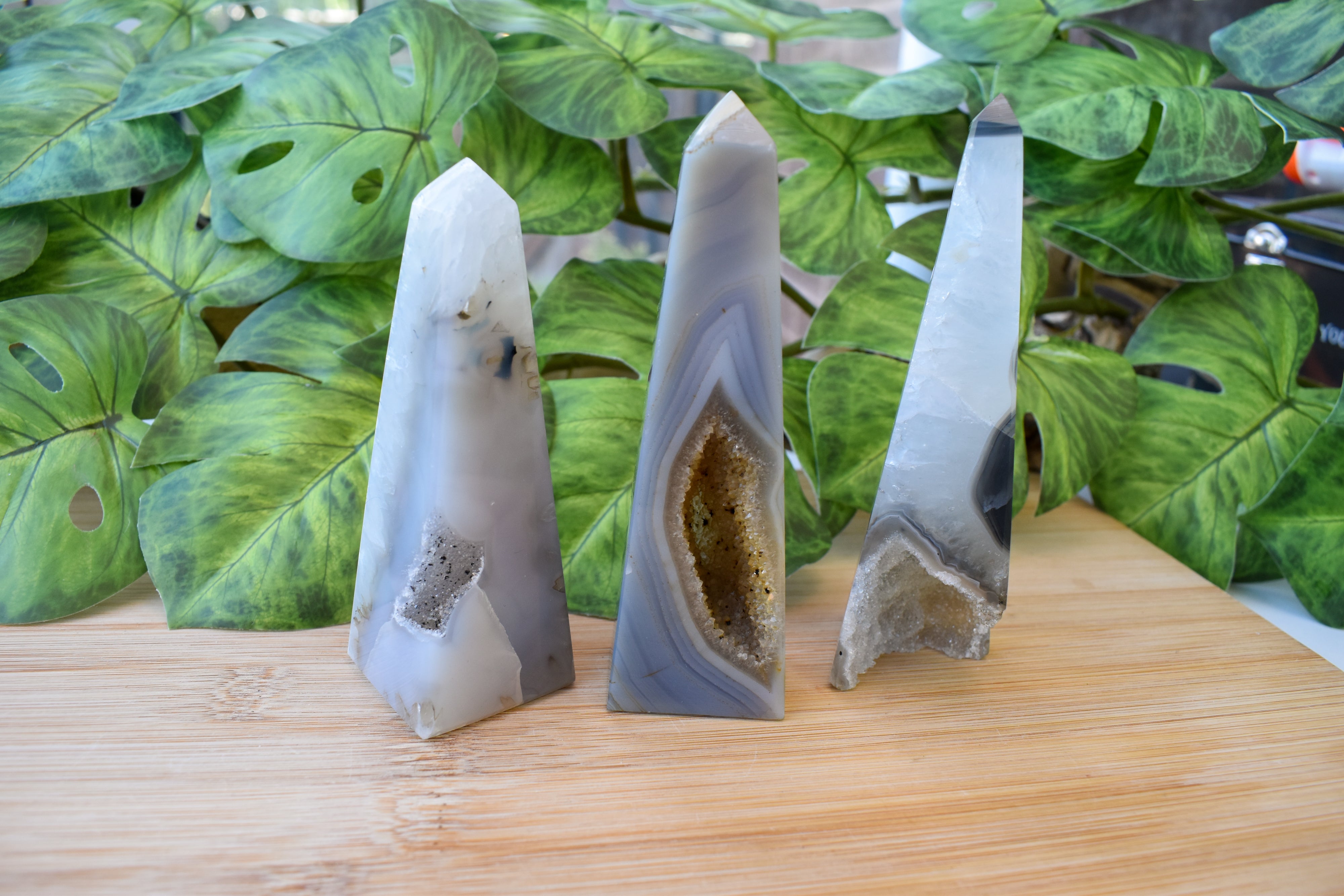 These are stunning druzy banded Agate obelisks from Brazil. The obelisks are beautifully polished with very high quality, dazzling crystal formations and gorgeous banding across the towers.