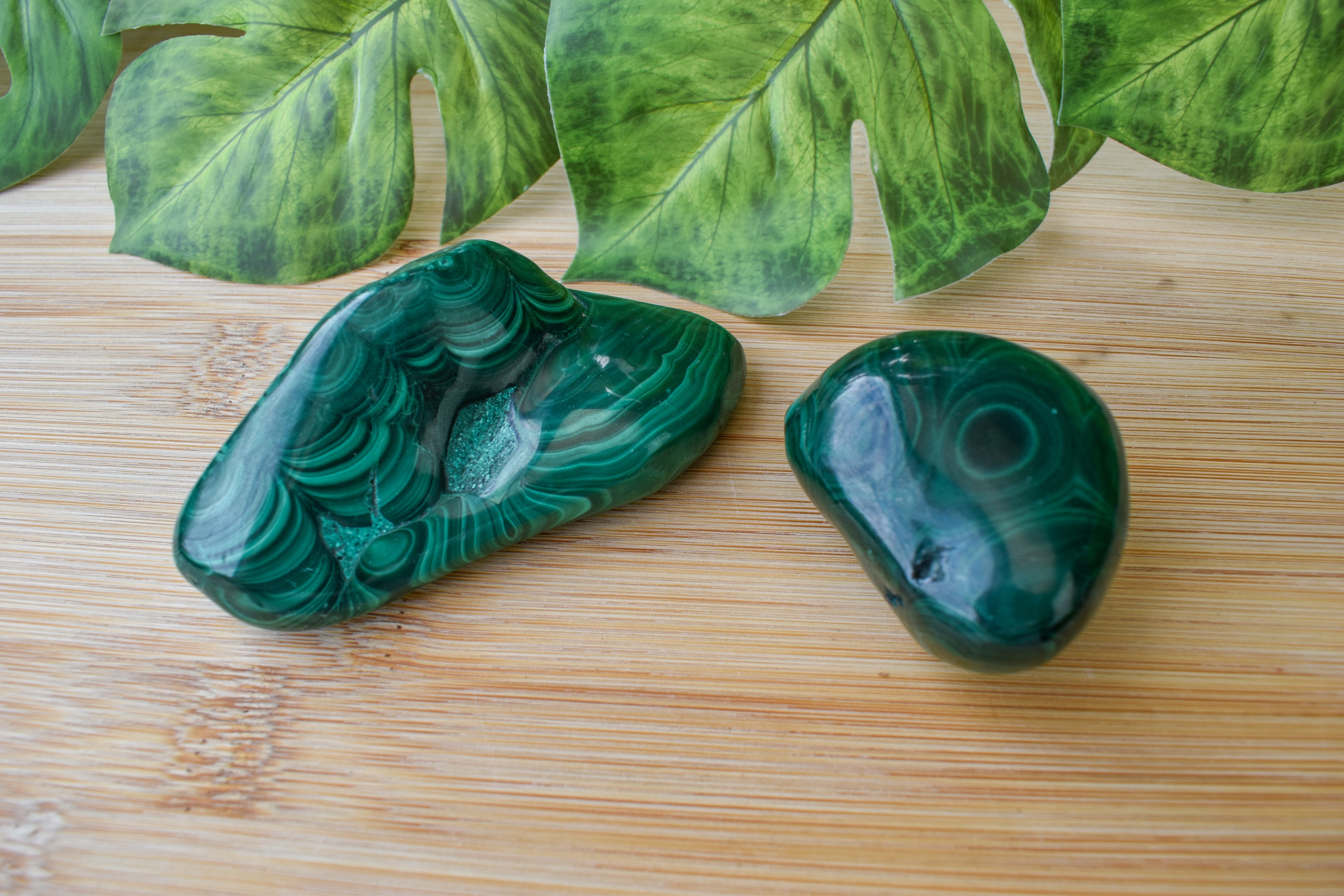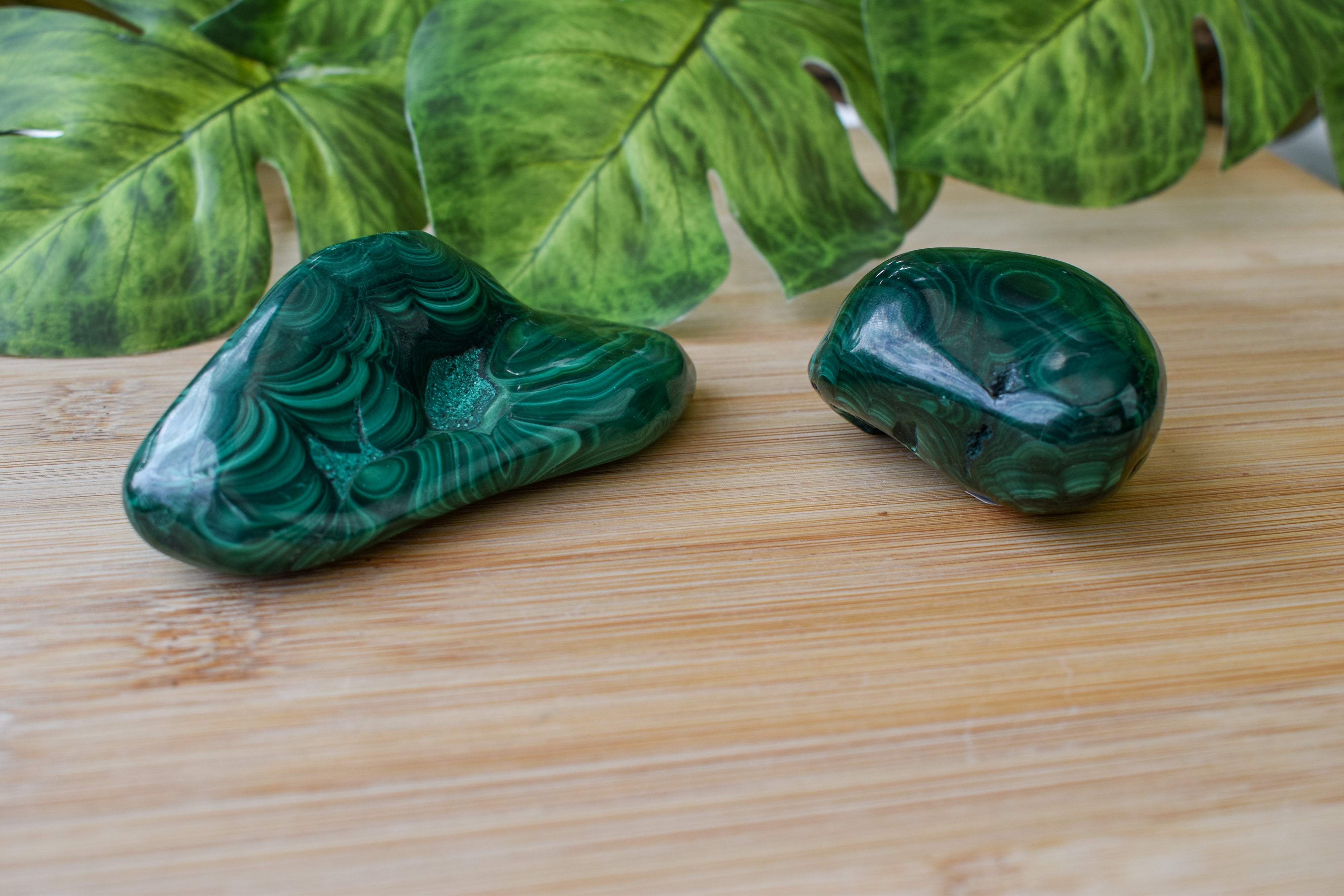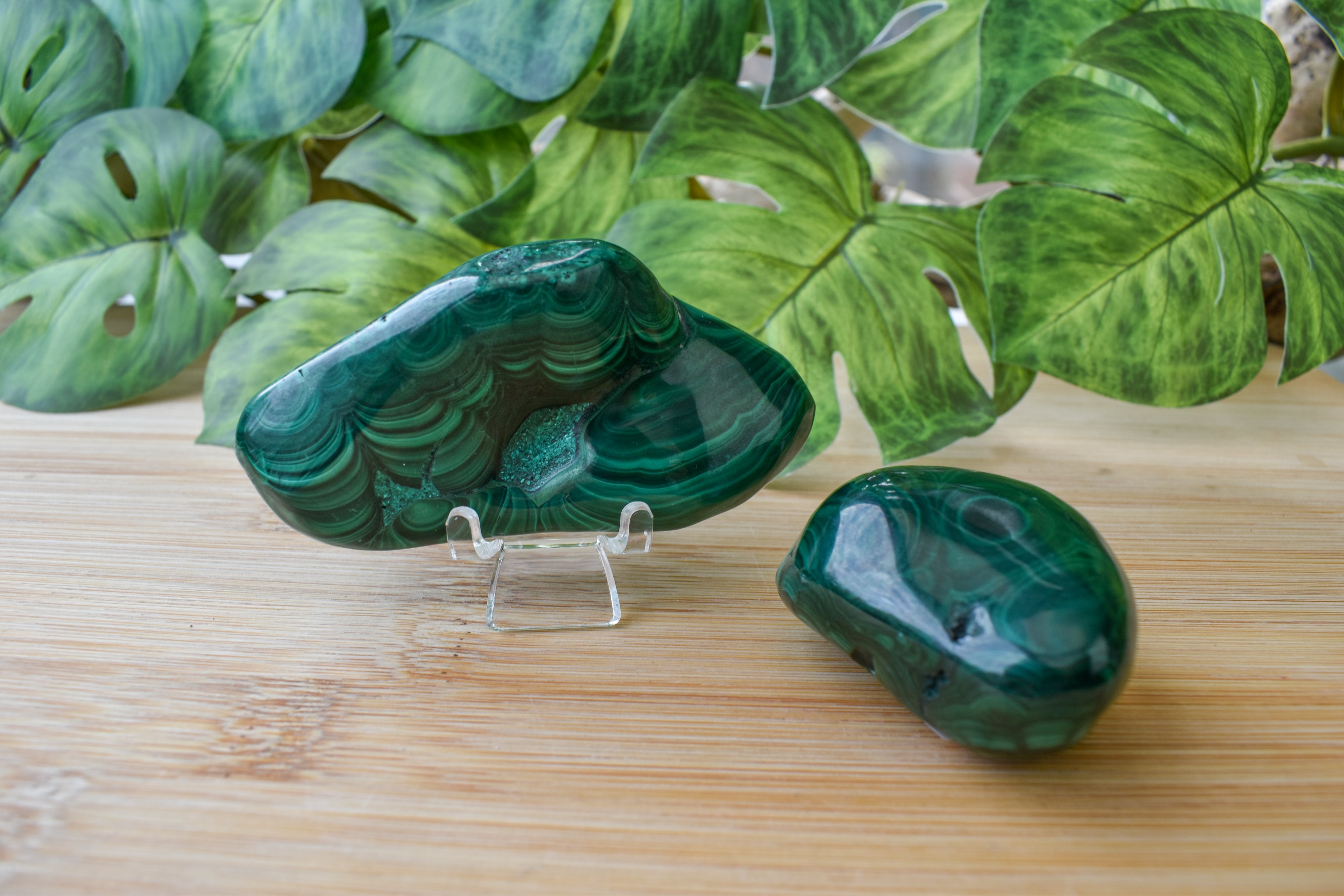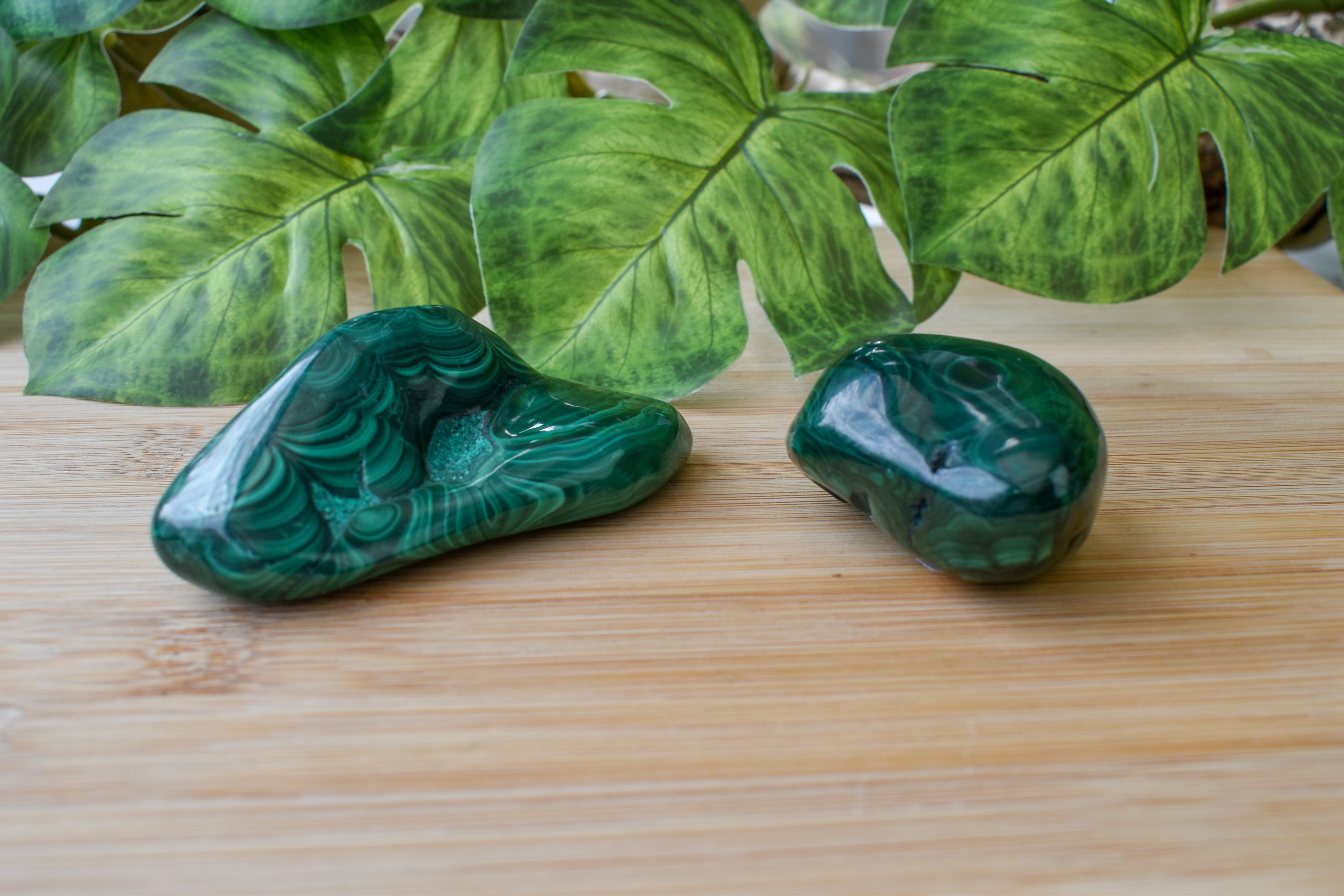 These are gorgeous high-grade polished Malachite freeform pieces, showcasing the stone’s signature rich green hues and striking banded patterns. Each piece is uniquely shaped and polished to a smooth, glossy finish, making it a stunning addition to any crystal collection, display, or meditation space.