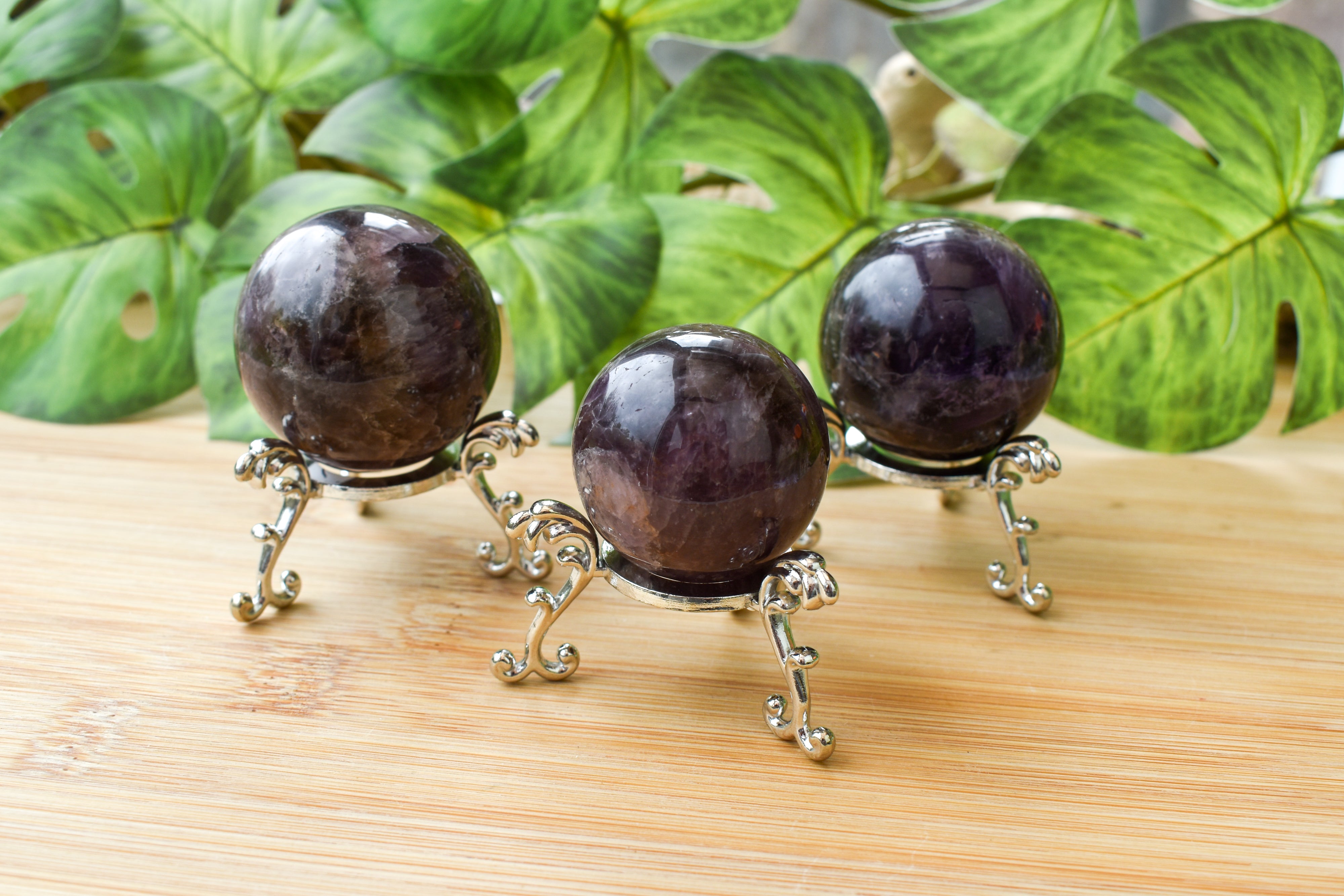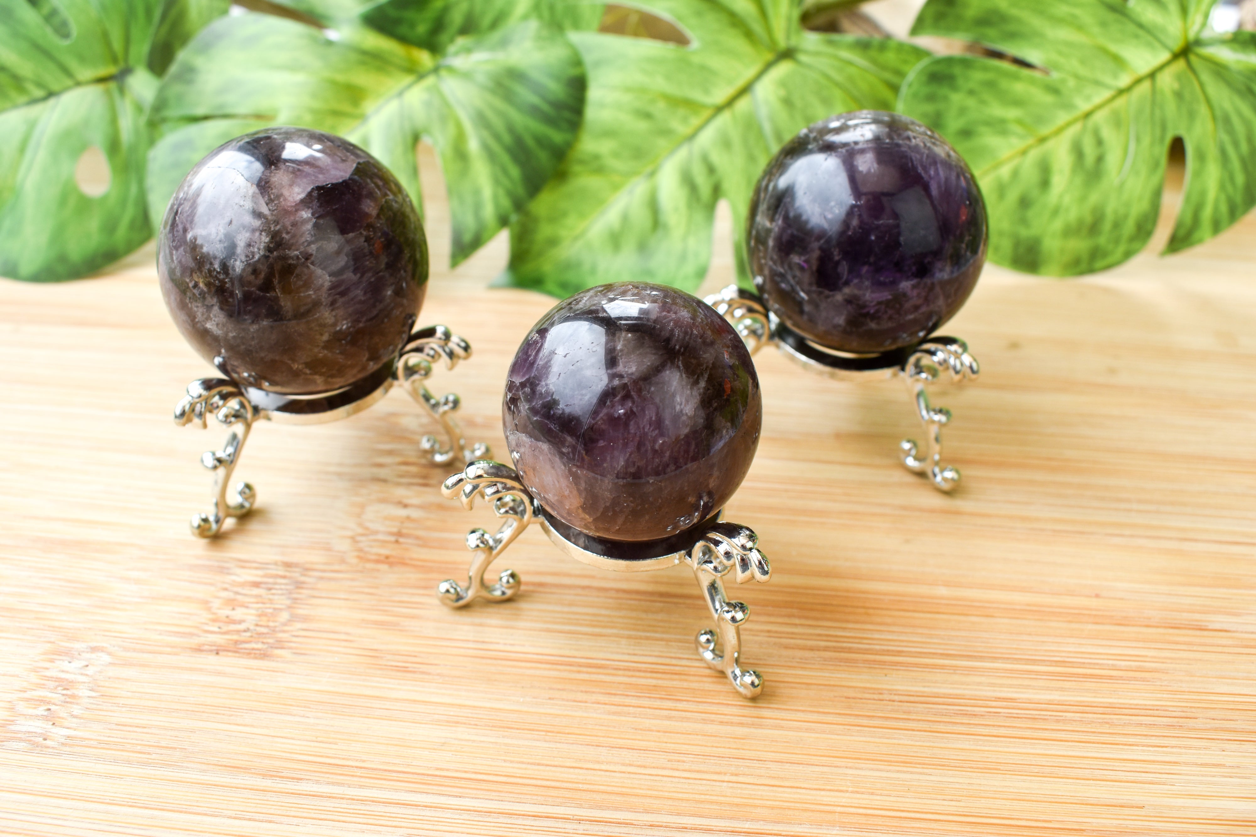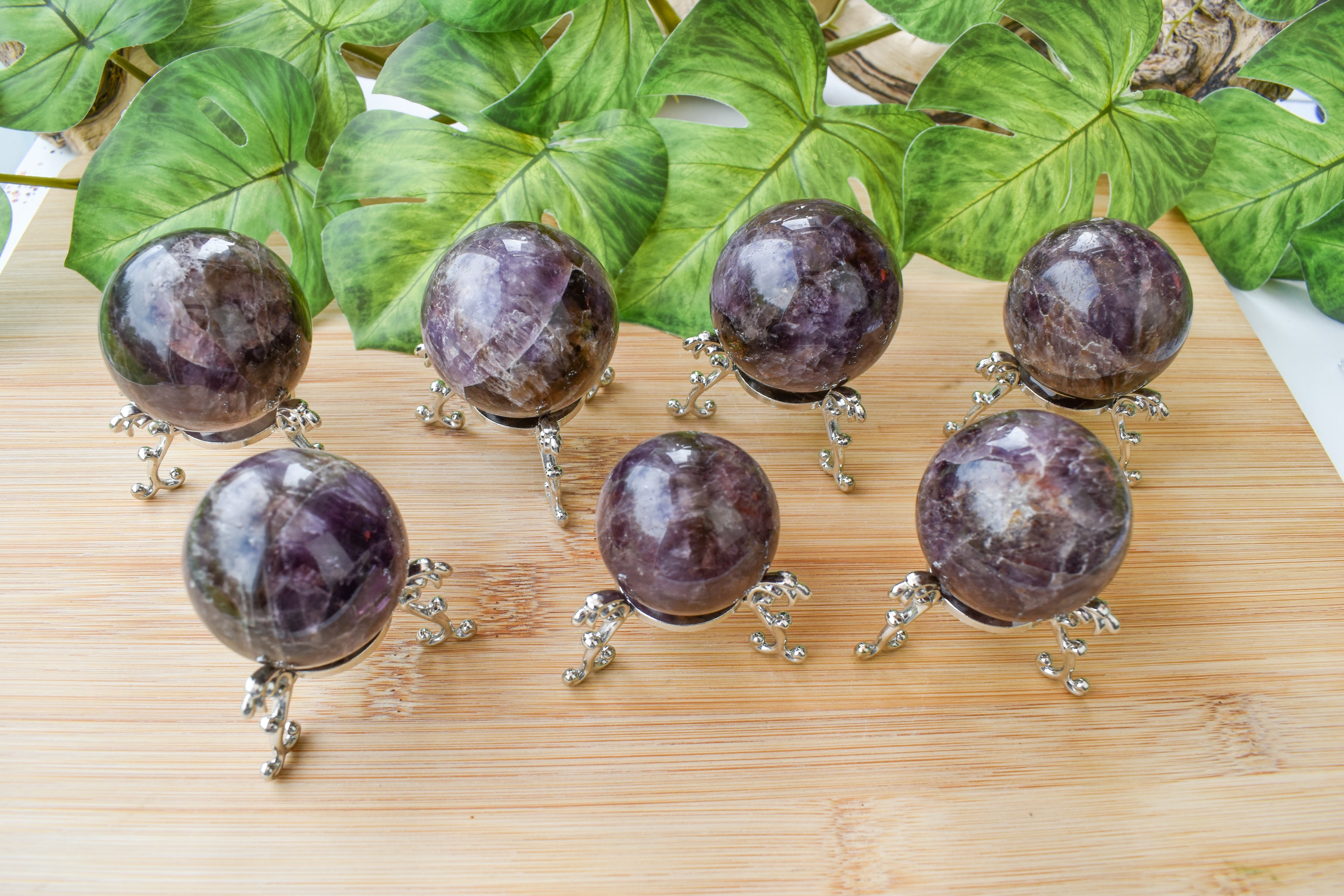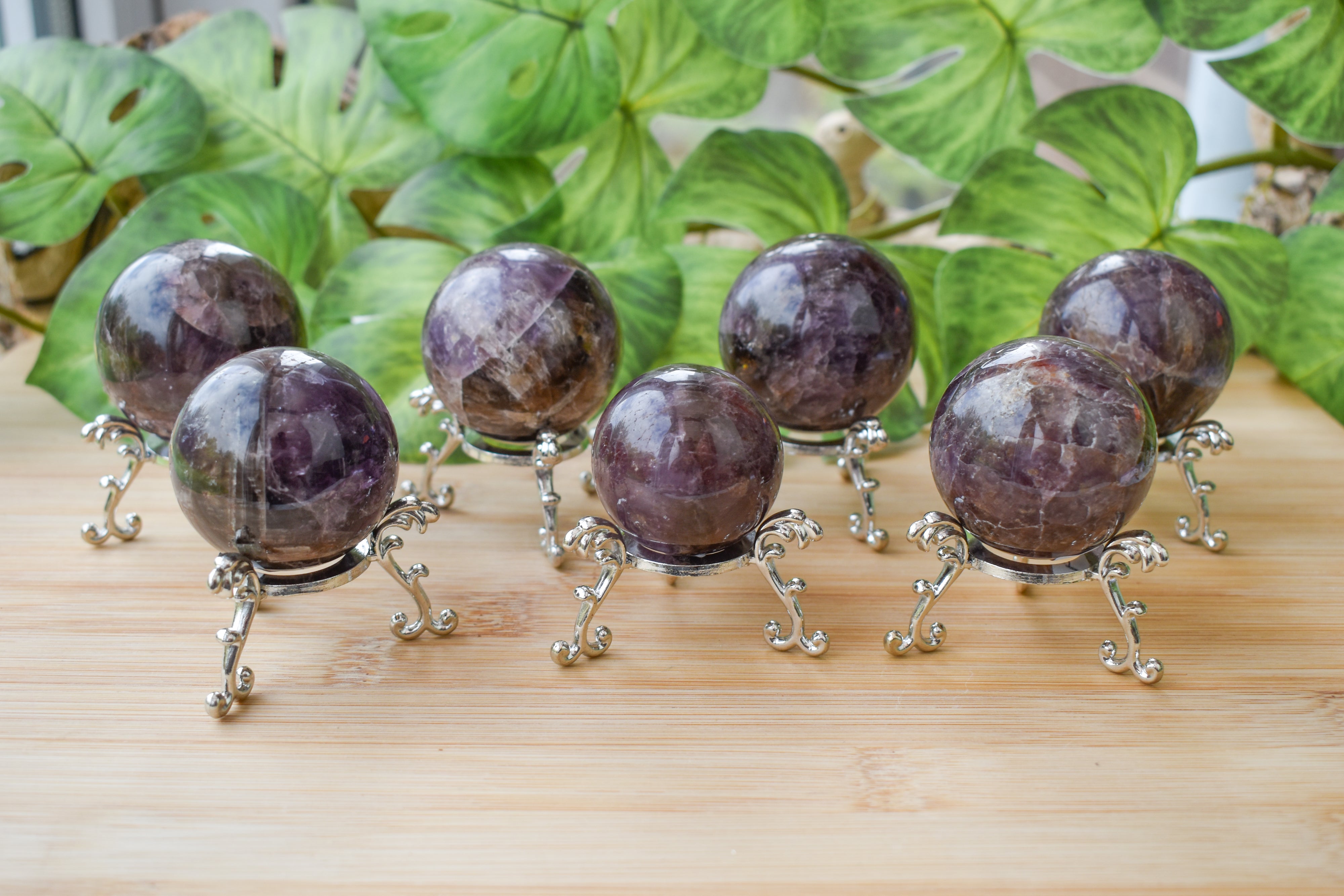 These are stunning Grade A, Super Seven spheres sourced from Brazil. The spheres are all very high quality with beautiful patterns and colouring typical of this rare crystal combination stone.