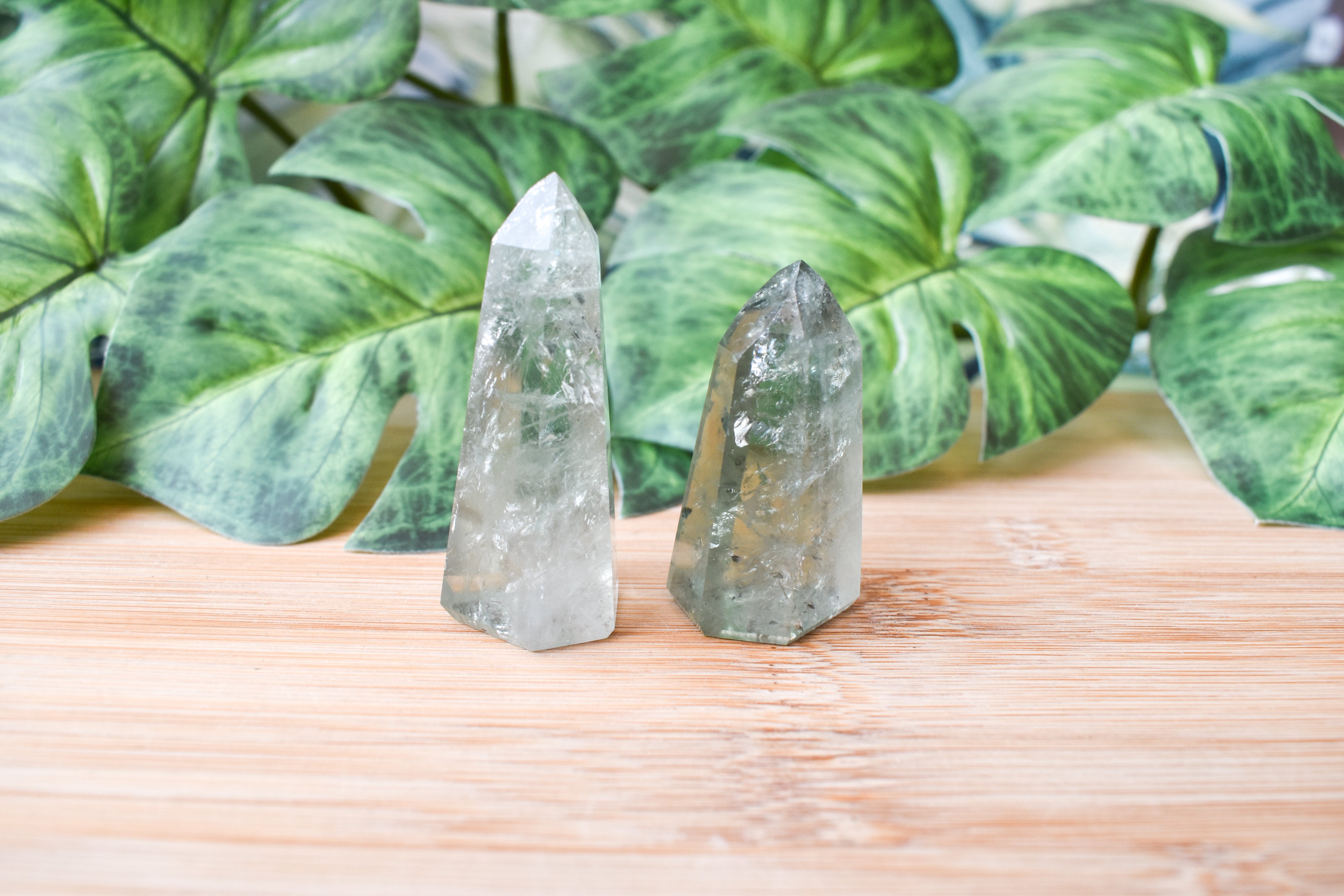 These are beautiful high-grade Prasiolite (Green Amethyst) crystal towers, displaying soft, serene shades of pale green that shimmer gently in the light. Each tower is polished to perfection, showcasing the natural clarity and calming energy of this rare and uplifting crystal. A stunning addition to any crystal collection, meditation space, or home décor.