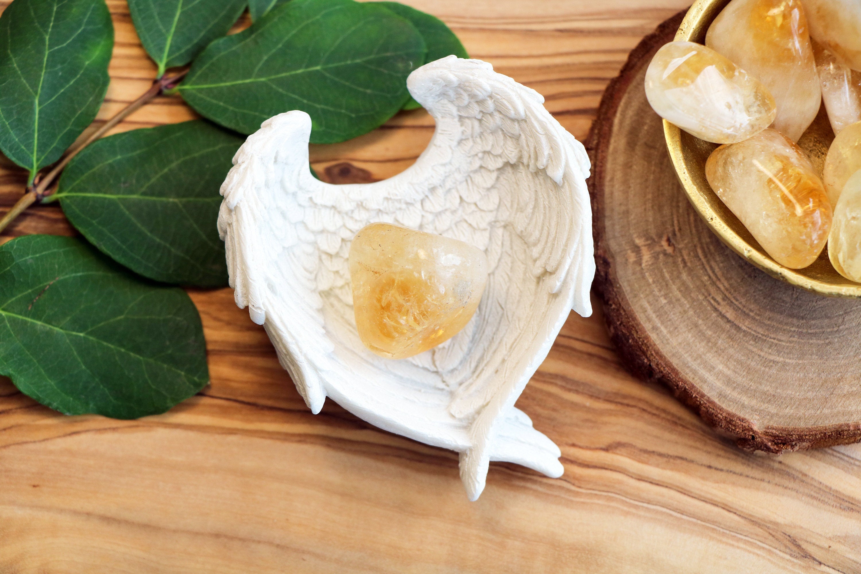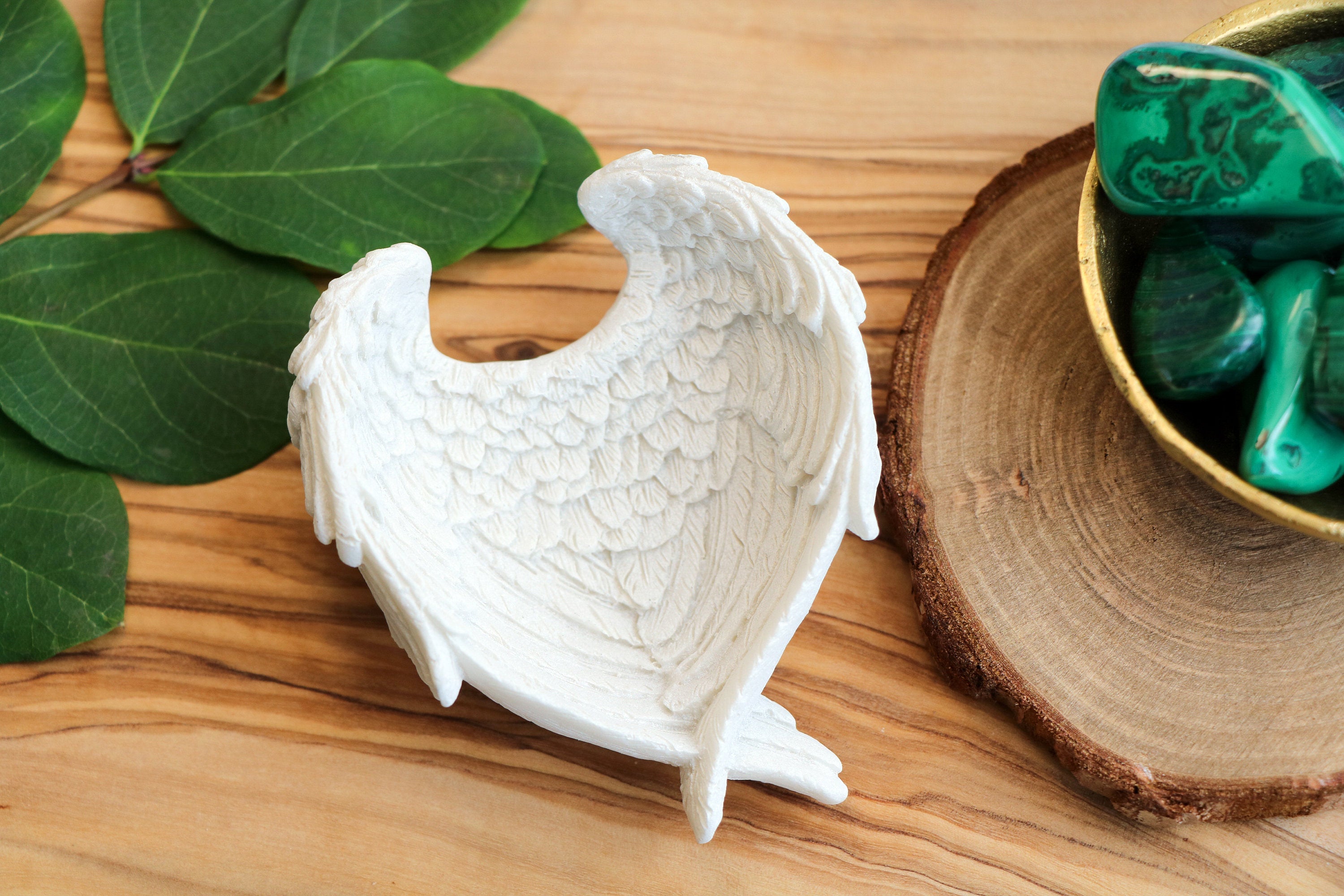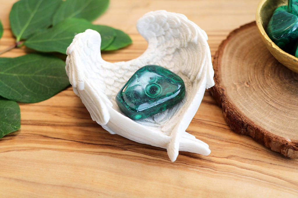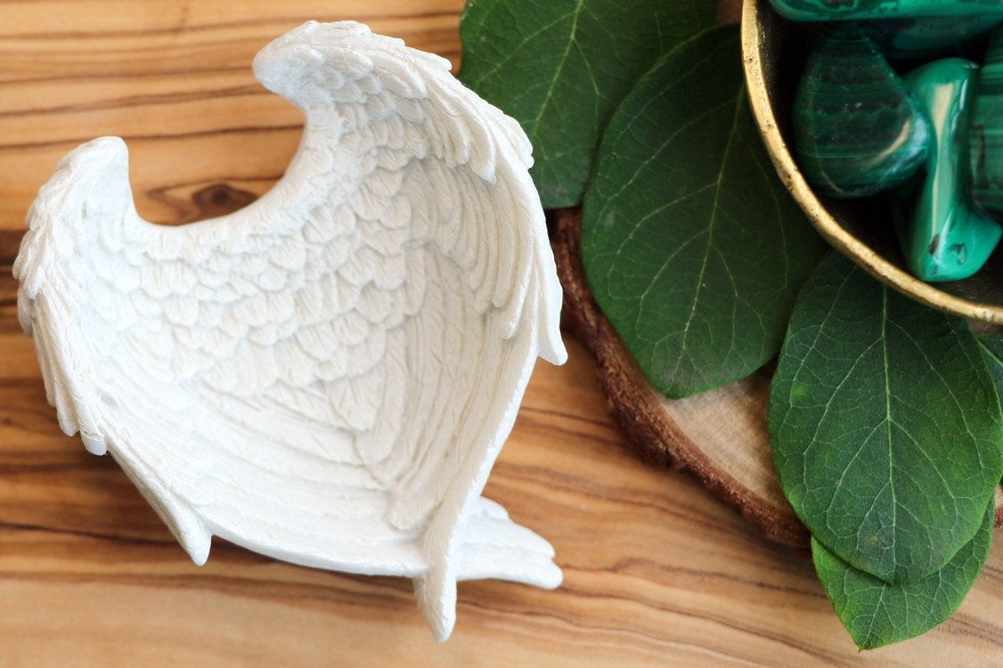 A beautiful angel wing trinket dish, that is the perfect size to cradle tumble stones. These beautiful little dishes are perfect for holding a single crystal, a small number of tumble stones or even crystal carvings, such as Rose Quartz hearts etc.