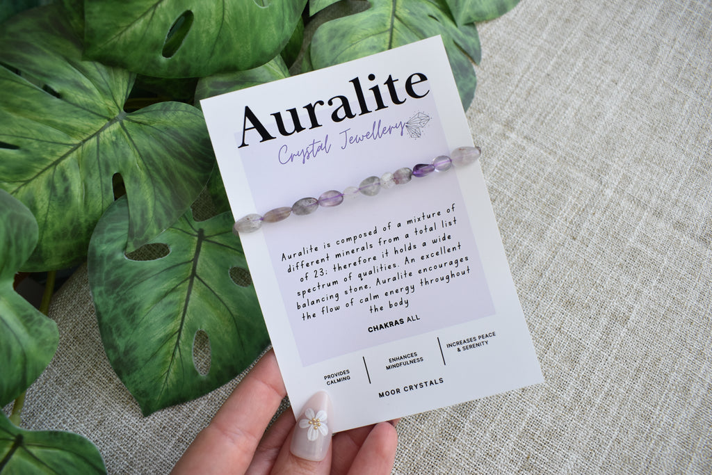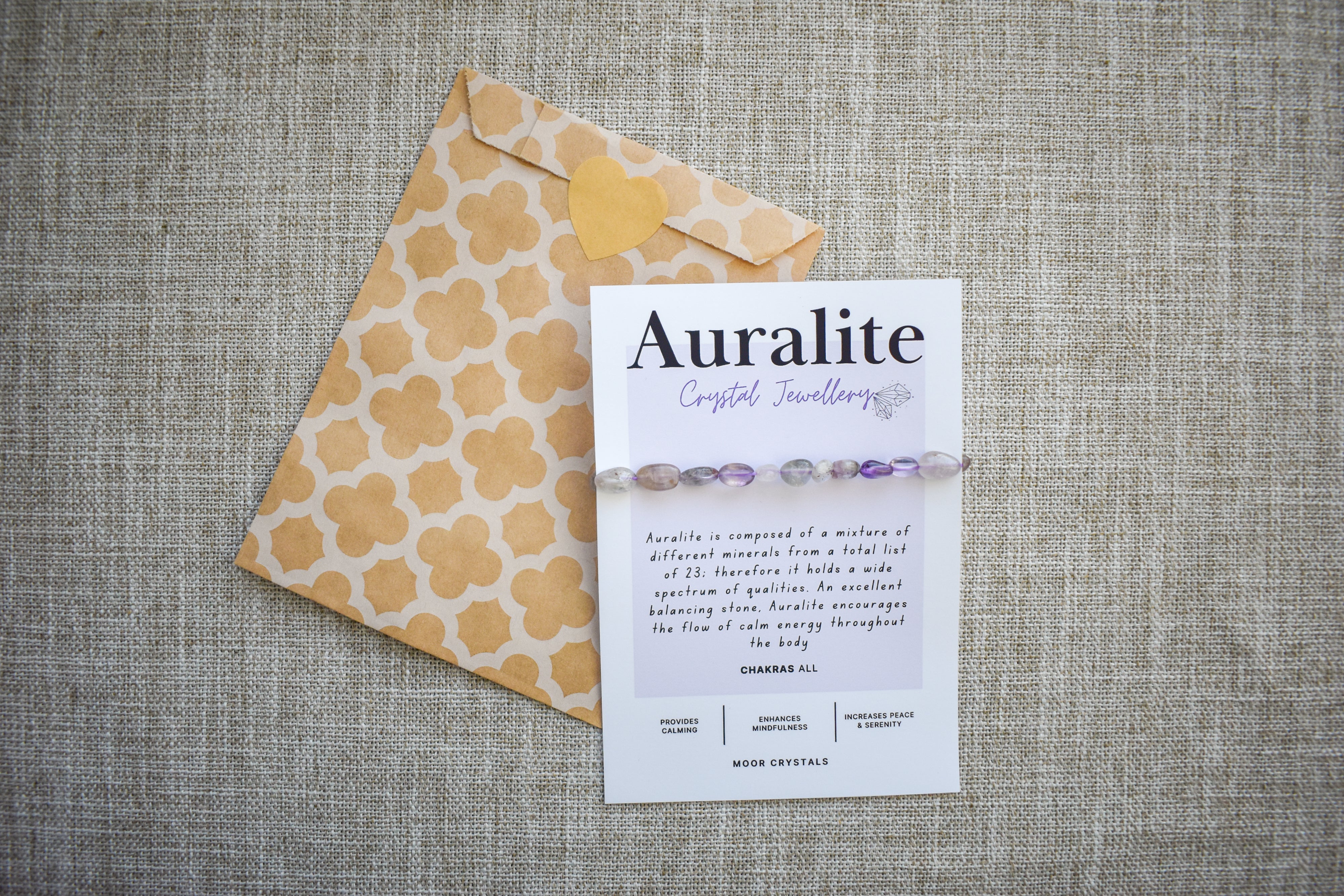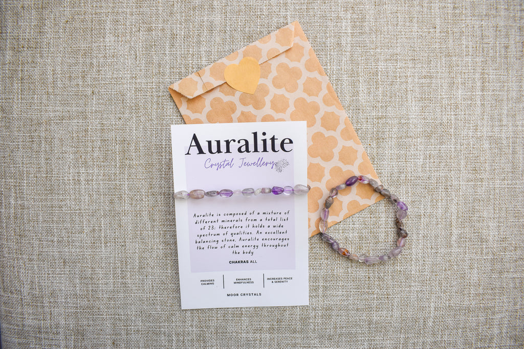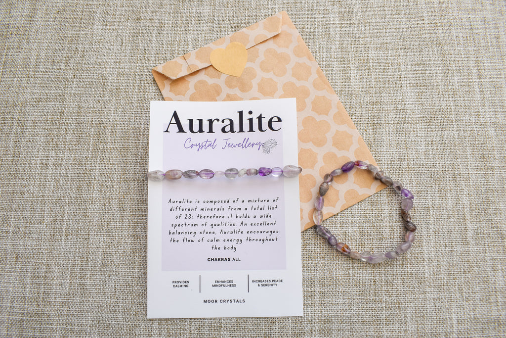 Auralite crystal nugget bracelet beautifully on stretch cord, designed to fit any wrist size. The bracelet is presented on a unique crystal description card with information on this lovely crystal.