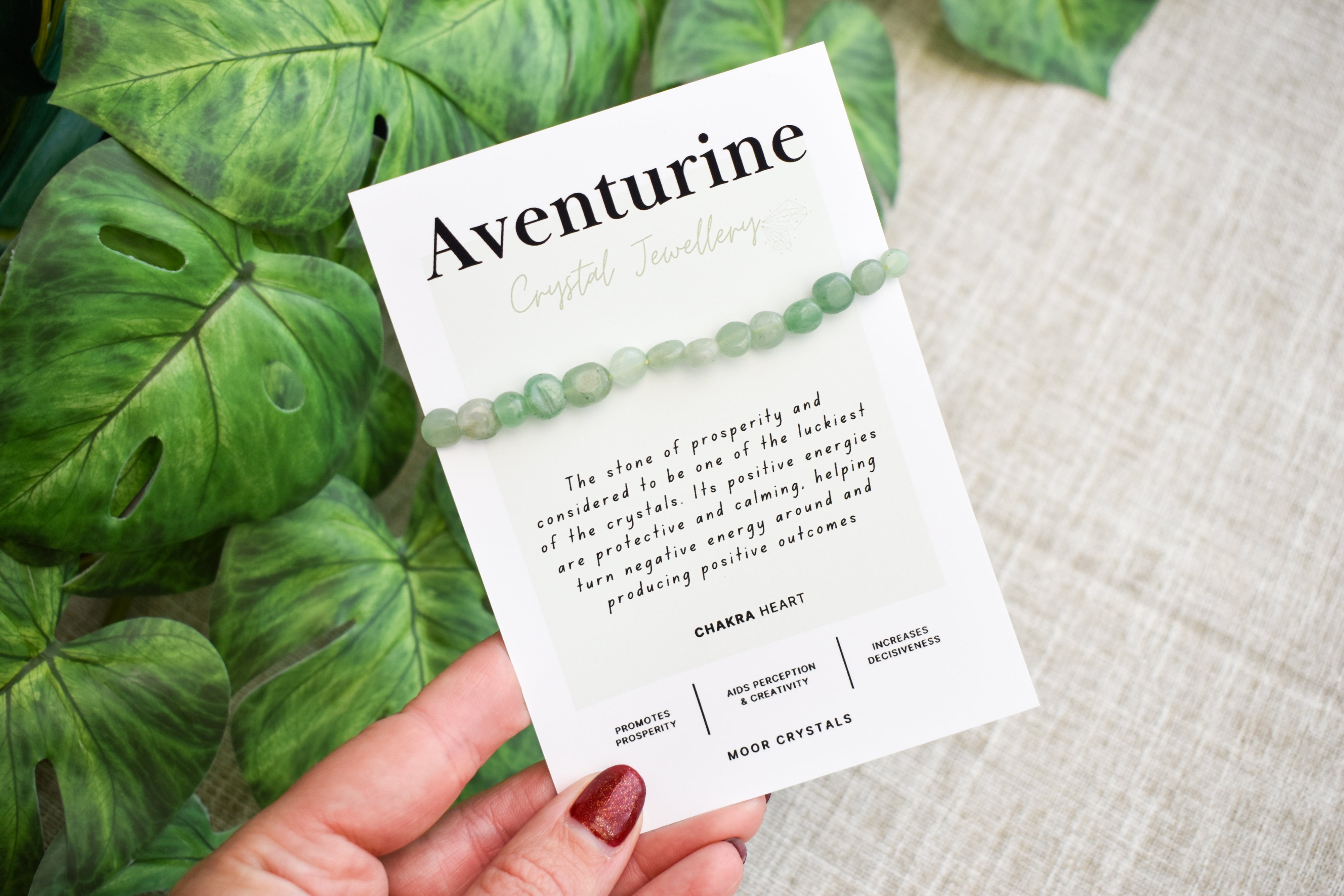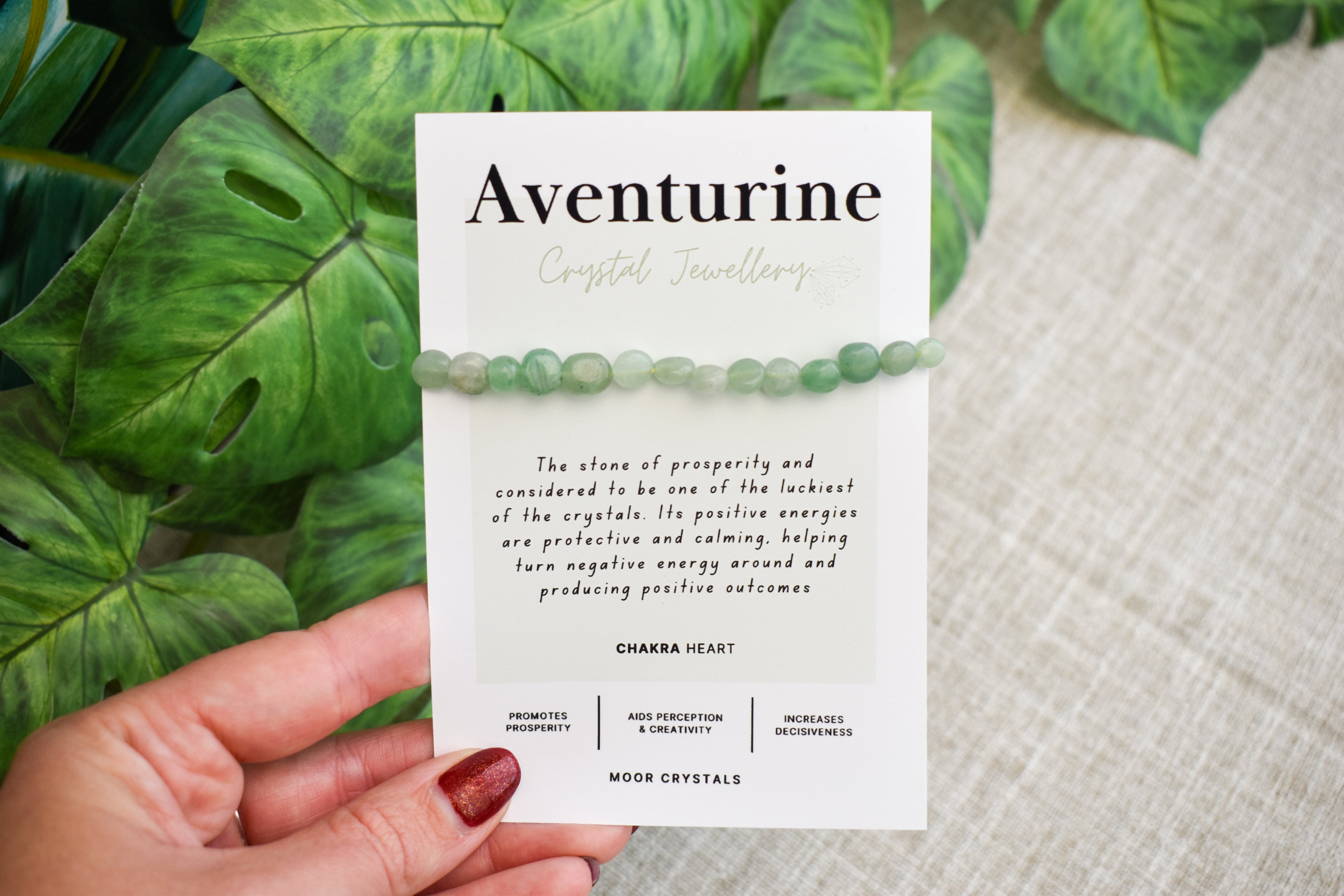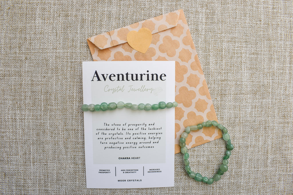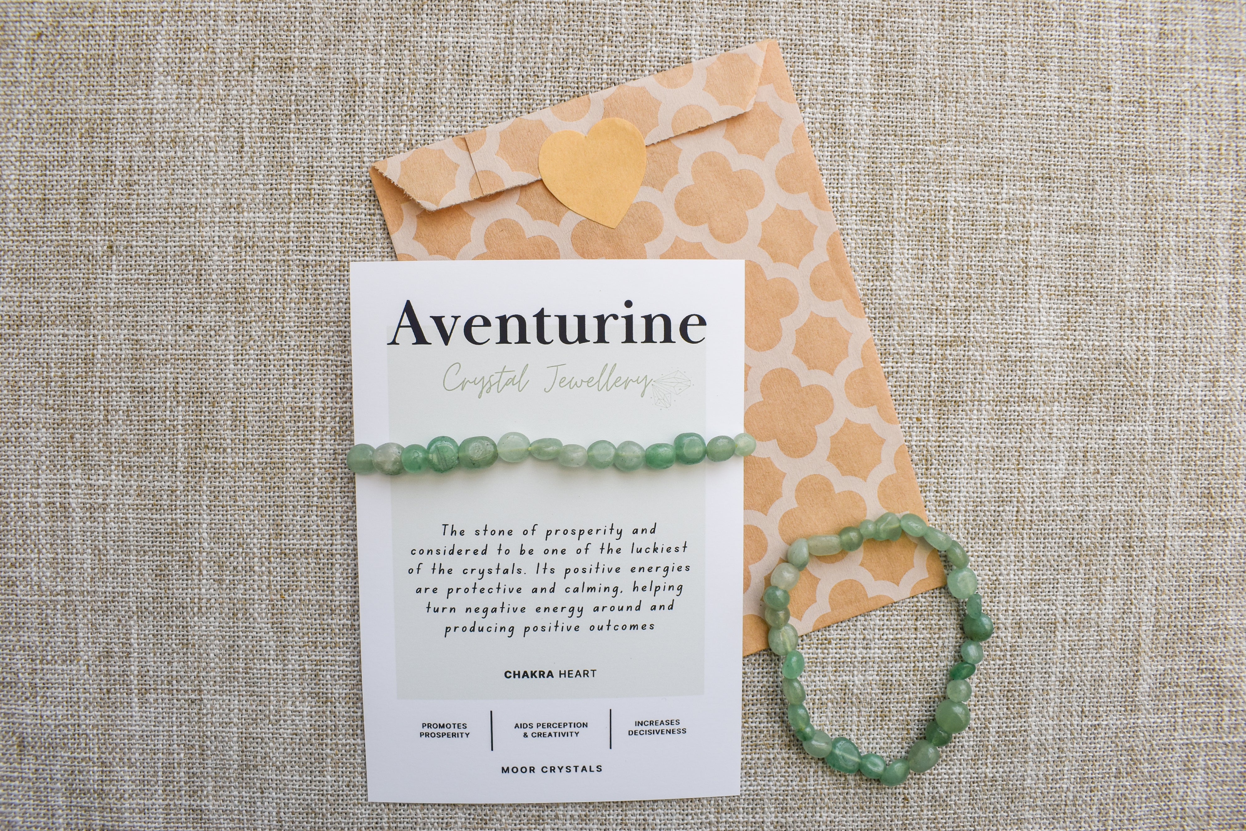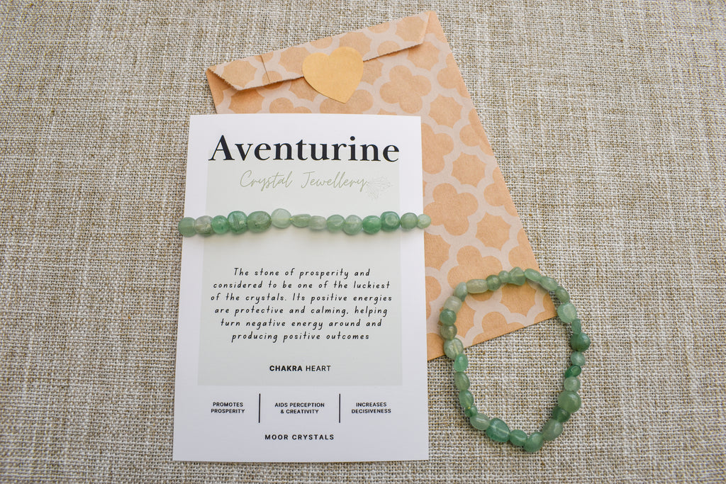 Aventurine crystal nugget bracelet beautifully on stretch cord, designed to fit any wrist size. The bracelet is presented on a unique crystal description card with information on this lovely crystal.