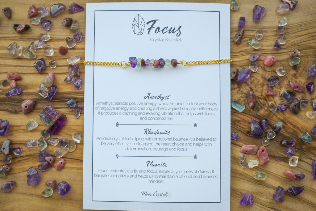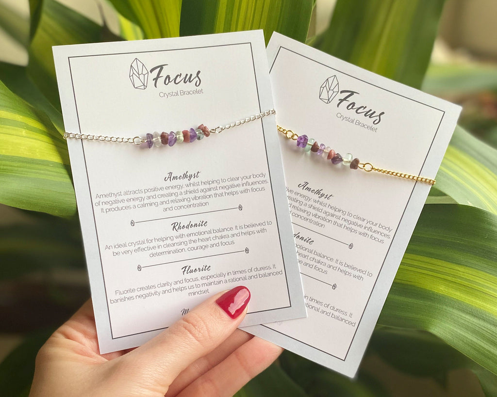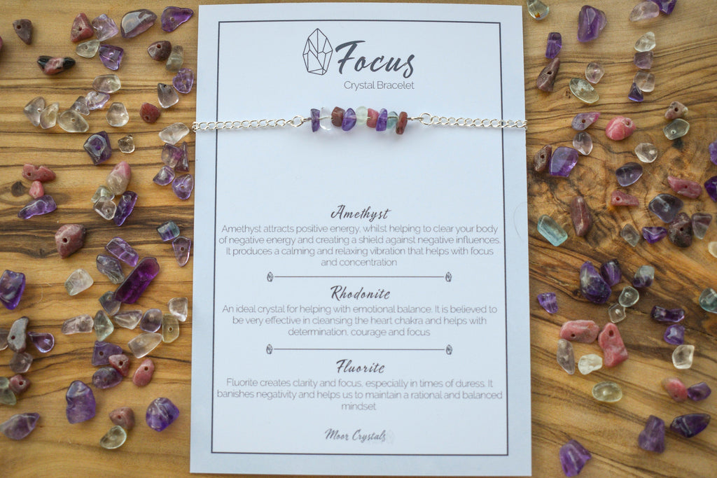 This handmade crystal bracelet is made up of unique crystals especially selected for their properties in helping to clear negativity and aide focus. Ideal for someone in a high pressure situation, studying or needing support in reducing distractions.