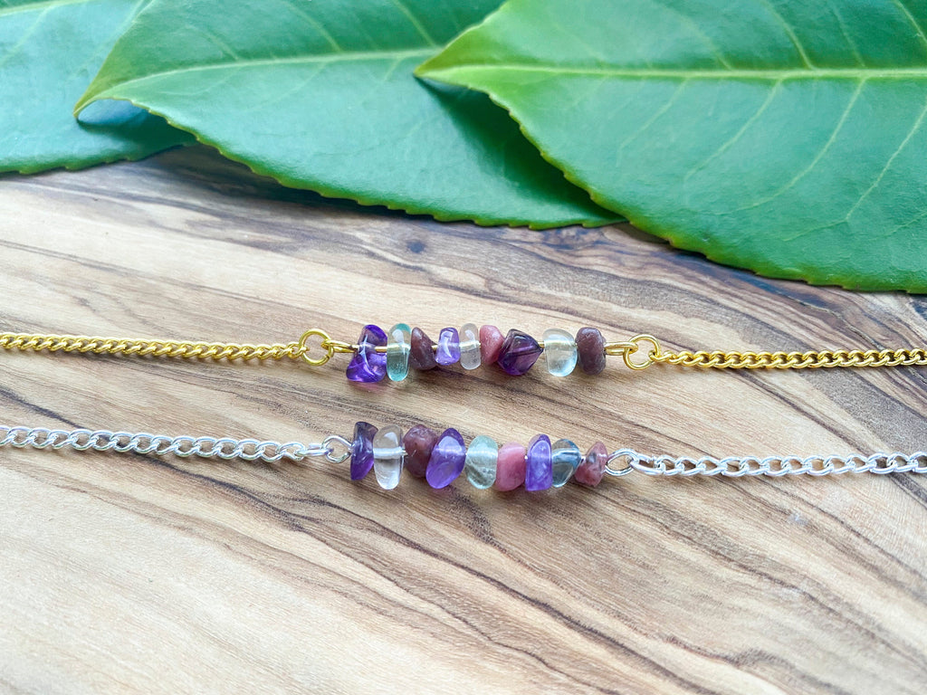 The crystals used in this bracelet are Rhodonite, Amethyst and Fluorite. These are some of the most effective crystals for reducing negative influences and helping to provide clarity and focus.