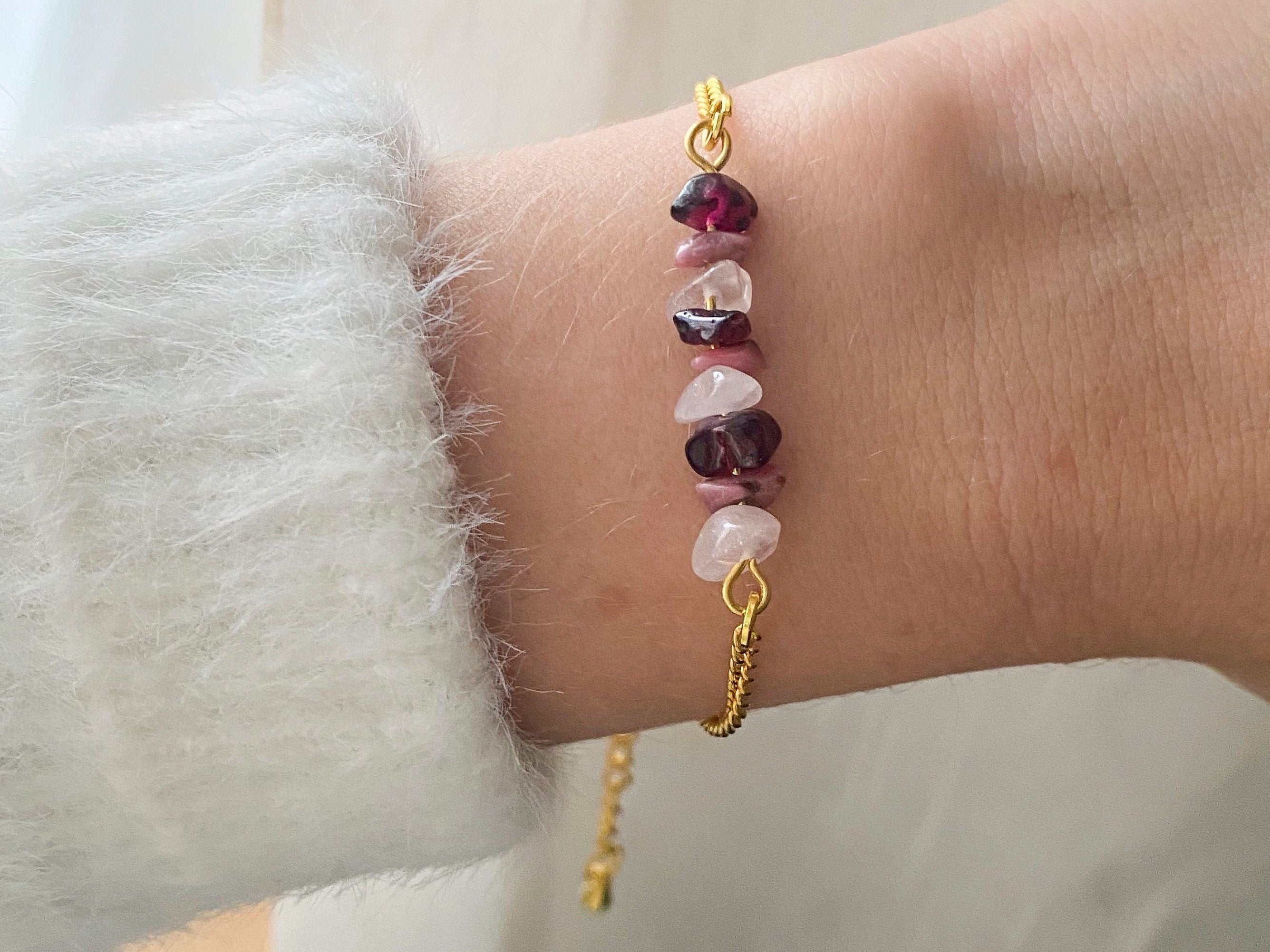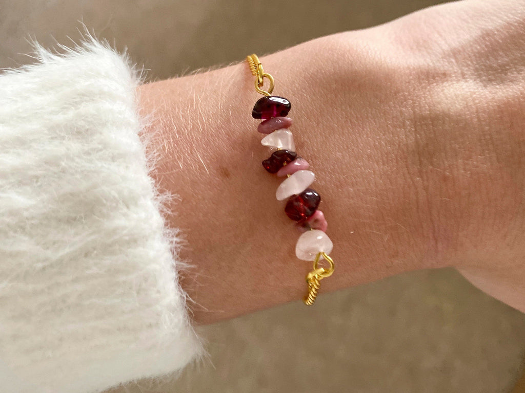 The crystals used in this bracelet are Rose Quartz, Rhodonite and Tourmaline. These crystals all have a strong association with love and compassion