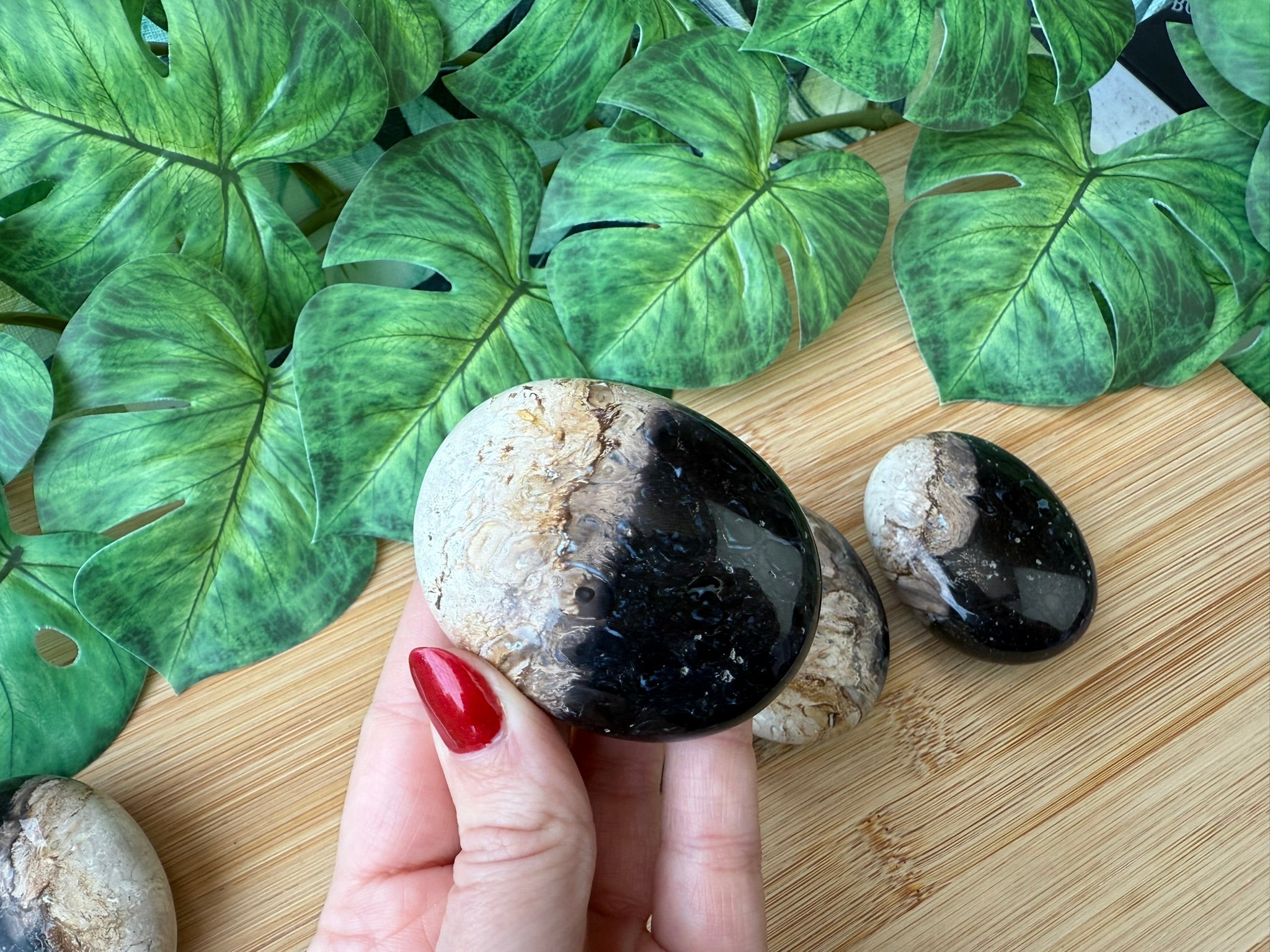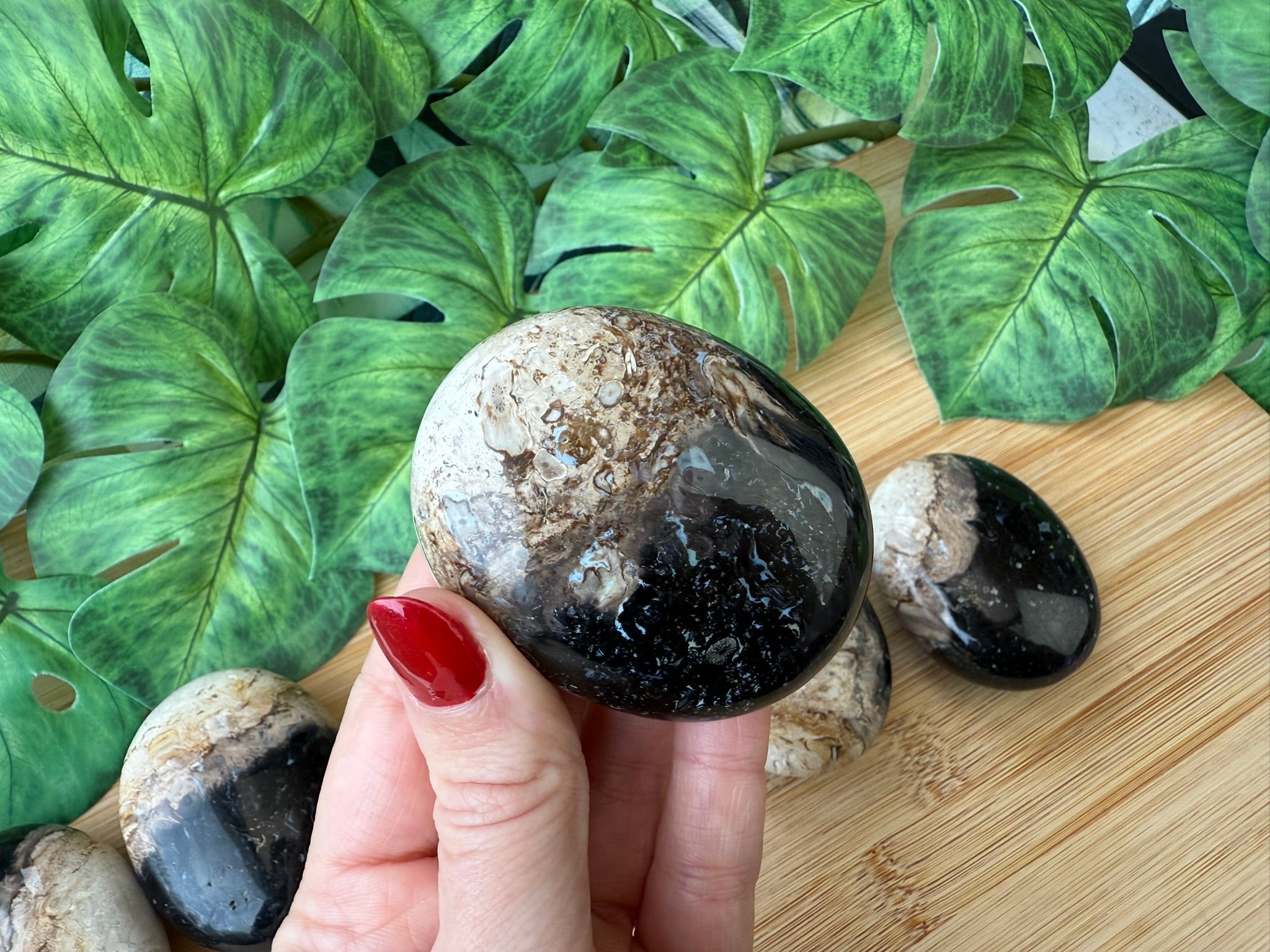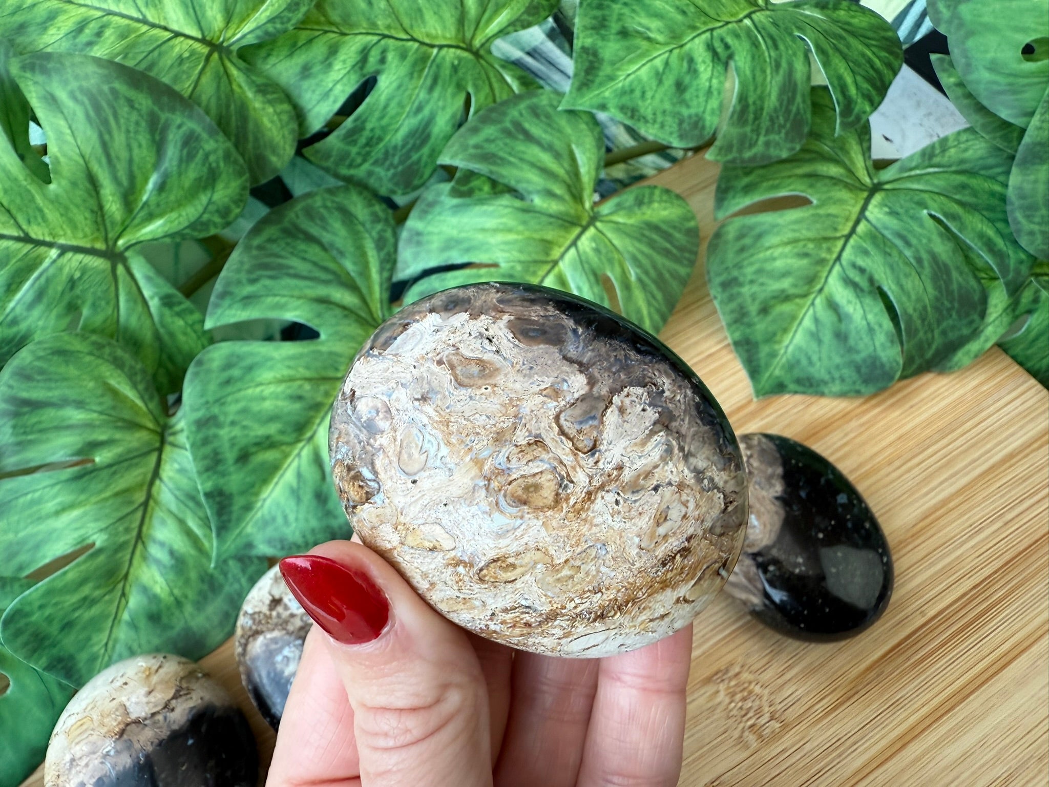 Along with your Palm Root Agate Palm Stone, you will also receive one of our helpful crystal description cards, providing information about this beautifully grounding stone.