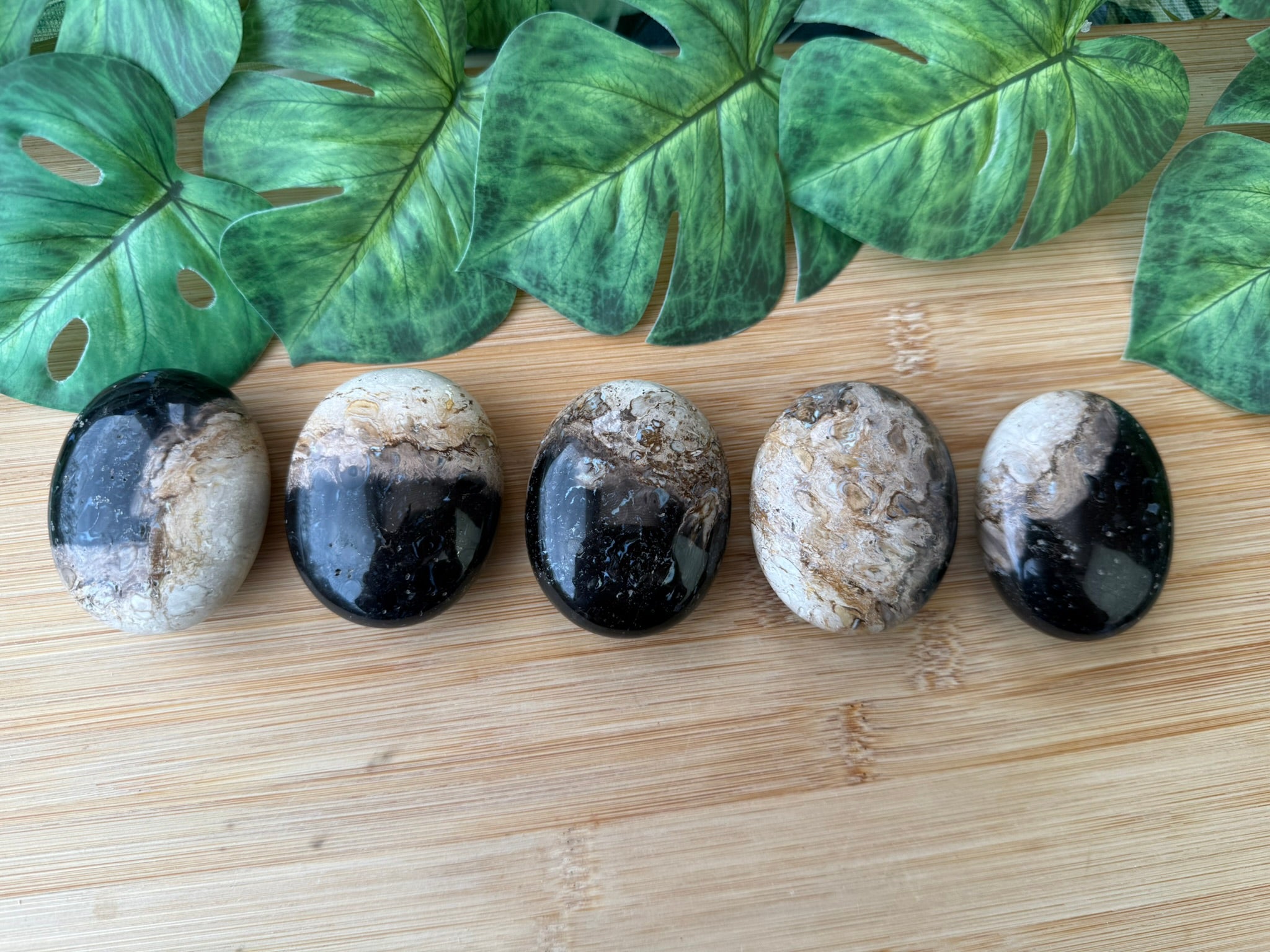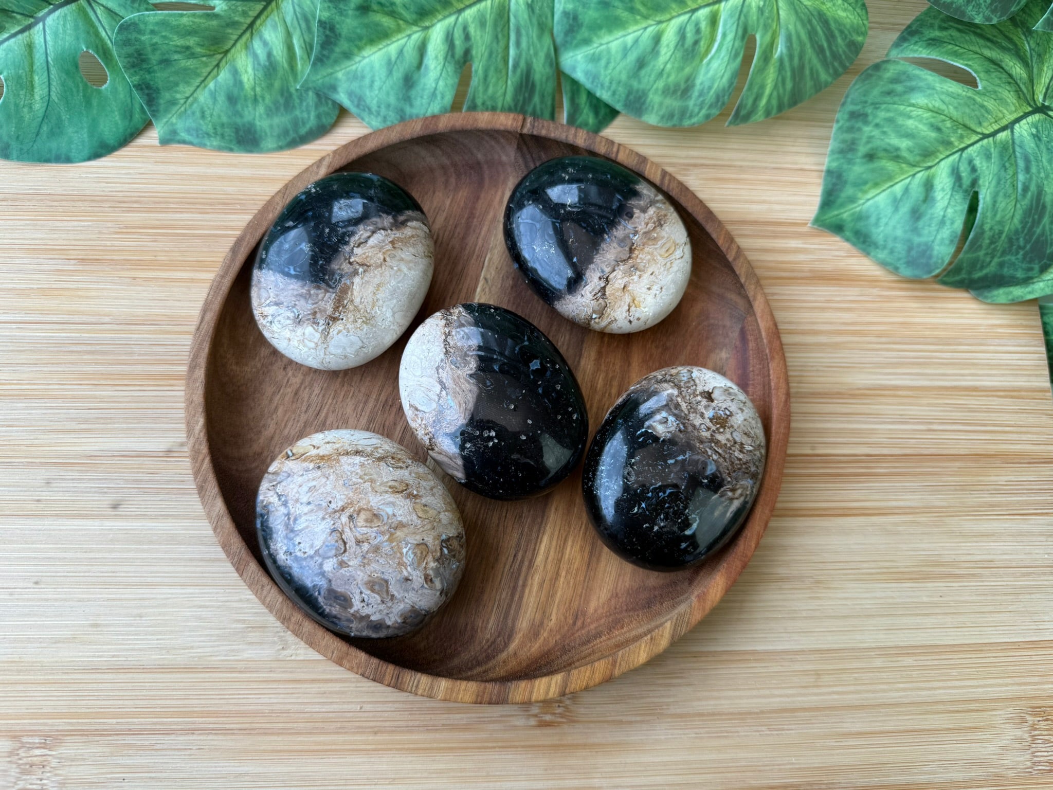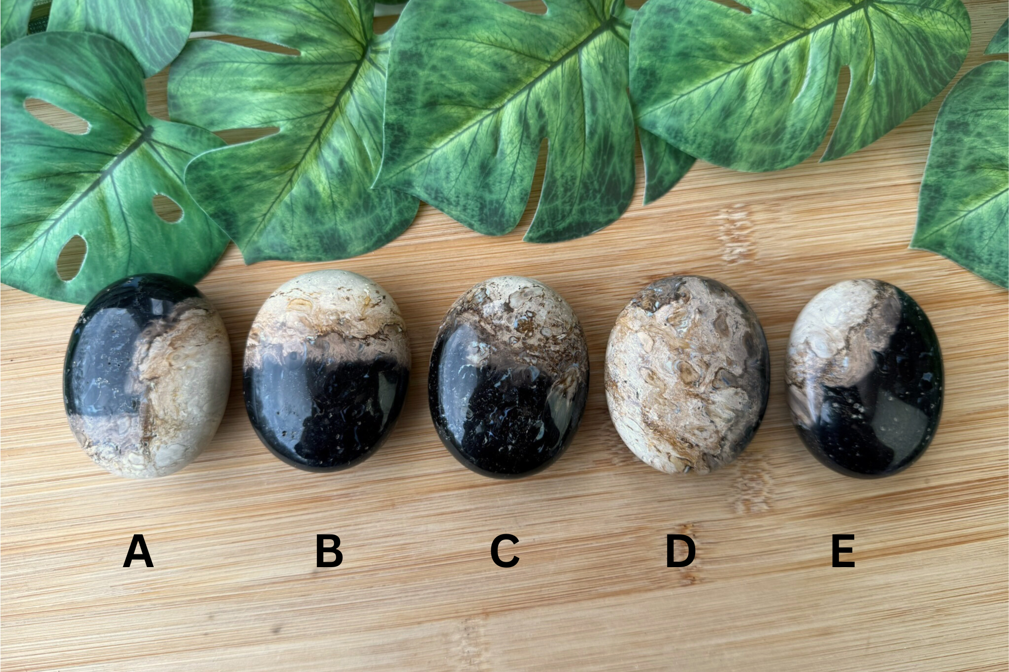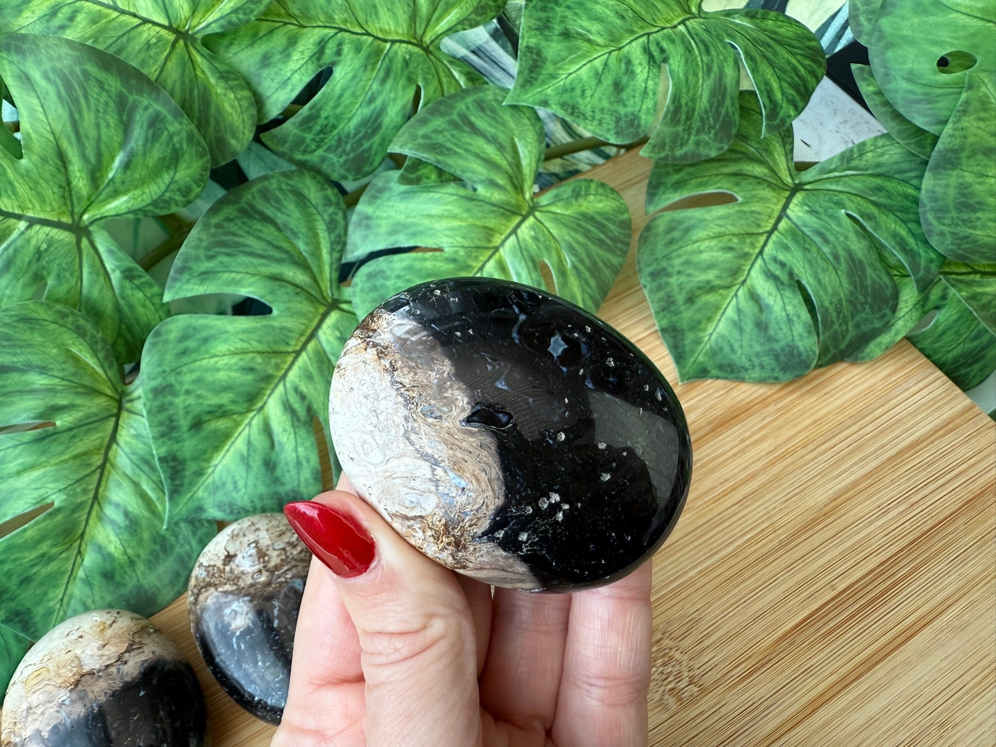 Along with your Palm Root Agate Palm Stone, you will also receive one of our helpful crystal description cards, providing information about this beautifully grounding stone.