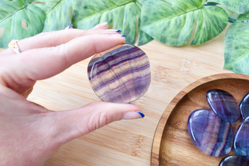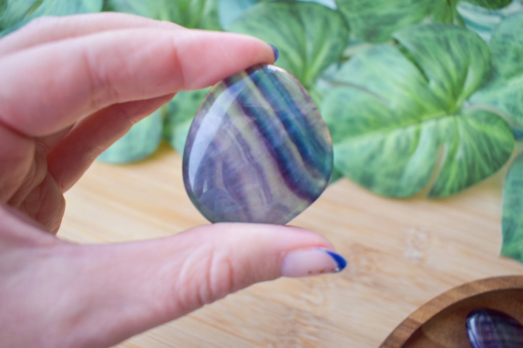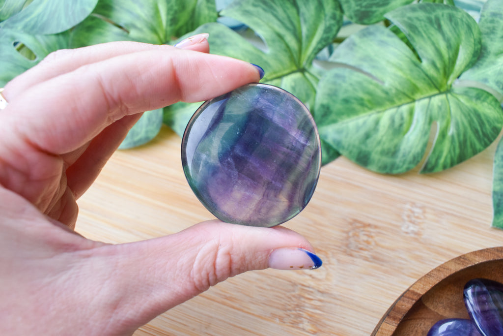 These are beautiful rainbow fluorite flat stones. They are high grade rainbow fluorite. These are available in a choice of two sizes.